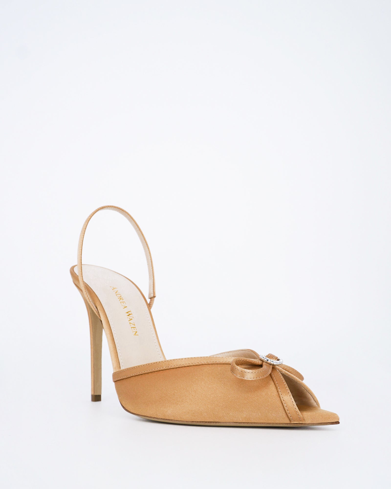 The AMIRA by Andrea Wazen is a chic 105 mm heel with an open, pointy toe design. Made entirely from satin, it features a stylish bow on the upper with a crystal buckle, and a slingback strap for a secure fit. This elegant style effortlessly blends comfort and glamour.