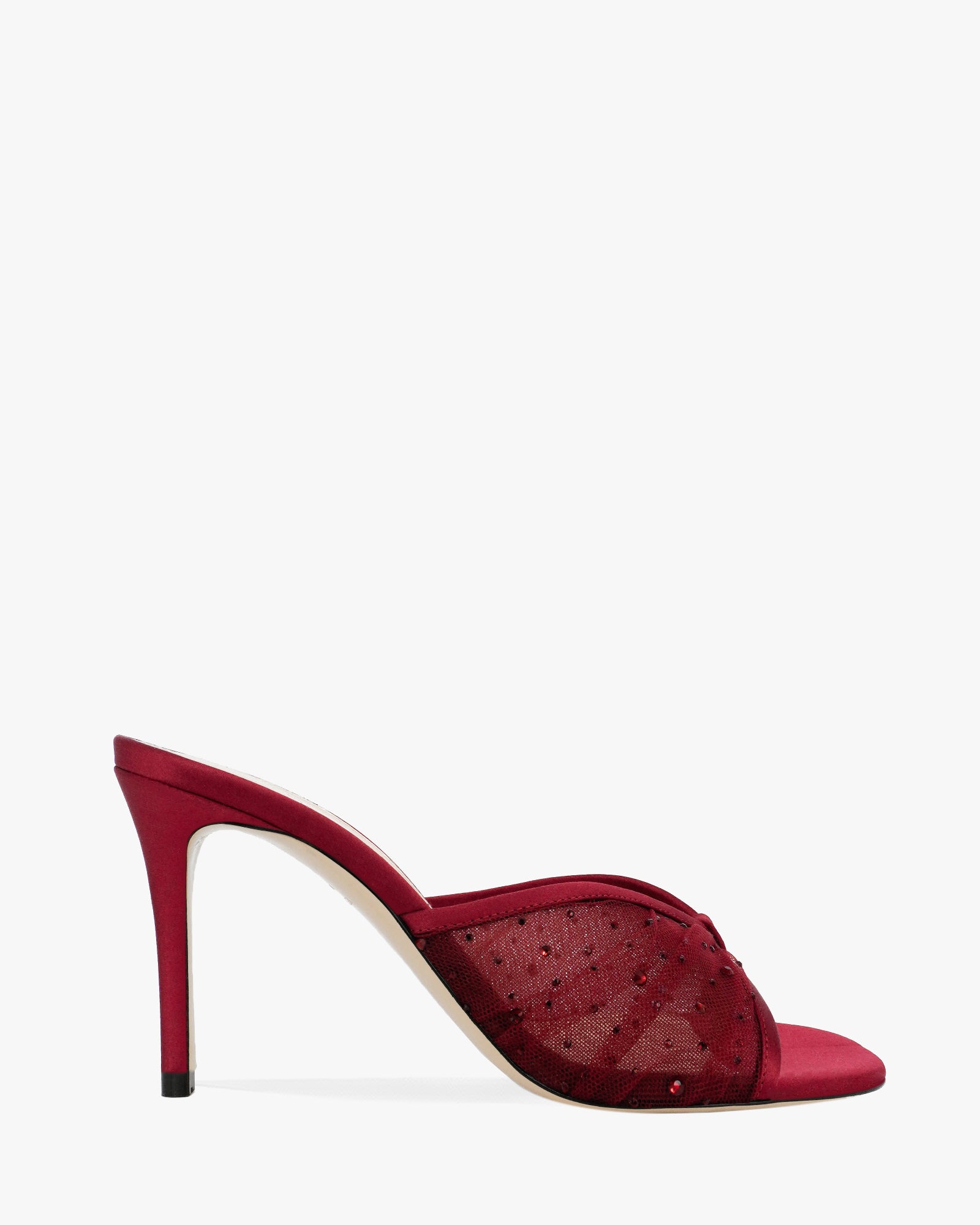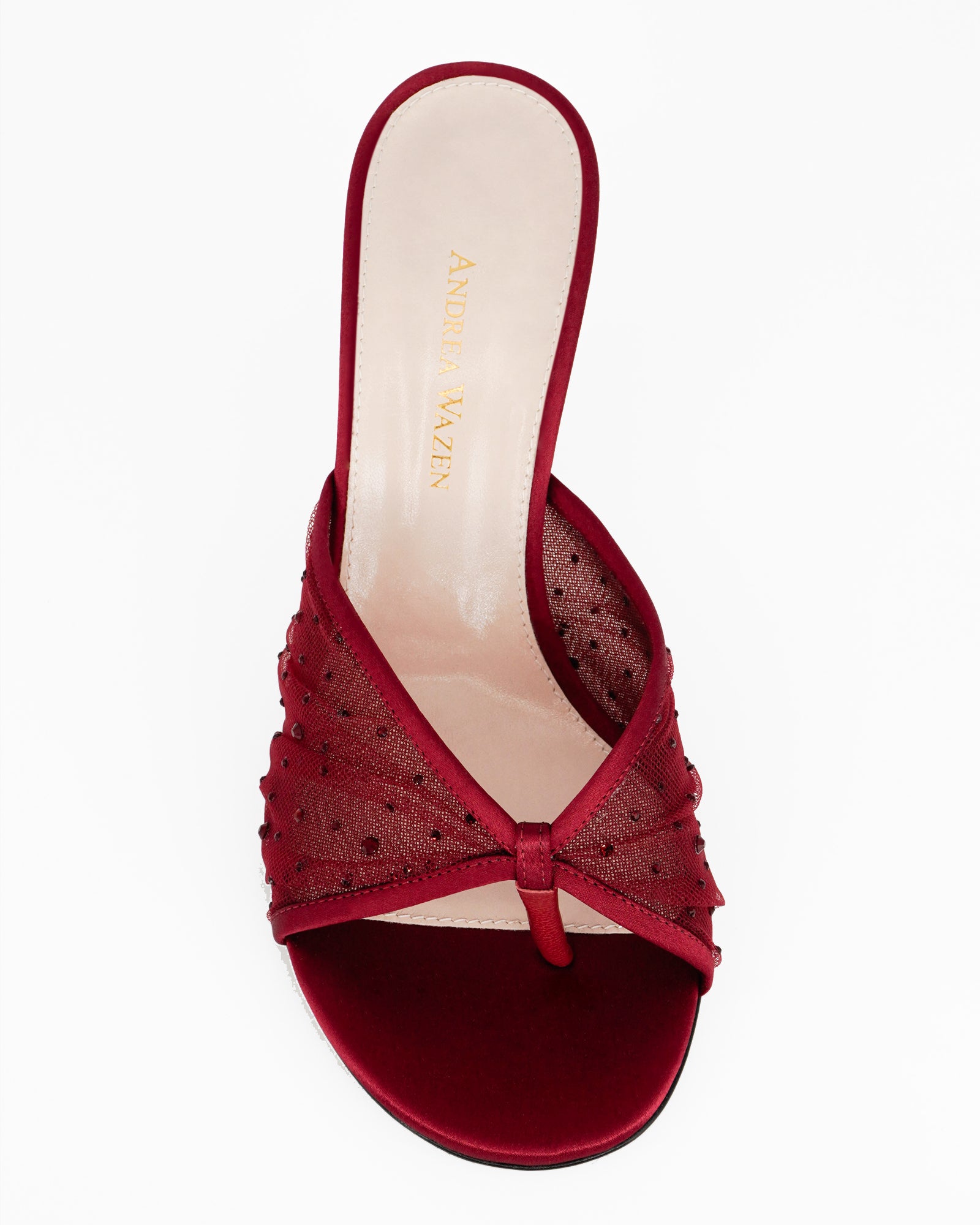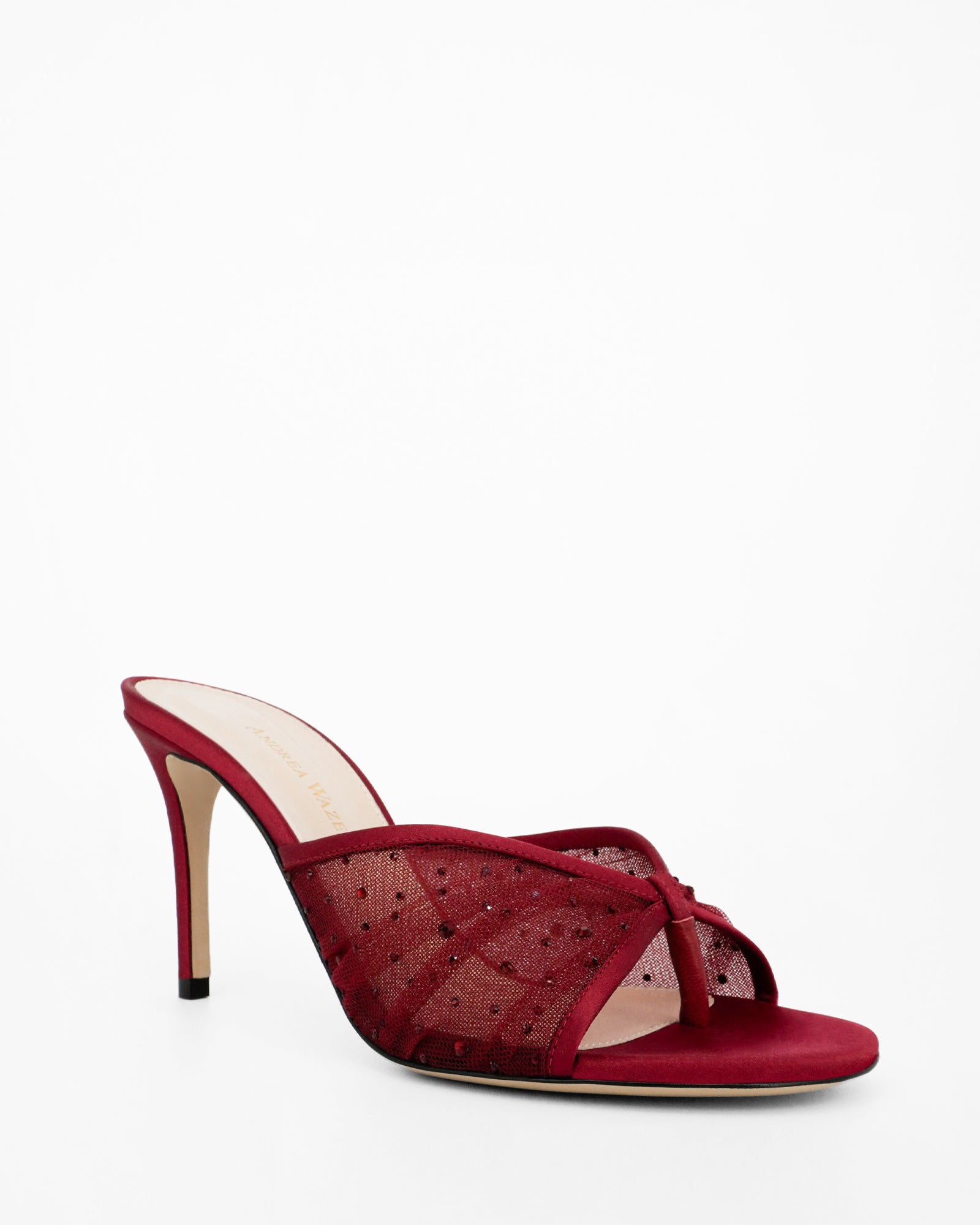 The Astrid mule by Andrea Wazen is a refined expression of modern elegance. Designed with a sleek round open-toe silhouette, the style features a sculpted stiletto heel, with tulle embellished in crystals. Finished in a rich, feminine tone, Astrid strikes the perfect balance between sensuality and sophistication, making it an ideal choice for evening wear, special occasions, or elevated day-to-night looks.