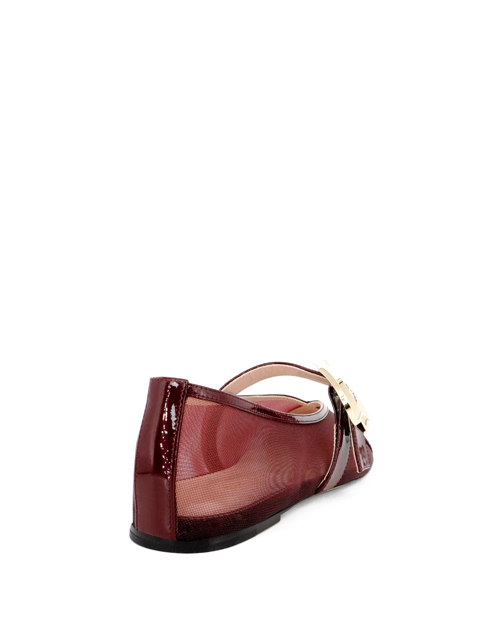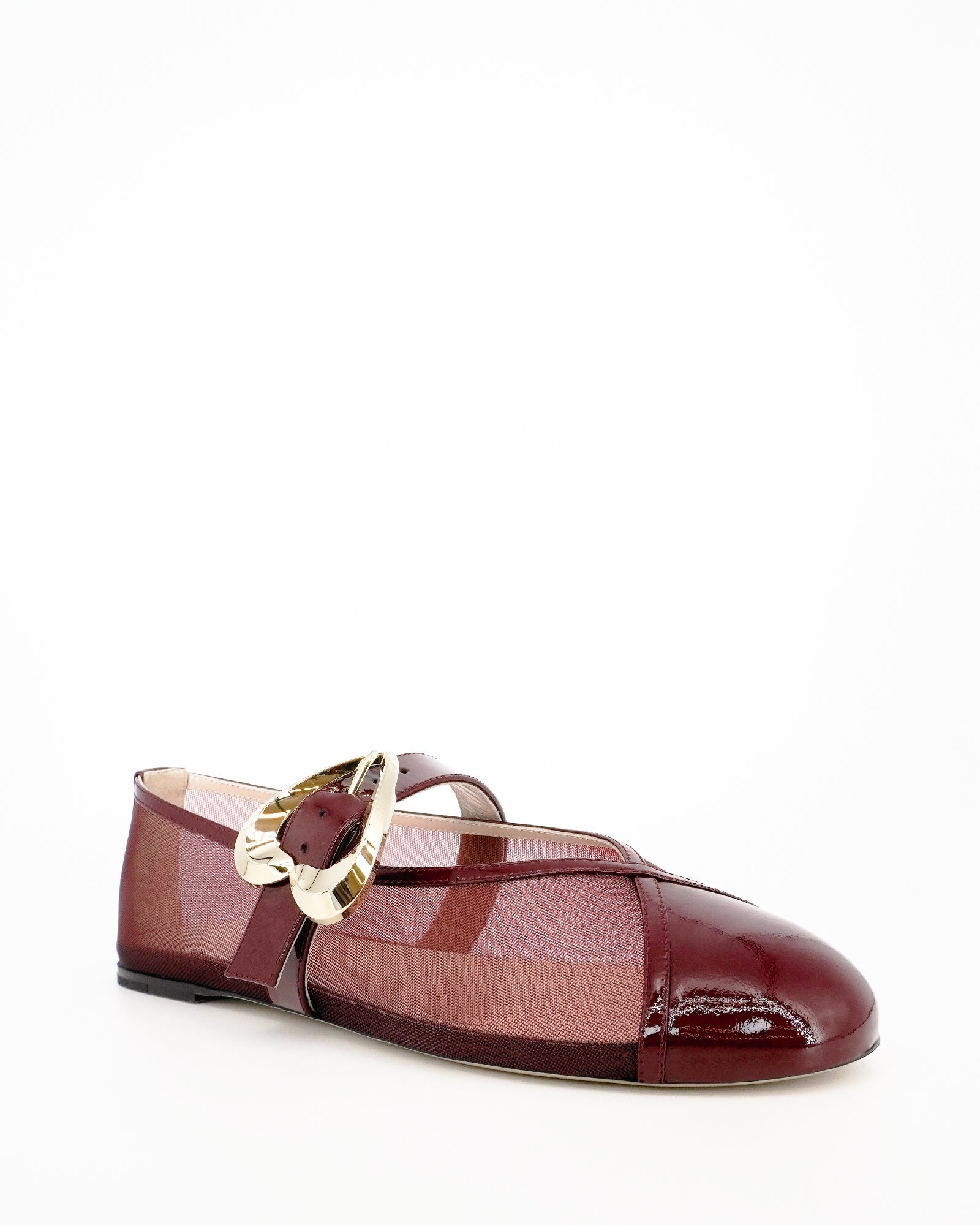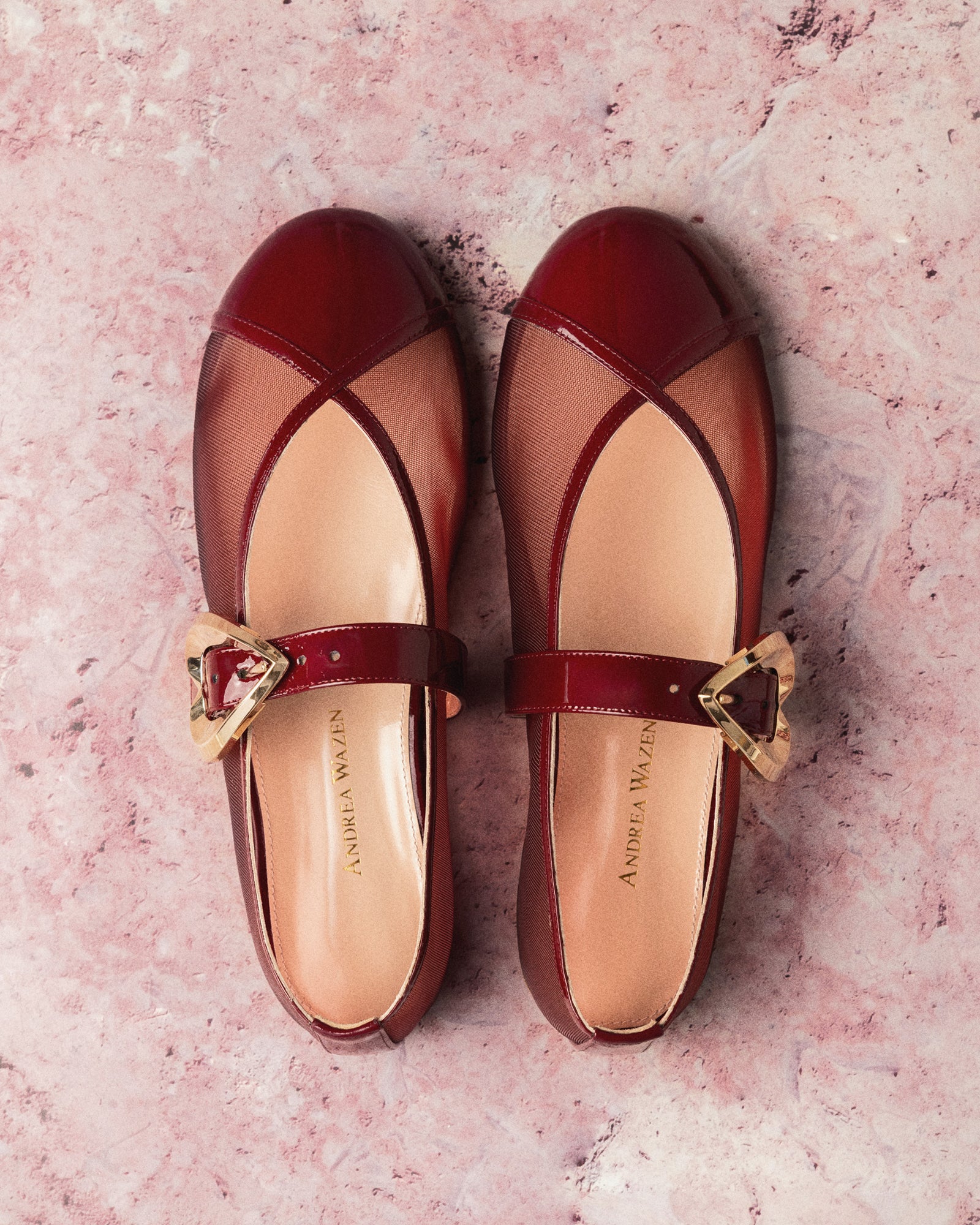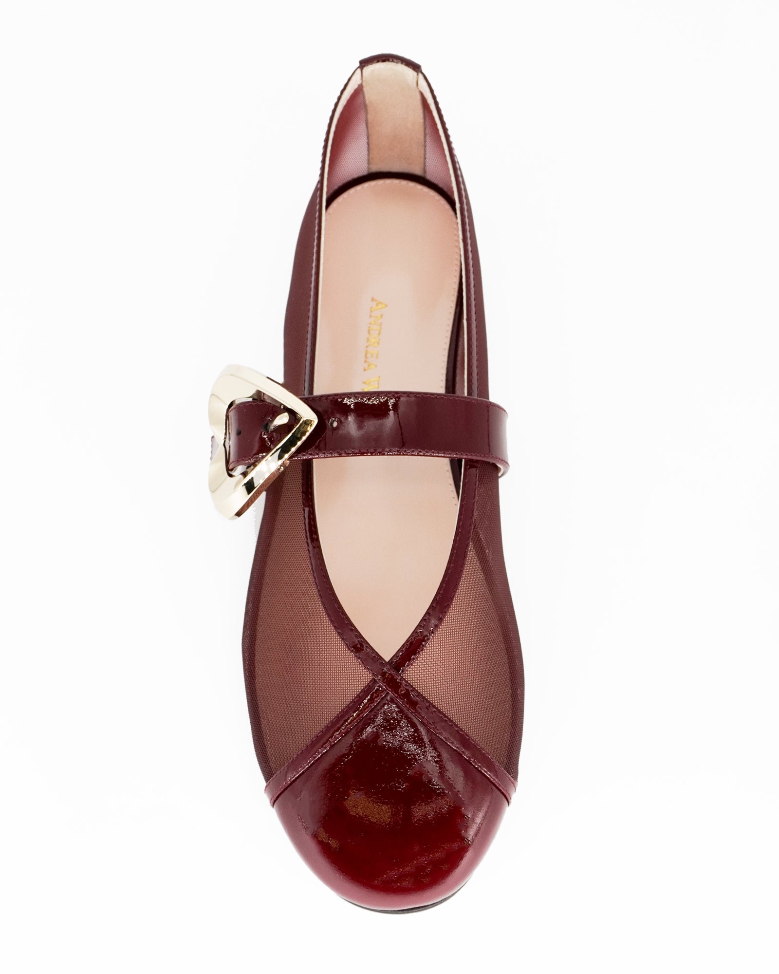 The Barbara Ballerina in mesh is a modern take on a classic flat. Crafted from glossy patent leather and see-through mesh, it blends structure with lightness for a sleek, feminine look. Finished with the signature AW heart buckle, it’s a bold yet wearable style made for day or night.