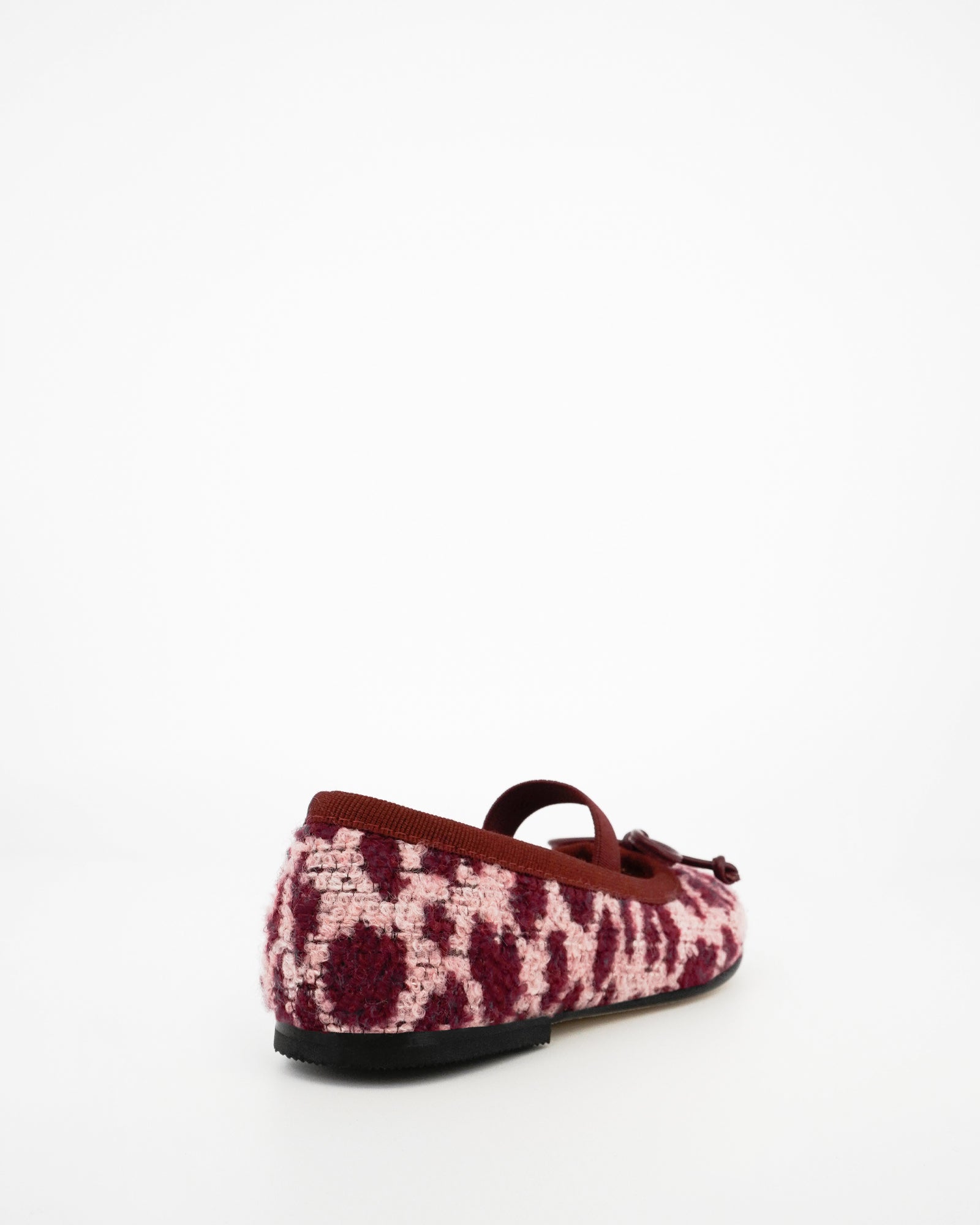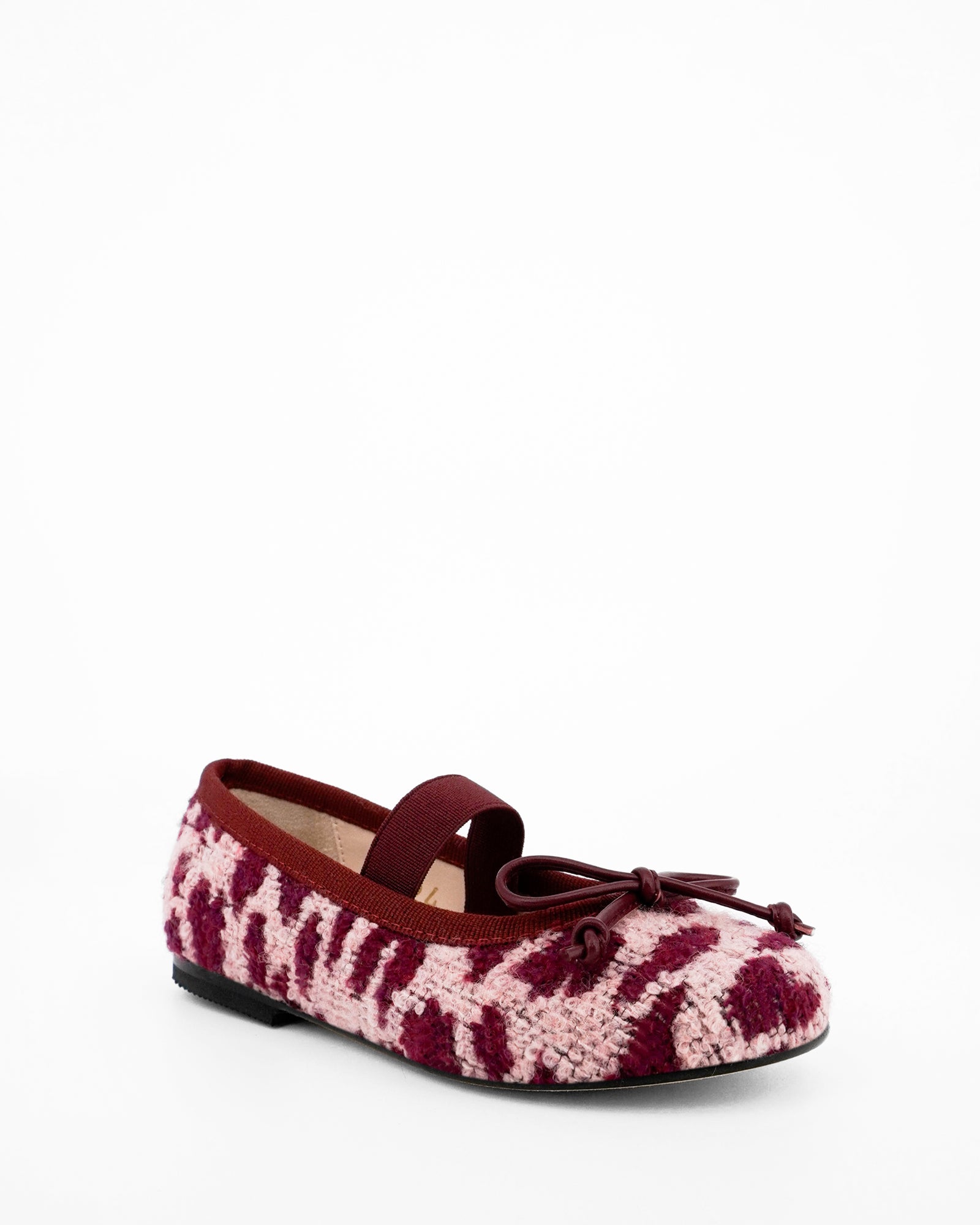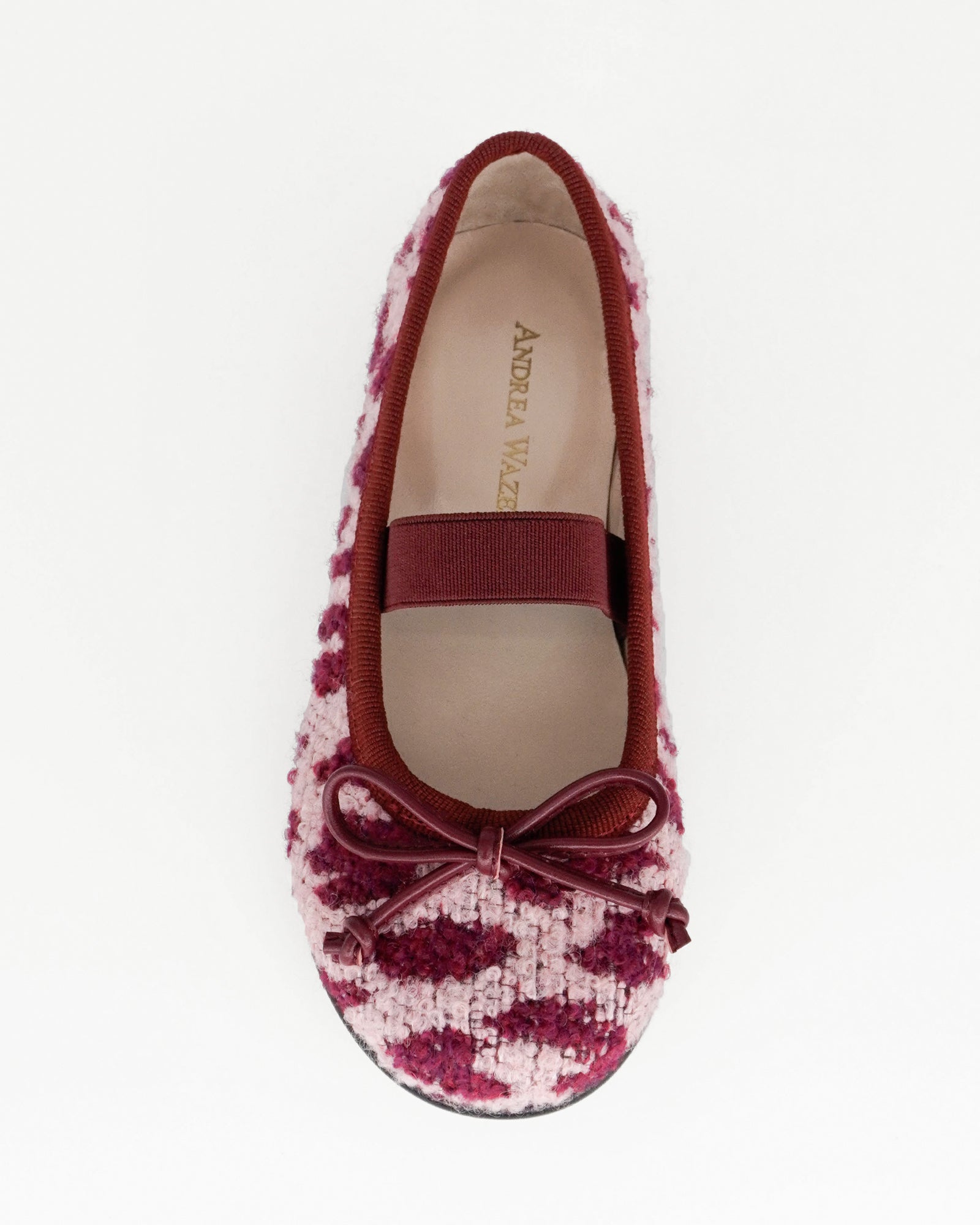 The Barbara Mini Ballerina Madame by Andrea Wazen is a playful yet elegant kids’ style designed to match the women’s Barbara Ballerina. Crafted from soft, fluffy Madame material in a pink and bordeaux leopard print, it features the signature bow on the upper. A charming mini-me design that combines comfort, style, and a touch of whimsy for little ones.