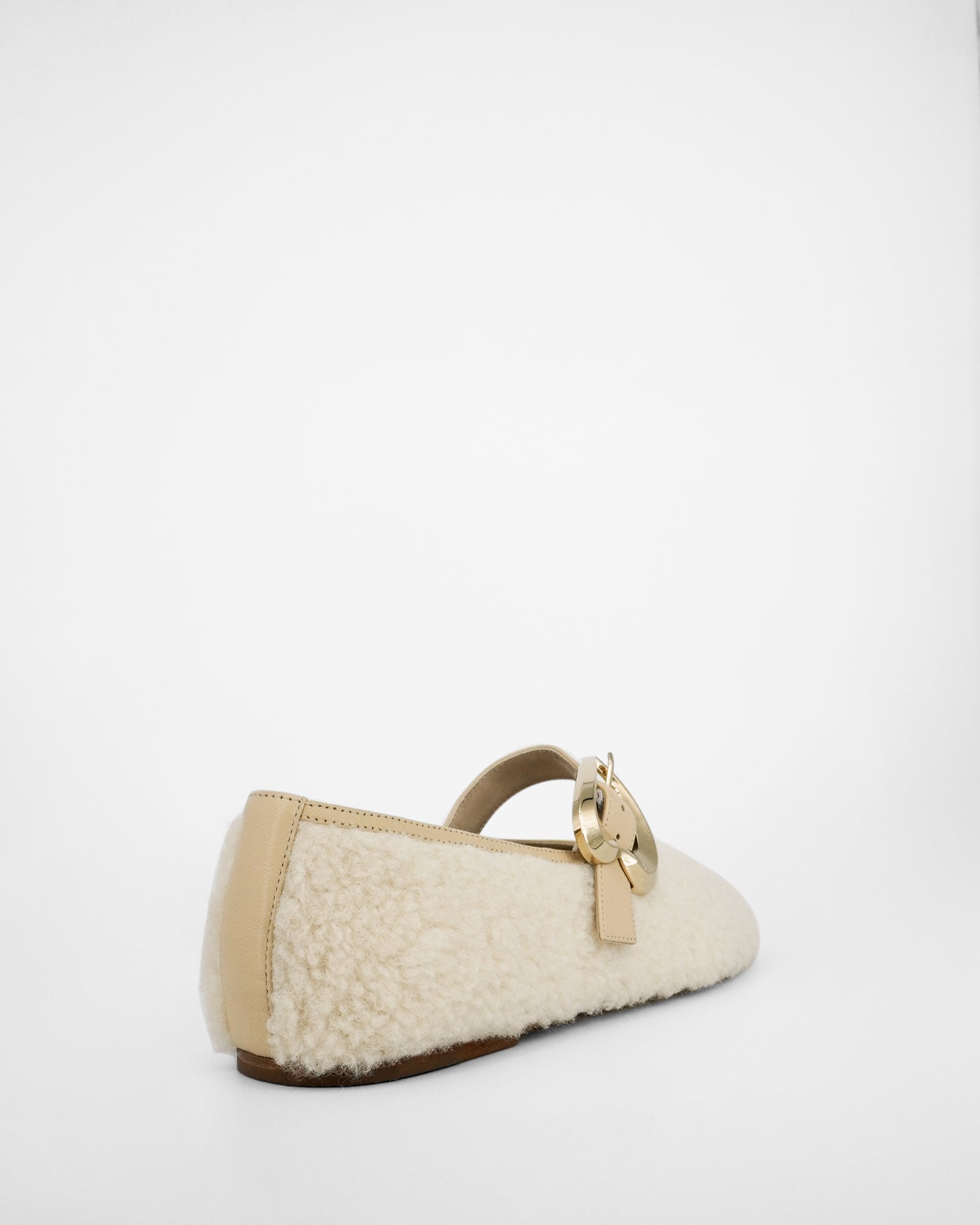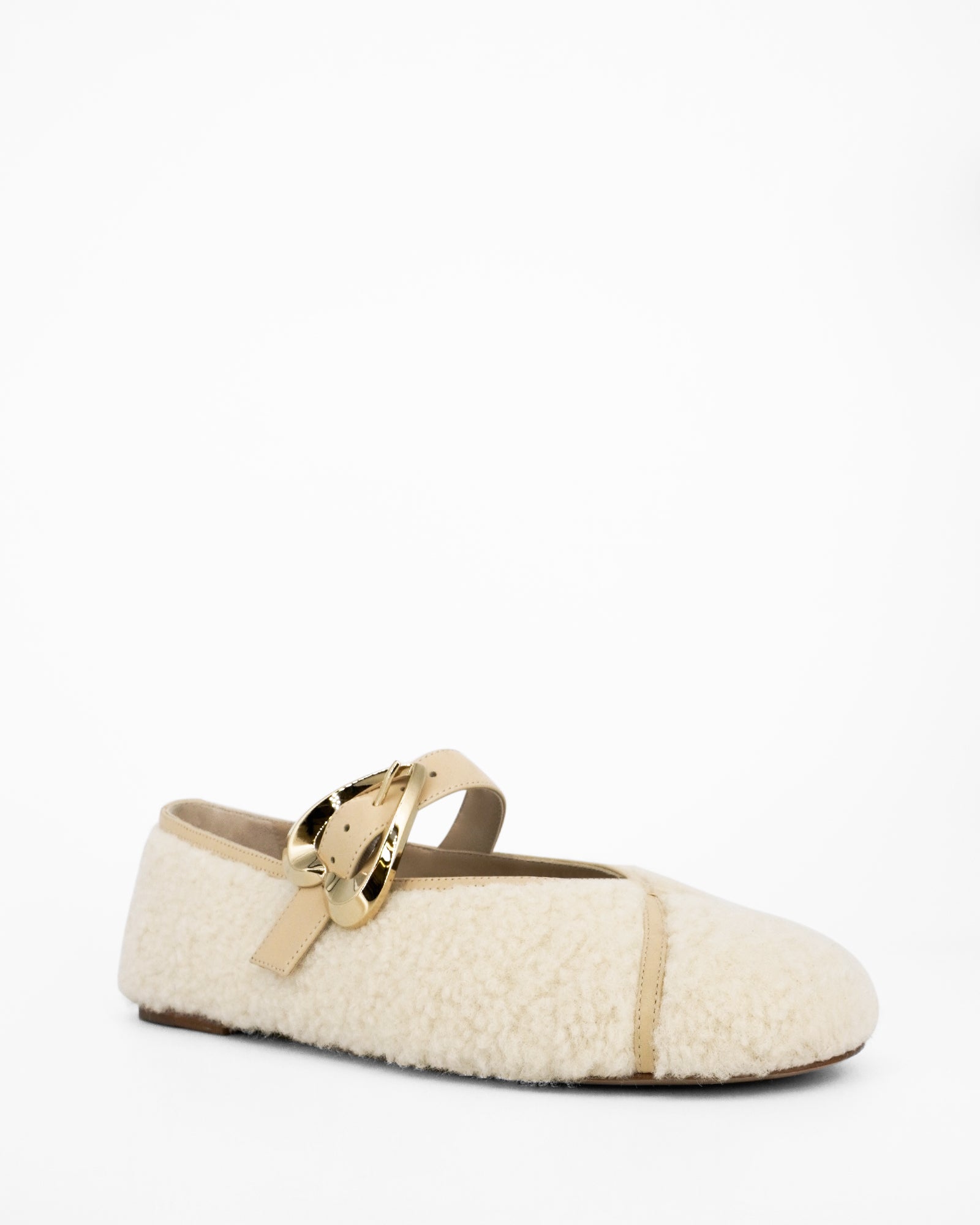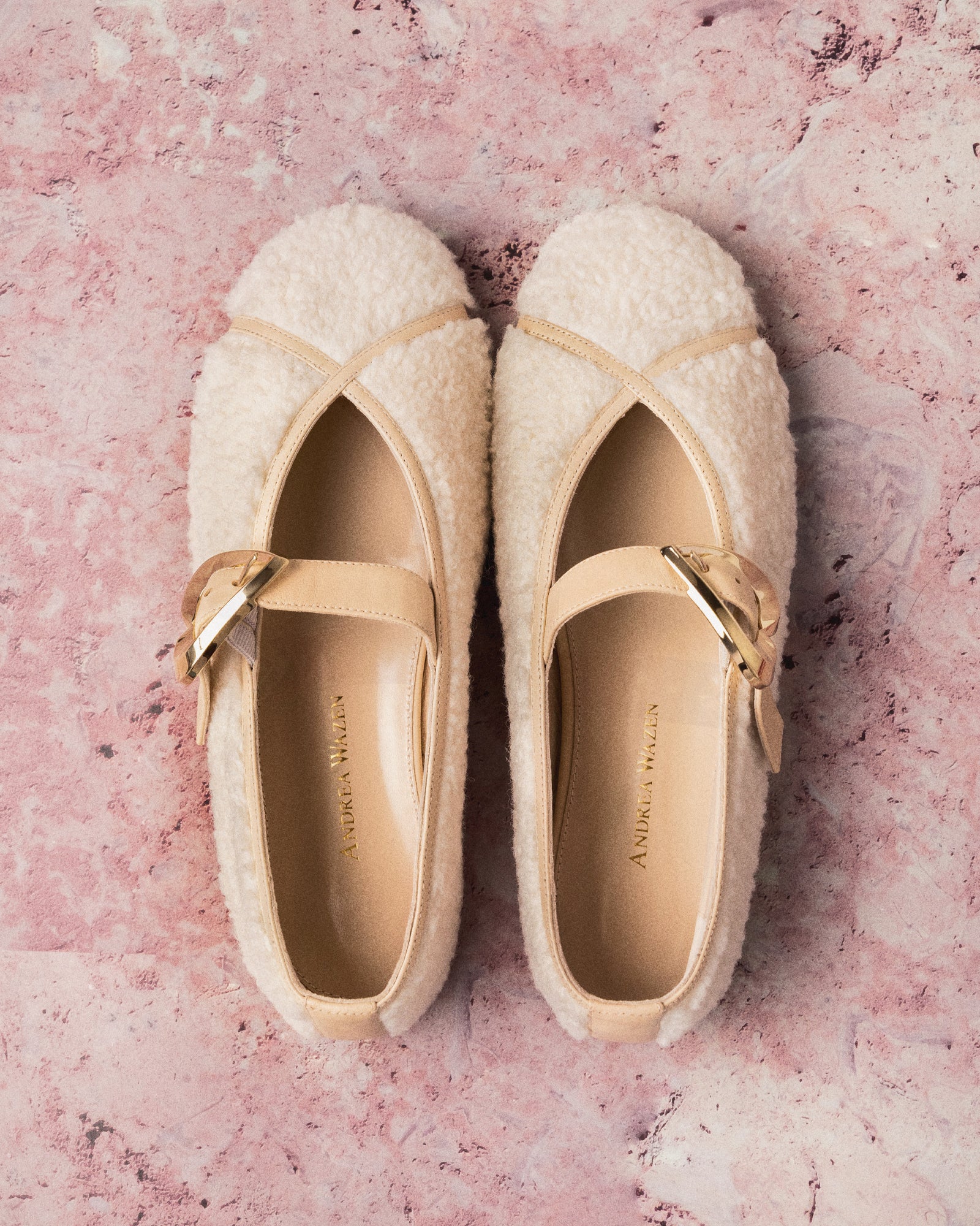The Barbara Ballerina in cream shearling is a soft and stylish take on everyday comfort. Made with warm shearling and smooth leather, it feels as good as it looks. The signature AW heart buckle adds a touch of charm to its simple, elegant shape—perfect for cozy days with a polished finish.