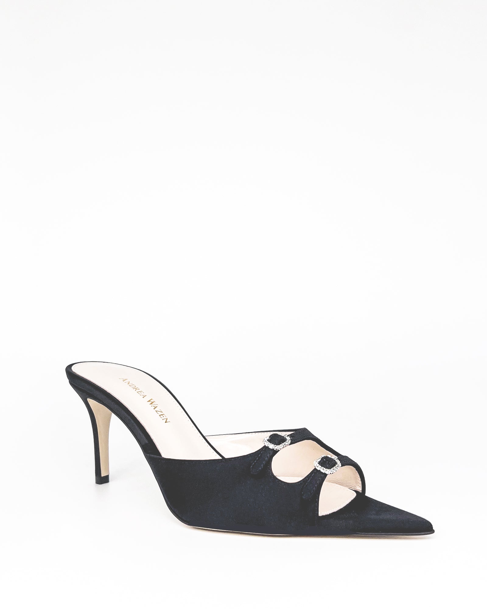 Crafted from luxurious satin, this chic CAROL MULE style features two striking buckles adorning the upper, adding a touch of charm to its overall elegance. Standing tall on a 75mm heel, making it ideal for both day and evening wear. With its open toe and pointed silhouette, this style exudes timeless appeal, making it a versatile and stylish choice for any occasion.