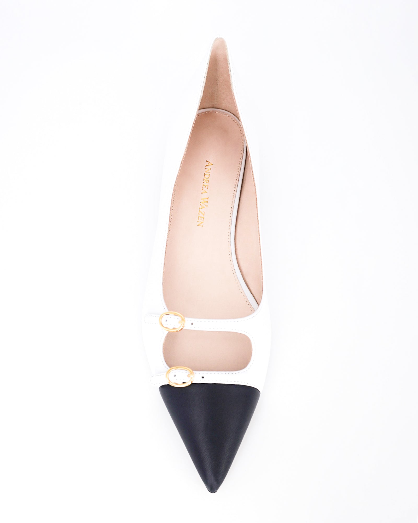 The CAROLINE BALLET FLATS, is a flat version of the Caroline Mule. This elegant shoe features a double gold buckles on the upper and a closed, pointy toe. Made from white and navy leather, the Caroline Flat combines comfort with high-end fashion, perfect for any chic, polished look.