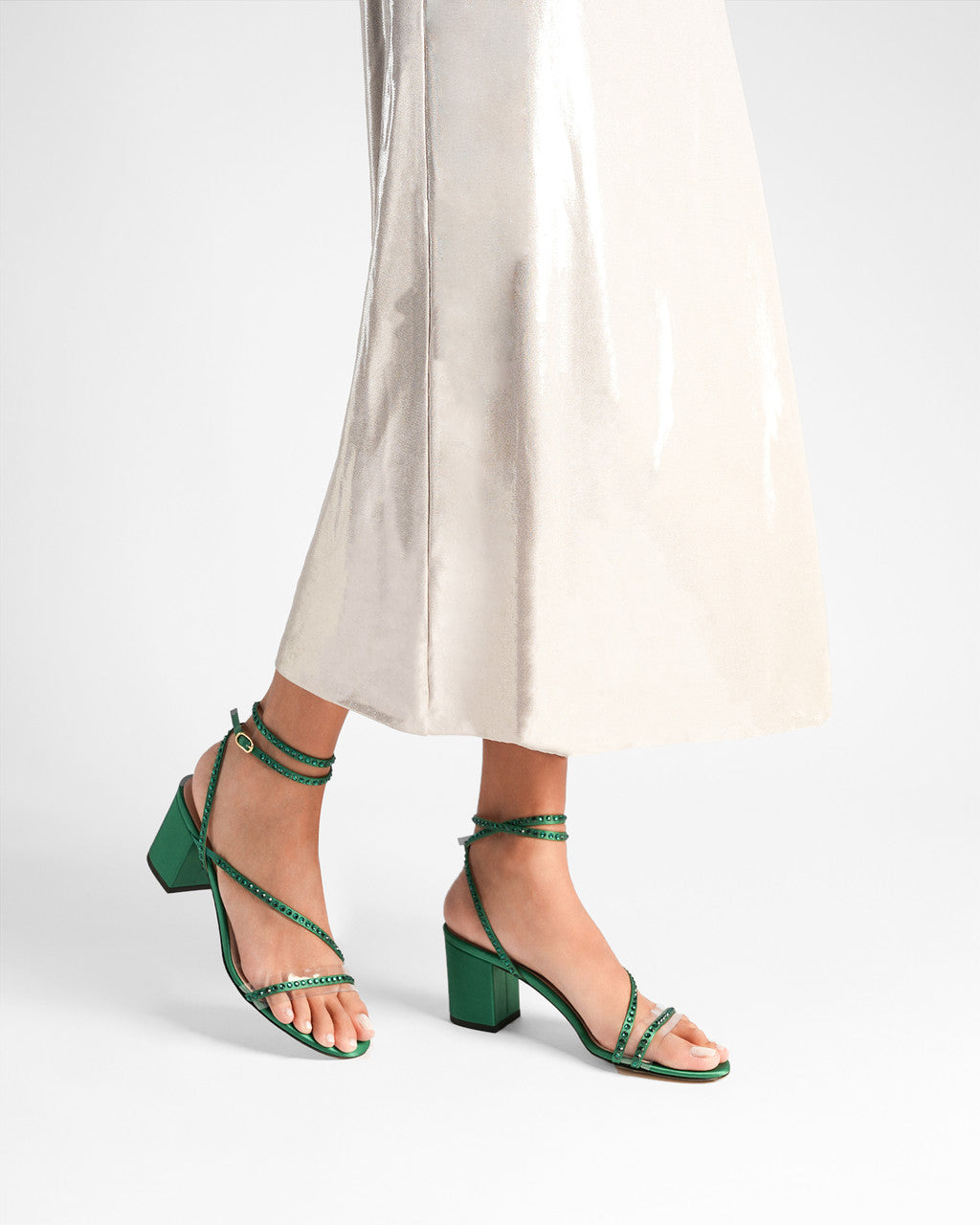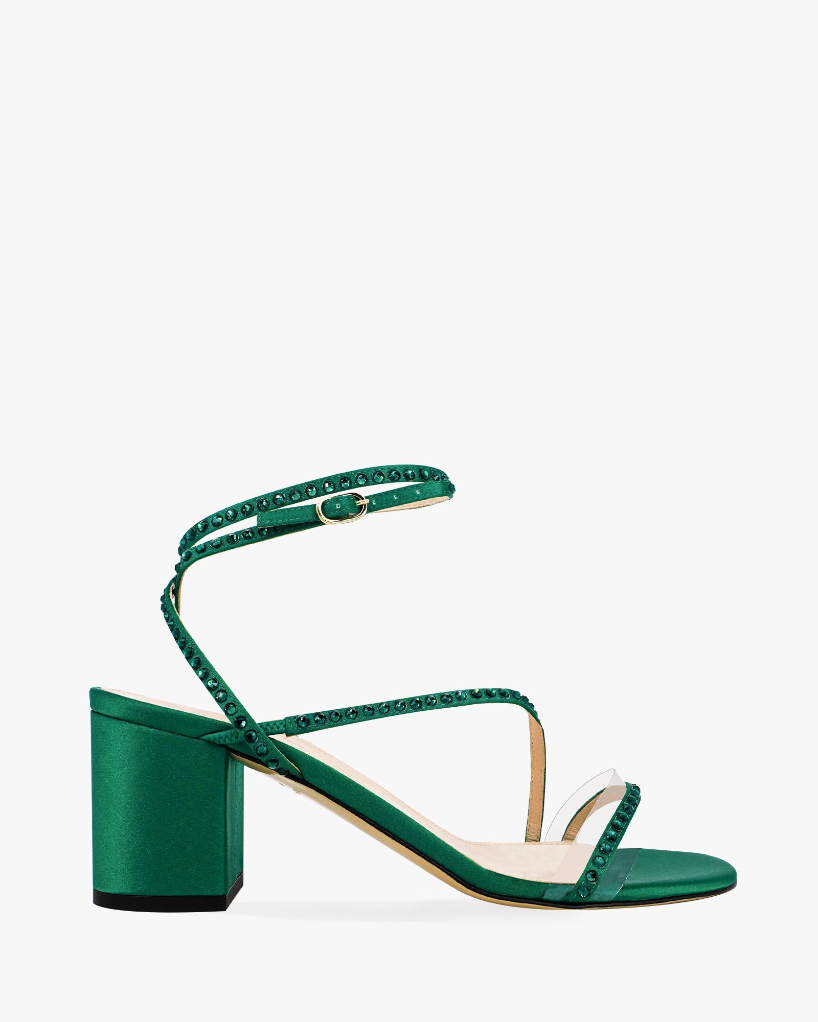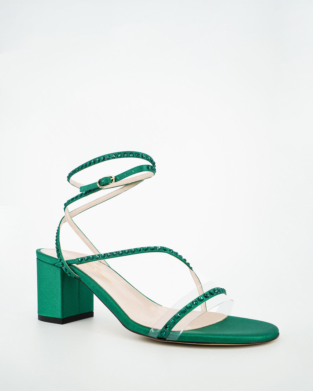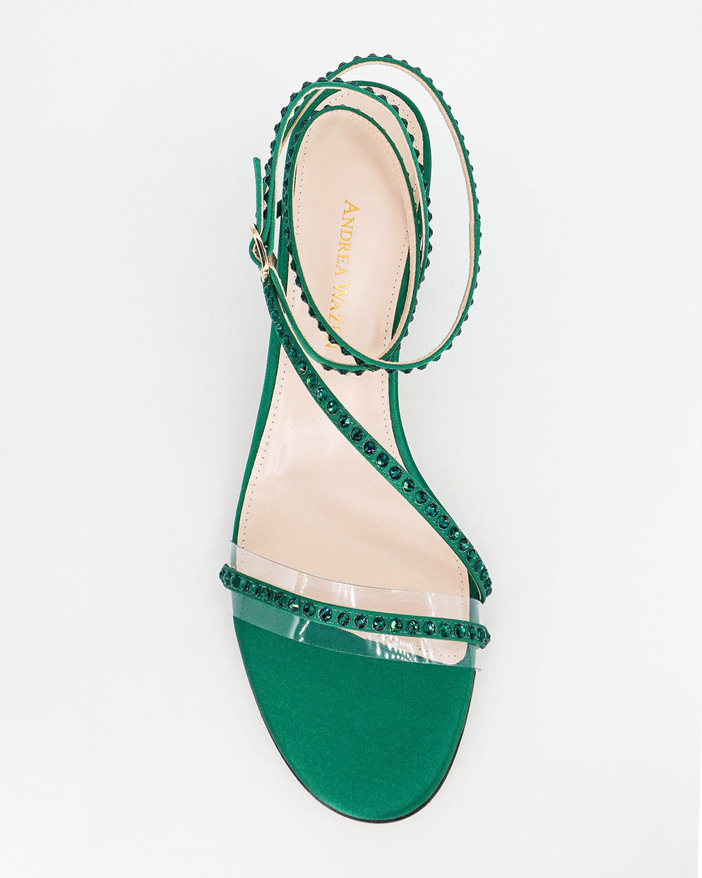 The DASSY BLOCK is a stylish reinterpretation of Andrea Wazen's popular PVC Dassy Pumps. With an open toe, block heel, and chic diagonal and double ankle straps, this sandal is adorned with shimmering crystals and leather accents for a touch of glamour. It's a modern and sophisticated choice, showcasing Andrea Wazen's flair for blending contemporary design with luxurious details.