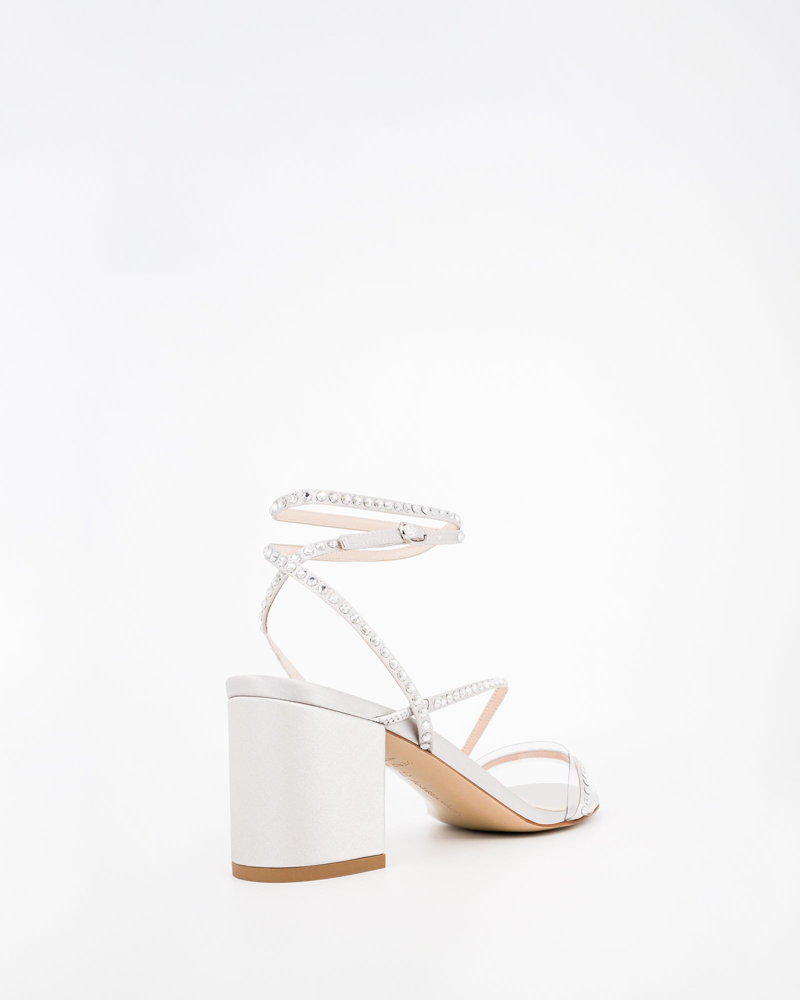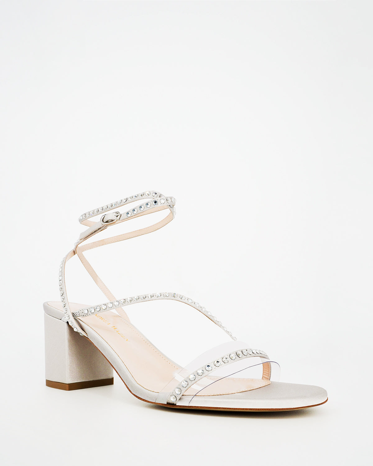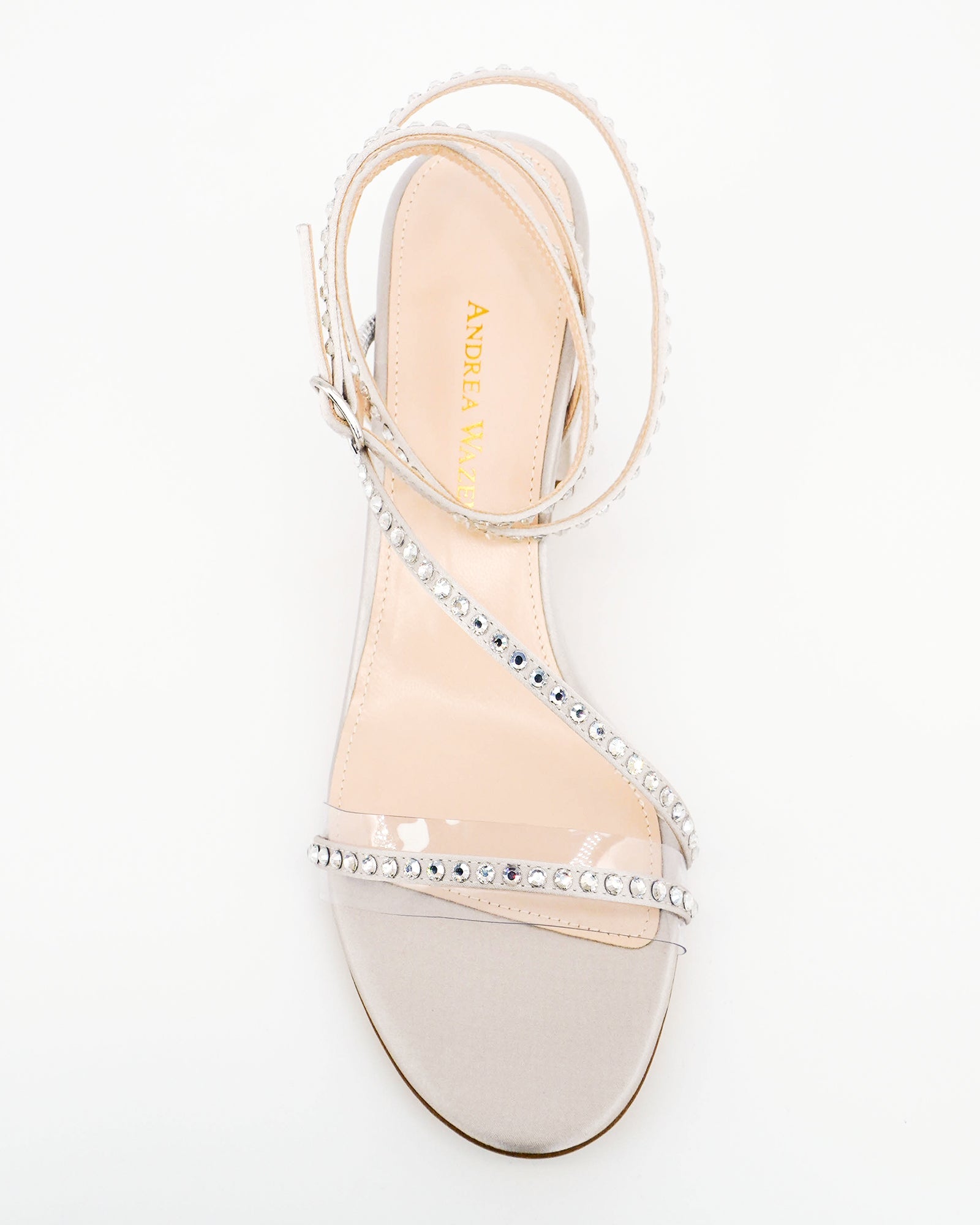 The DASSY BLOCK is a stylish reinterpretation of Andrea Wazen's popular PVC Dassy Pumps. With an open toe, block heel, and chic diagonal and double ankle straps, this sandal is adorned with shimmering crystals and leather accents for a touch of glamour. It's a modern and sophisticated choice, showcasing Andrea Wazen's flair for blending contemporary design with luxurious details.