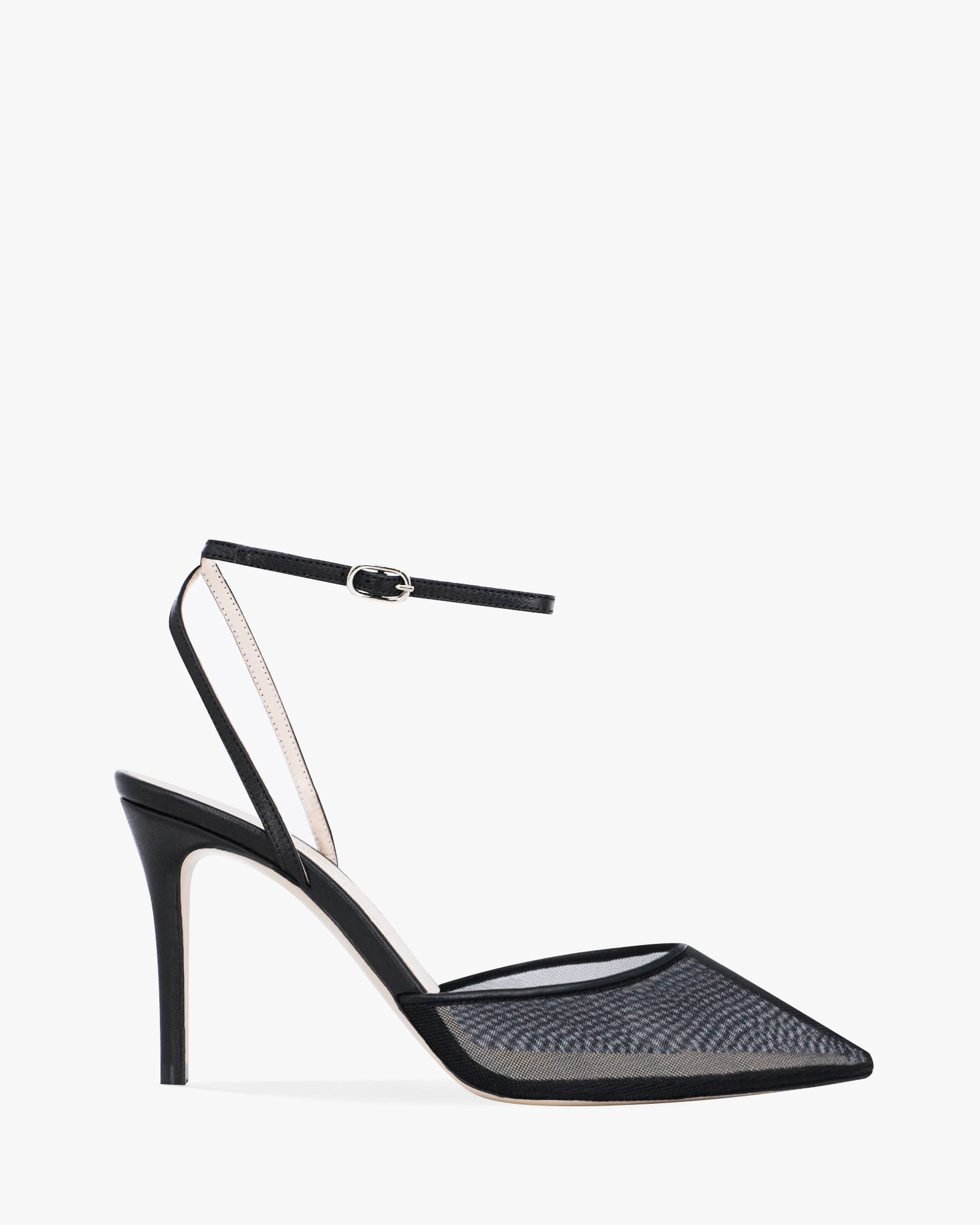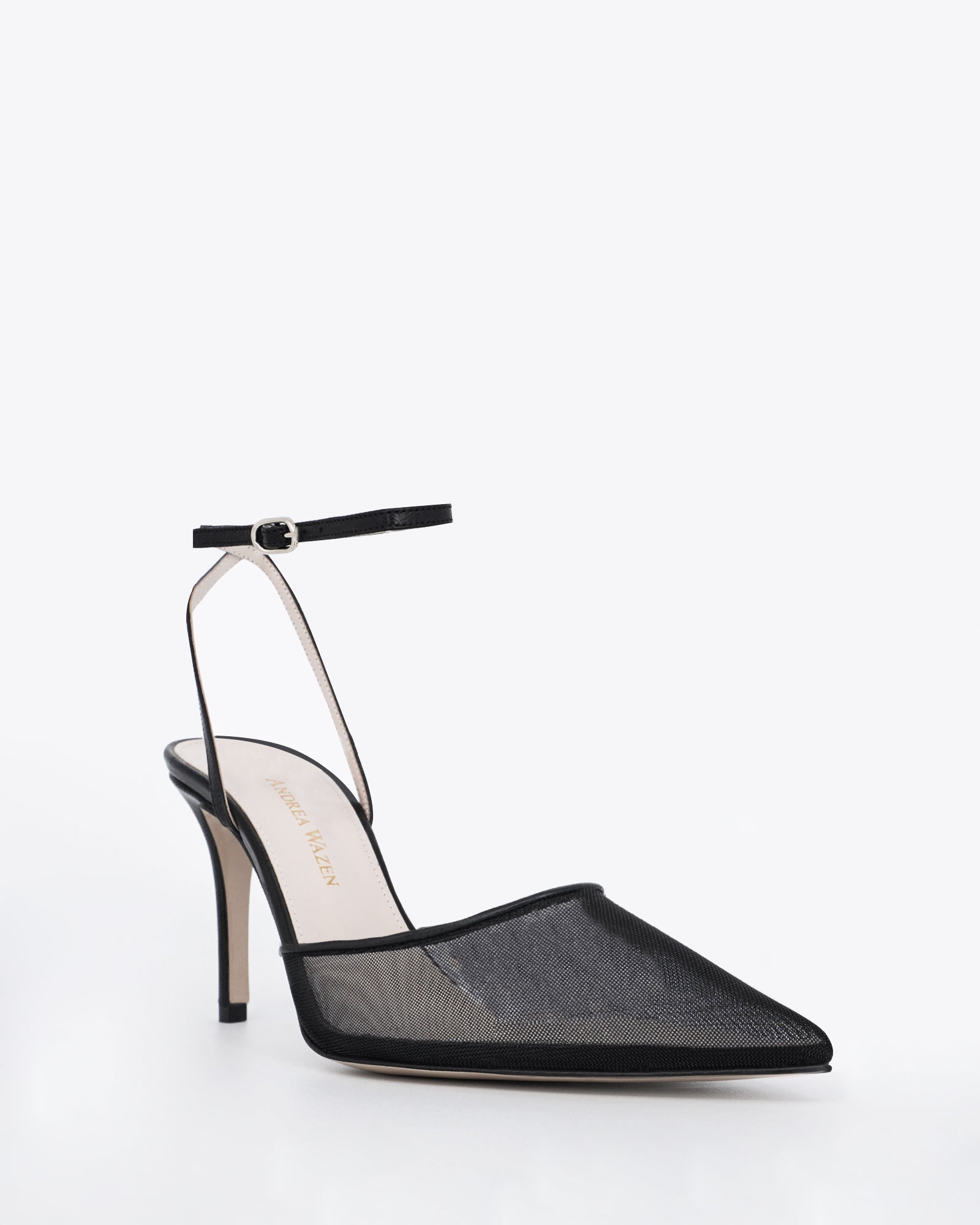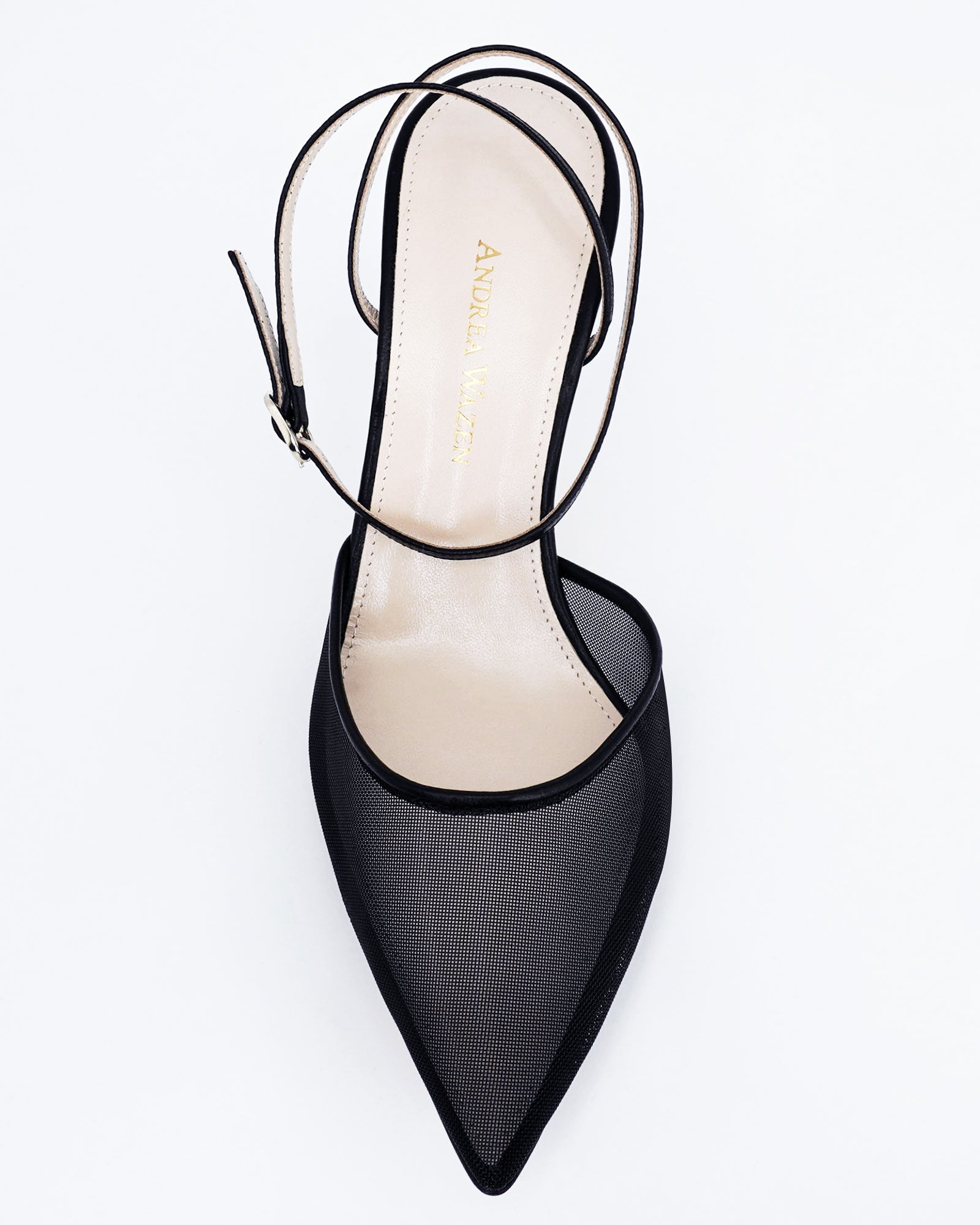 Andrea Wazen's DENVER style is an elegant pump with an 85mm heel. It features a leather and see-through mesh upper with a pointy toe, blending sophistication and modern flair. Perfect for both work and evening wear.