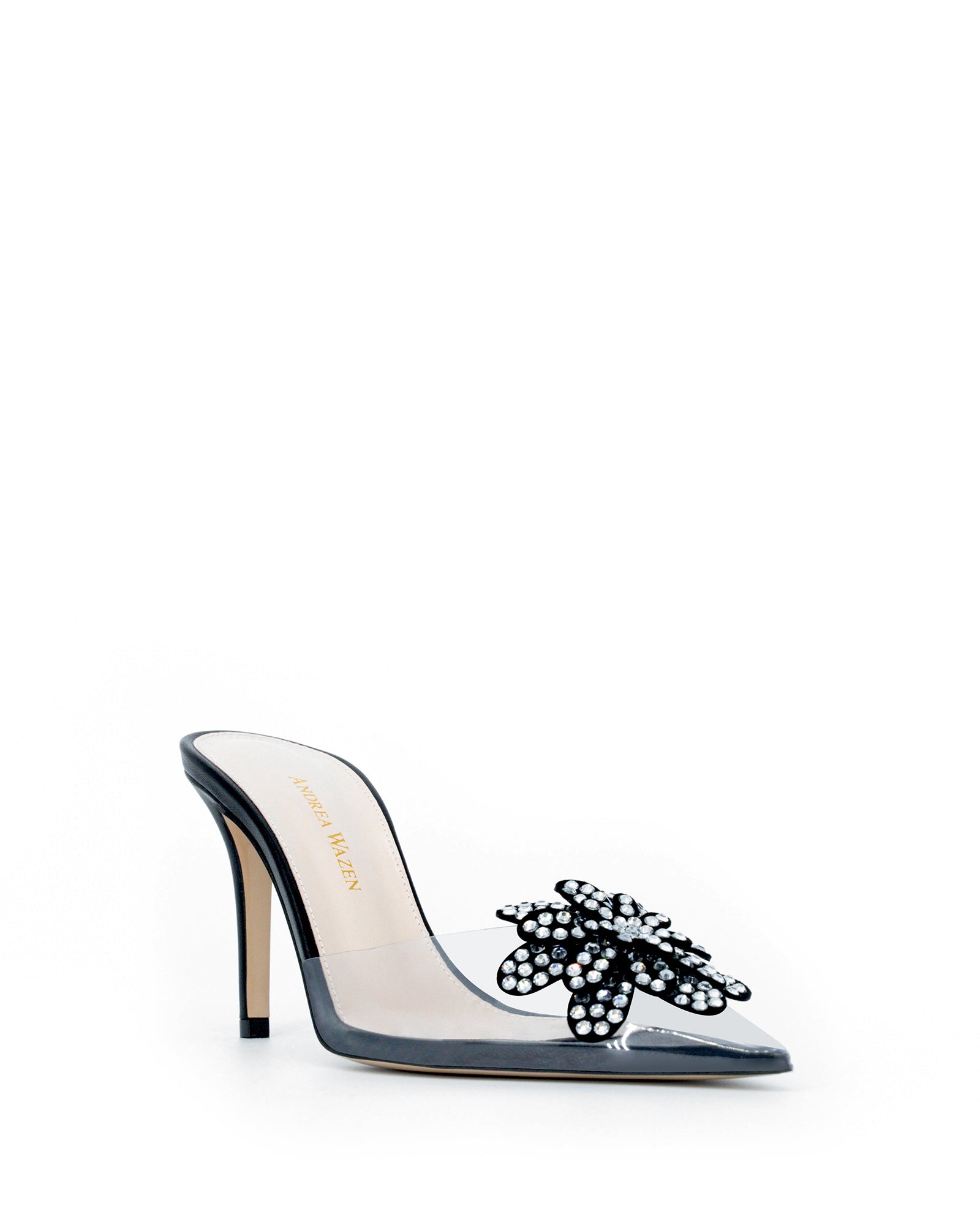 The FLORA PVC GLITZ MULE, Crafted from a luxurious blend of leather and PVC & Crystals, this shoe offers a unique, barely-there aesthetic that elongates the legs. Its standout feature is a beautifully adorned crystal-encrusted flower on the upper, which adds a dazzling and feminine touch to the overall design.