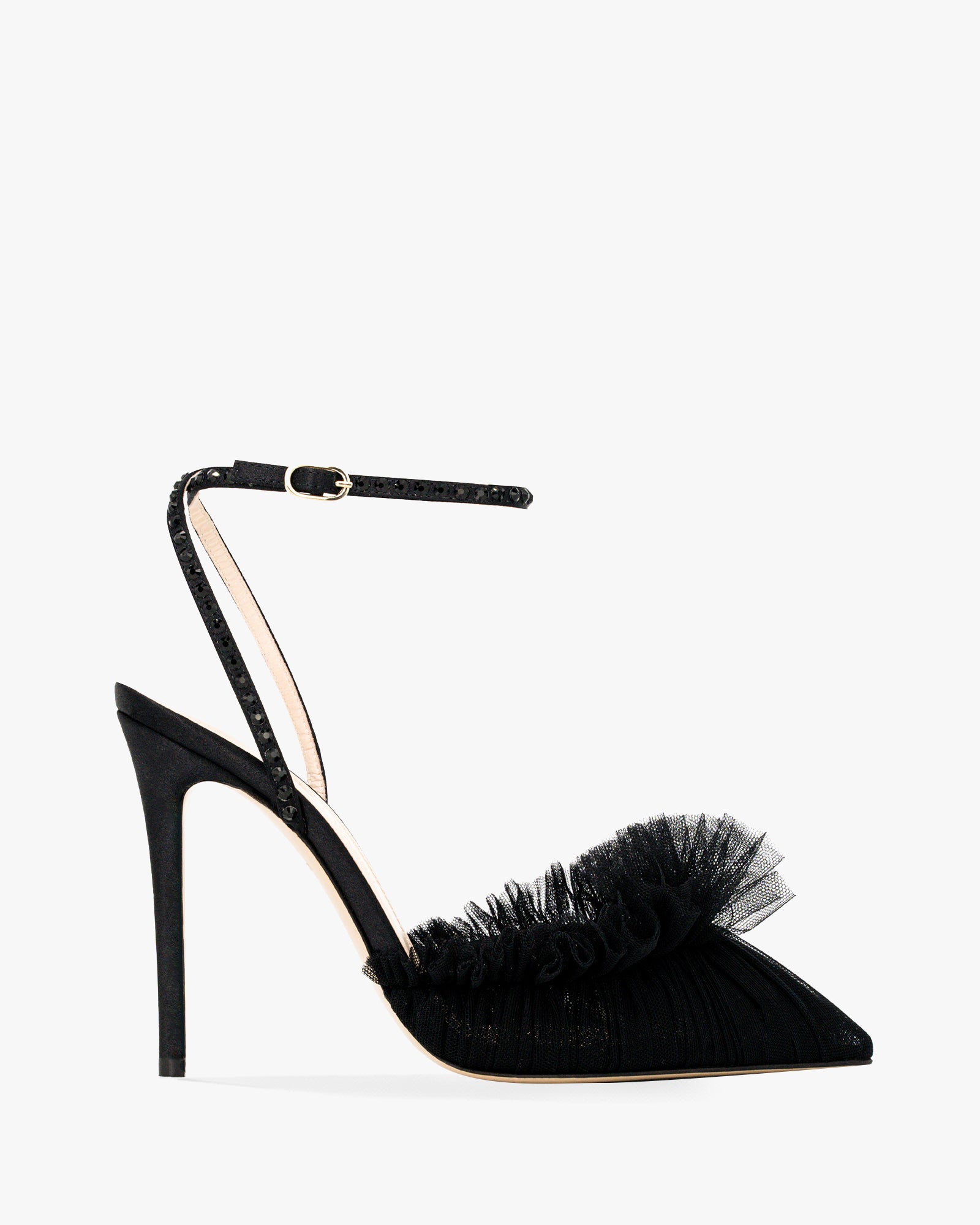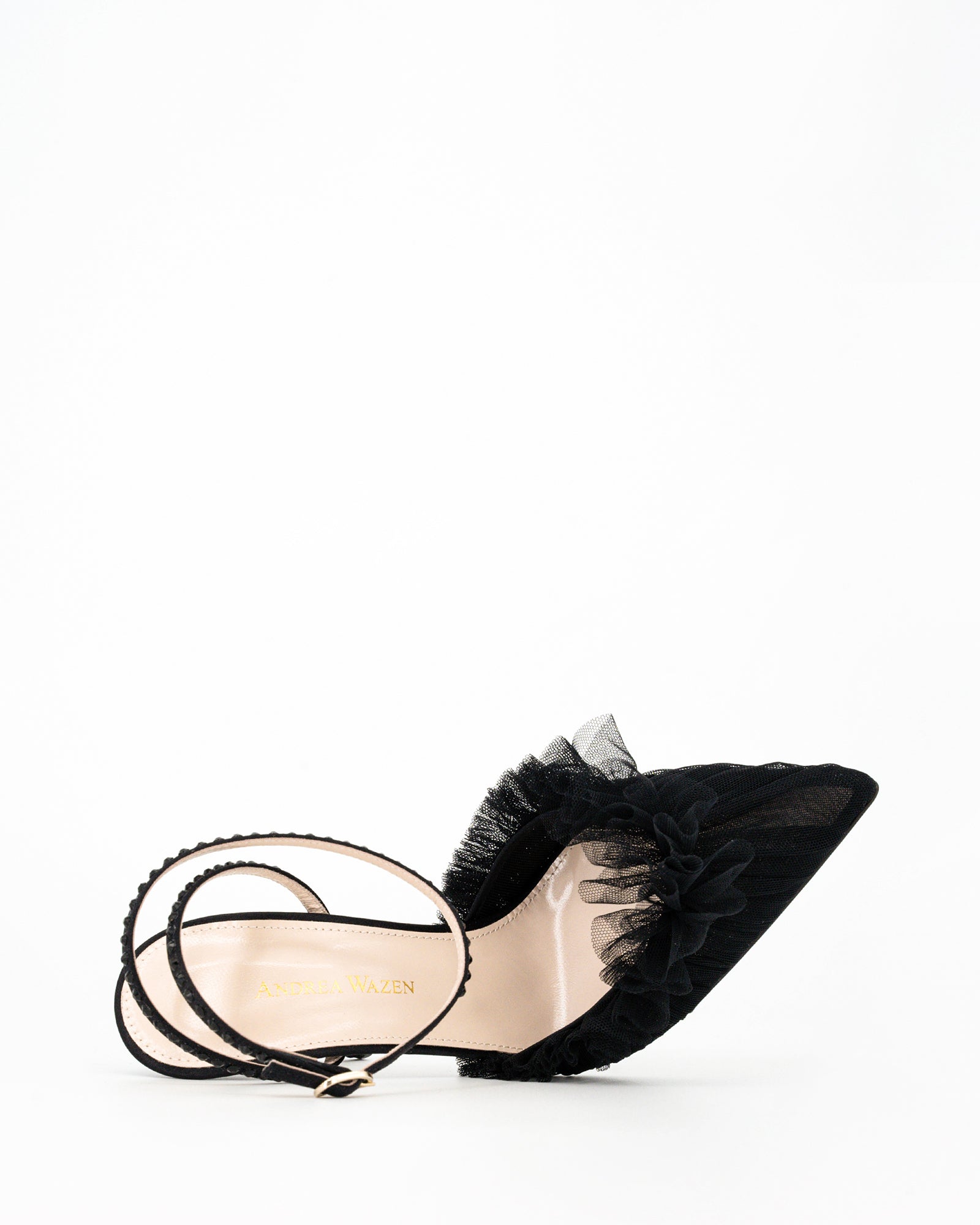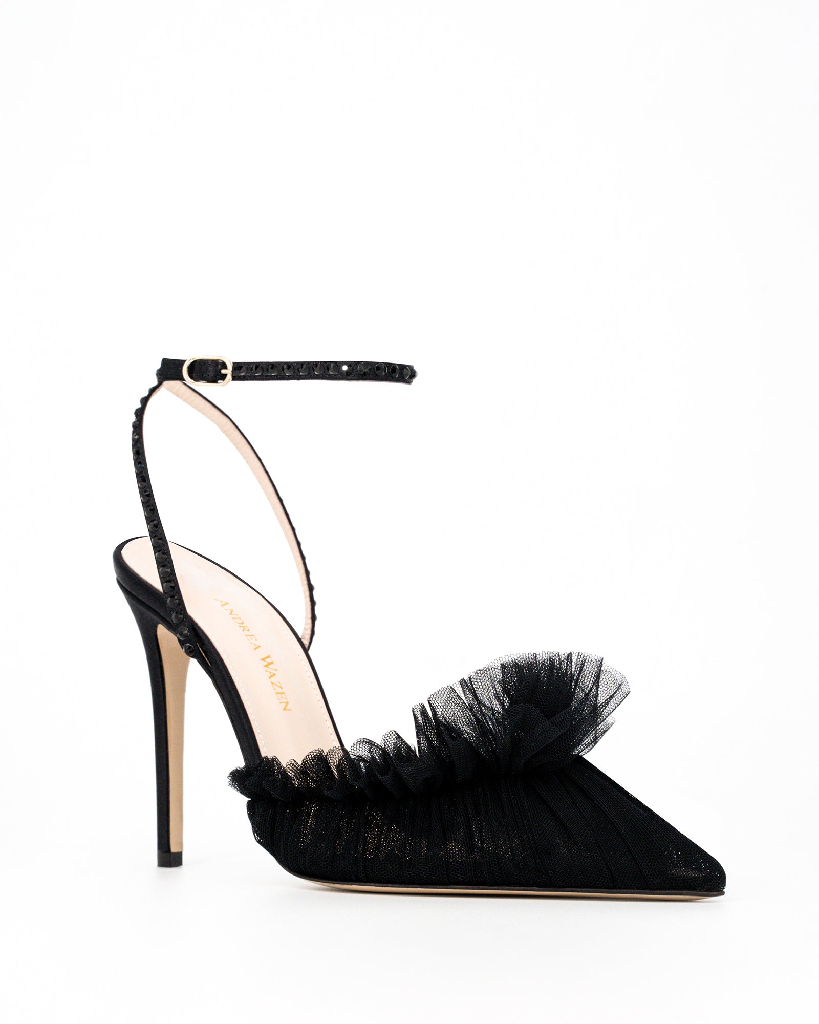 Andrea Wazen's FRANCA GLITZ style is a signature masterpiece adorned with shimmering crystals. The shoe features pleated tulle and a silky mesh surface, with crystals gracefully wrapping the anklet strap, adding an elegant and glamorous touch to your look.