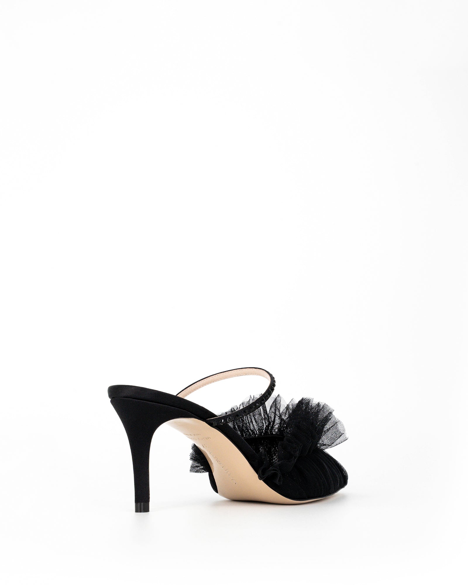 Meet the FRANCA GLITZ MULE by Andrea Wazen, a mule version of the iconic Franca style with a comfortable 75 mm heel. Crafted from satin, tulle, and crystals, it combines sophistication with glamour. The closed pointy toe, delicate ruffles symbolizing blooming flowers, and the upward sling strap add a modern and playful touch. The "franca glitz mule" is a stylish and comfortable choice for those who appreciate elegance with a hint of whimsy.