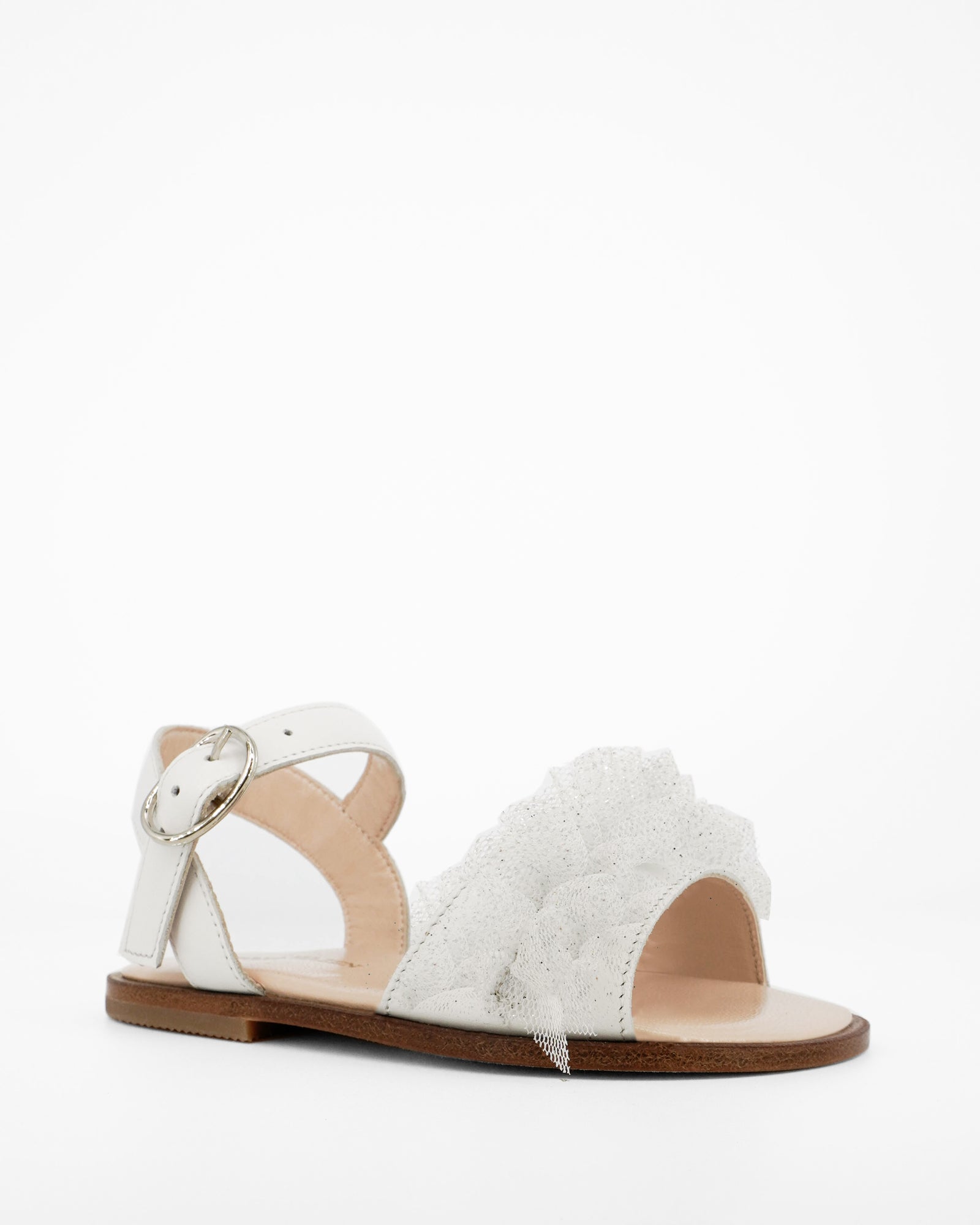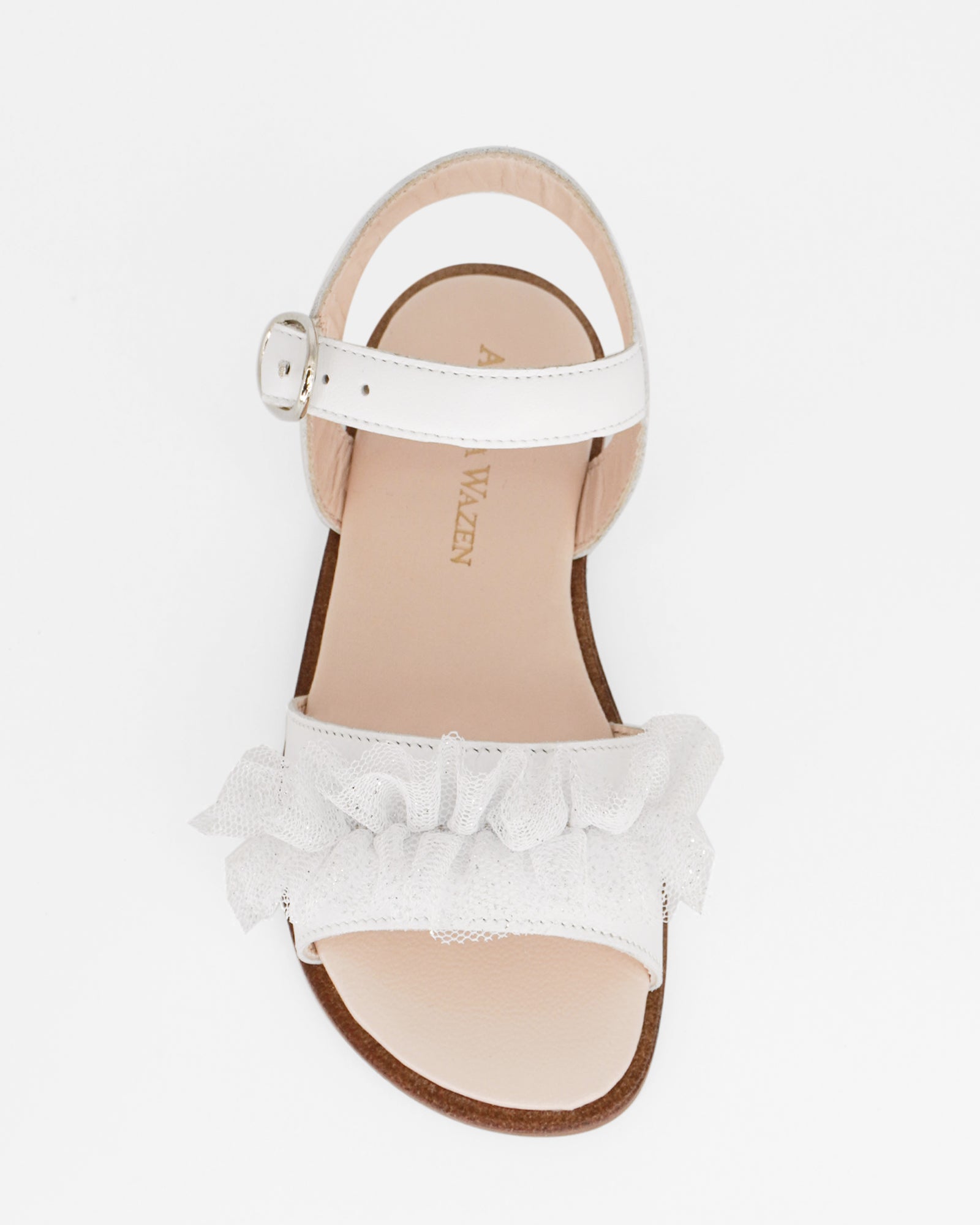 The Franca Mini Sandal by Andrea Wazen is a sweet and elegant style for little ones. Made from smooth white leather, it features a soft tulle ruffle detail and an adjustable ankle strap for a secure, comfortable fit. Lightweight and easy to wear, it’s perfect for special occasions and everyday moments.