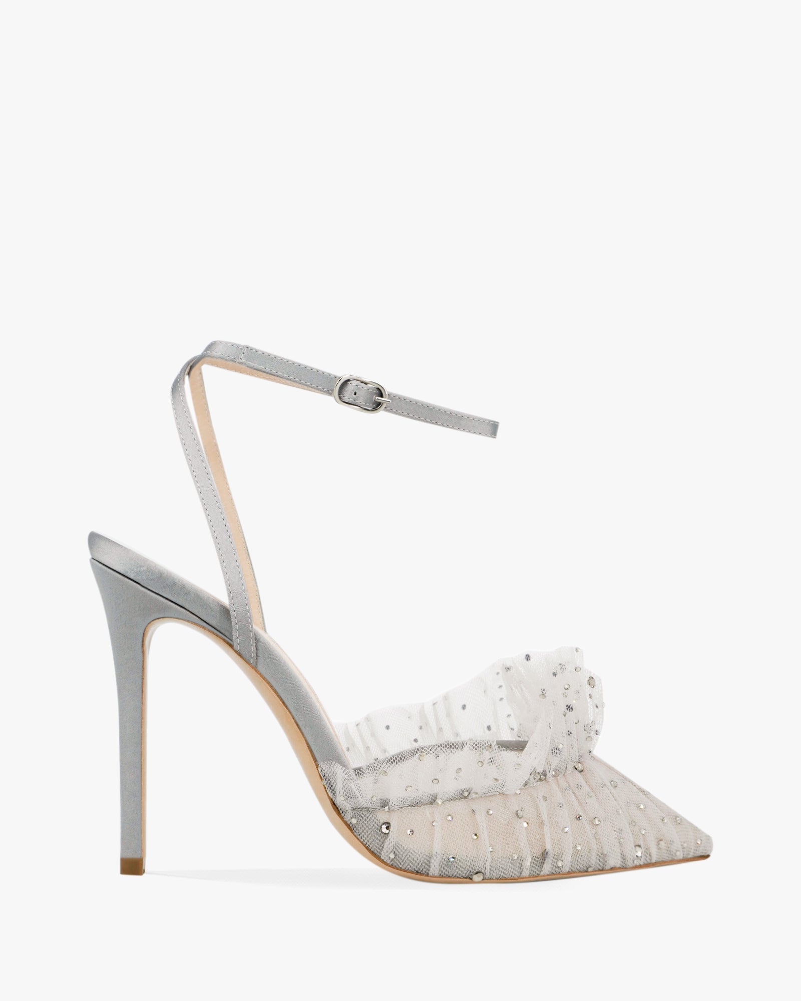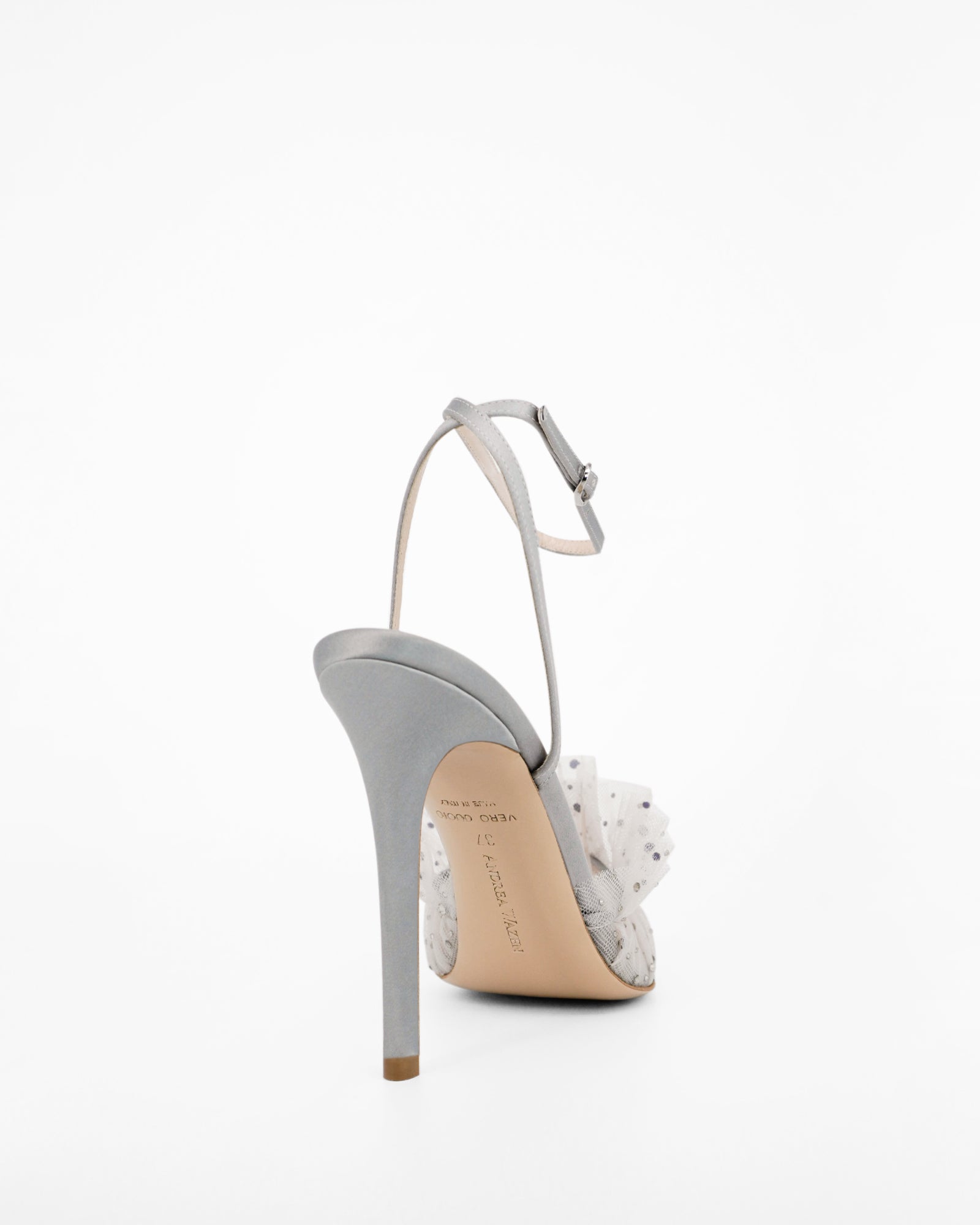 The FRANCA SPARKLE is a glamorous twist on Andrea Wazen’s iconic Franca style. Made from satin and crystal-adorned tulle, it combines elegance with shine. The pointed toe and ankle strap keep it classic, while the sparkle adds a modern, eye-catching finish.
