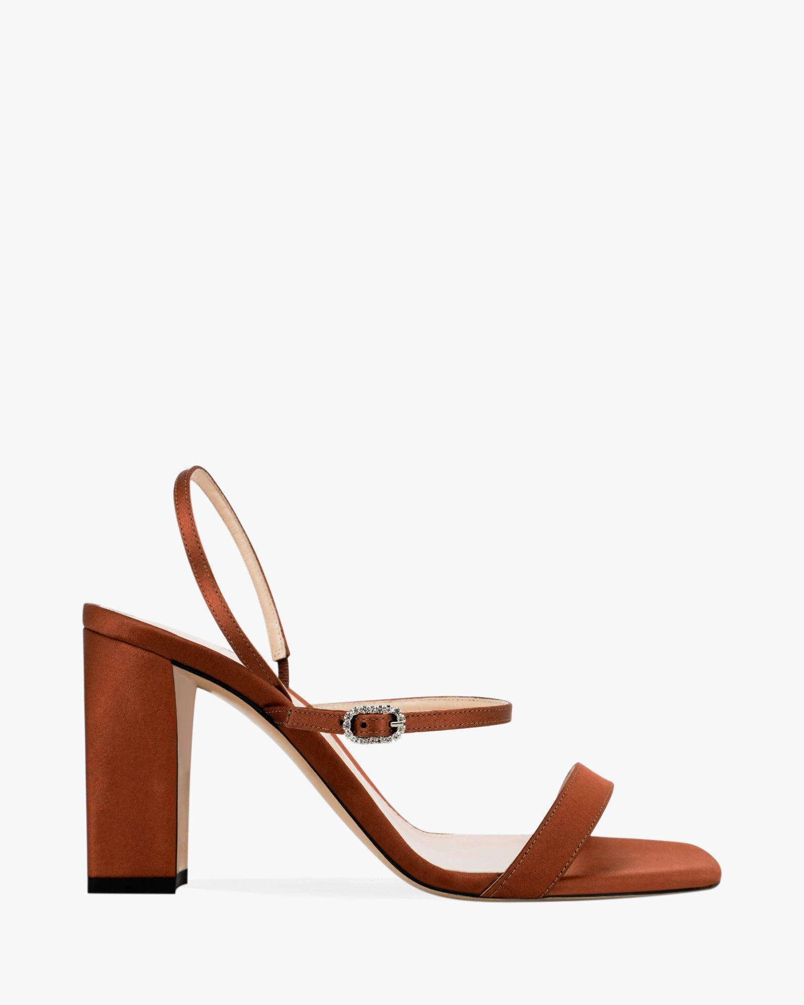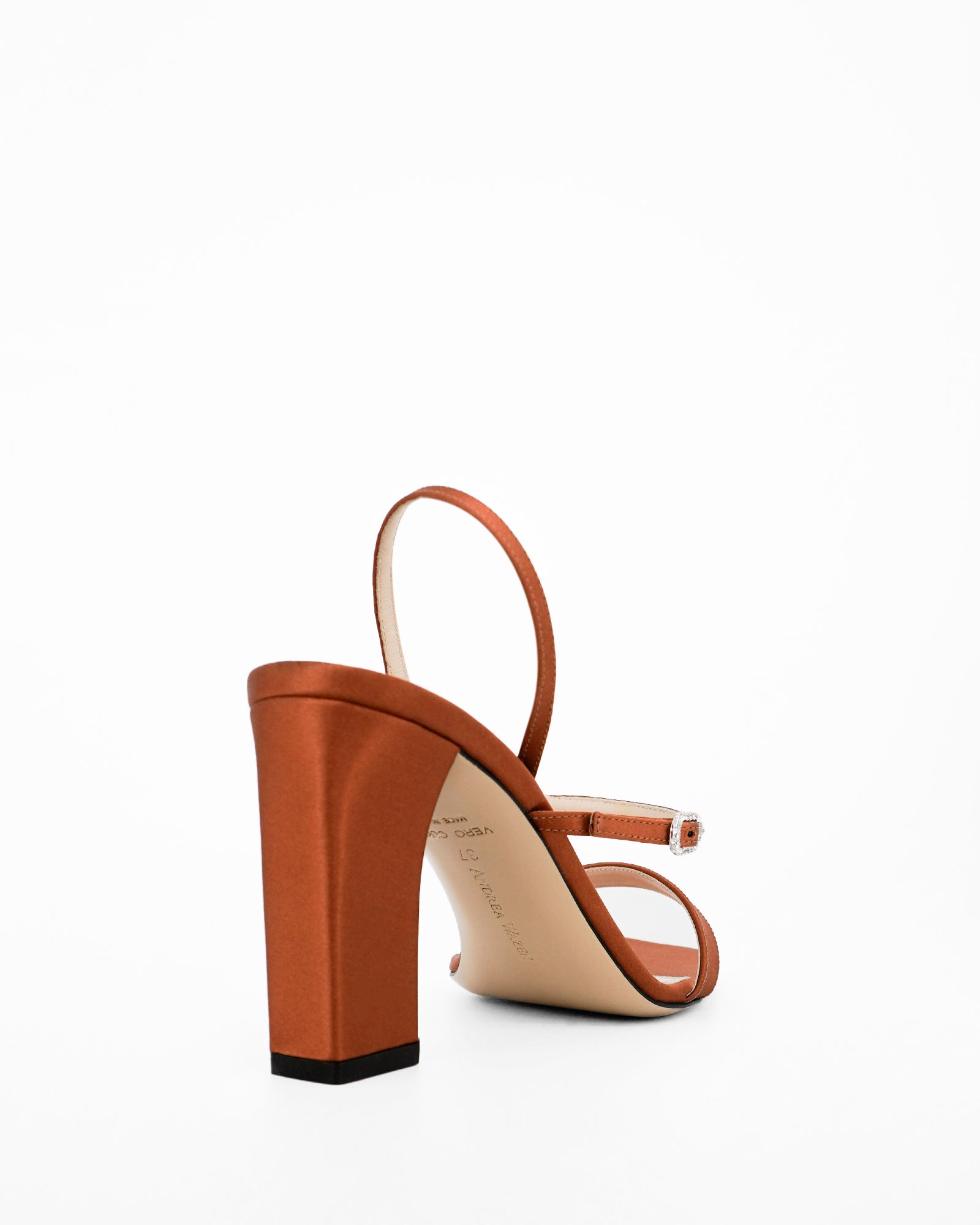 The Hally Block sandal from Andrea Wazen’s latest collection exudes modern sophistication. Crafted from satin, this design features a sleek back strap and a refined front strap adorned with the brand’s signature crystal buckle. The open squared toe and 85 mm heel create a bold yet feminine silhouette, perfect for effortless elegance.