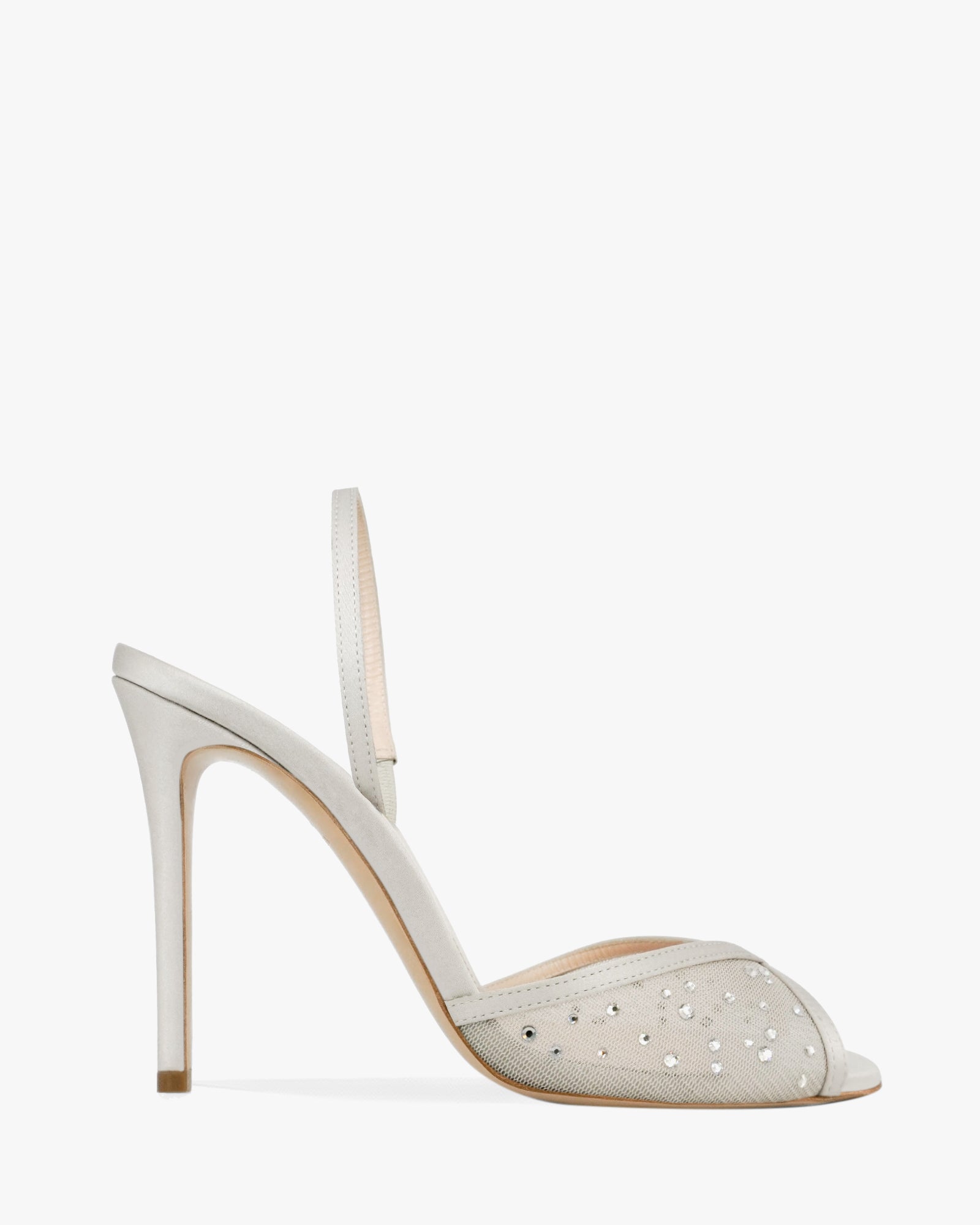 The Jen sling by Andrea Wazen is a refined evening style with a soft touch of sparkle. Designed with a rounded toe, this silhouette is crafted from satin mesh and finished with delicate hotfix embellishments. The signature cross design adds a feminine detail across the upper, while the satin slingback strap provides a secure and elegant fit. Set on a slender 105 mm heel, Jen is perfect for evening occasions and special events.