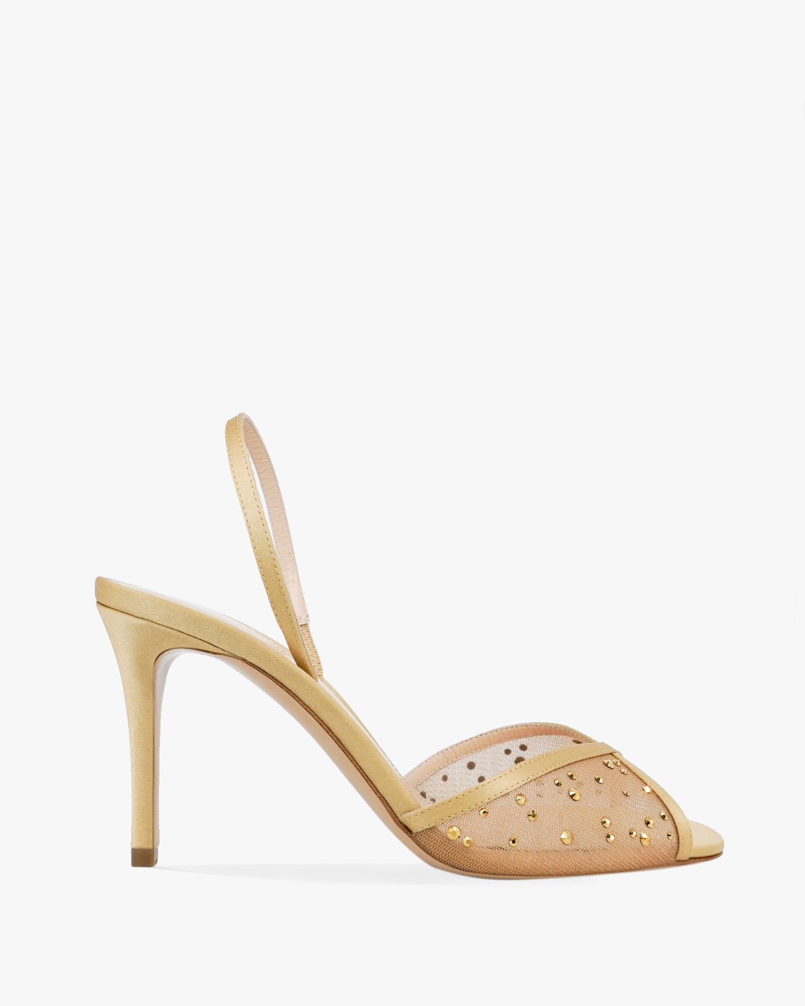The Jen sling by Andrea Wazen is a refined evening style with a soft touch of sparkle. Designed with a rounded toe, this silhouette is crafted from satin mesh and finished with delicate hotfix embellishments. The signature cross design adds a feminine detail across the upper, while the satin slingback strap provides a secure and elegant fit. Set on a slender 105 mm heel, Jen is perfect for evening occasions and special events.