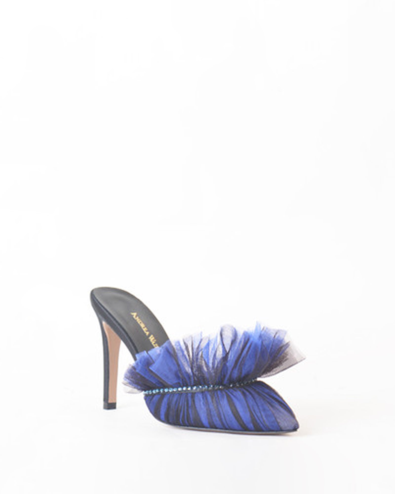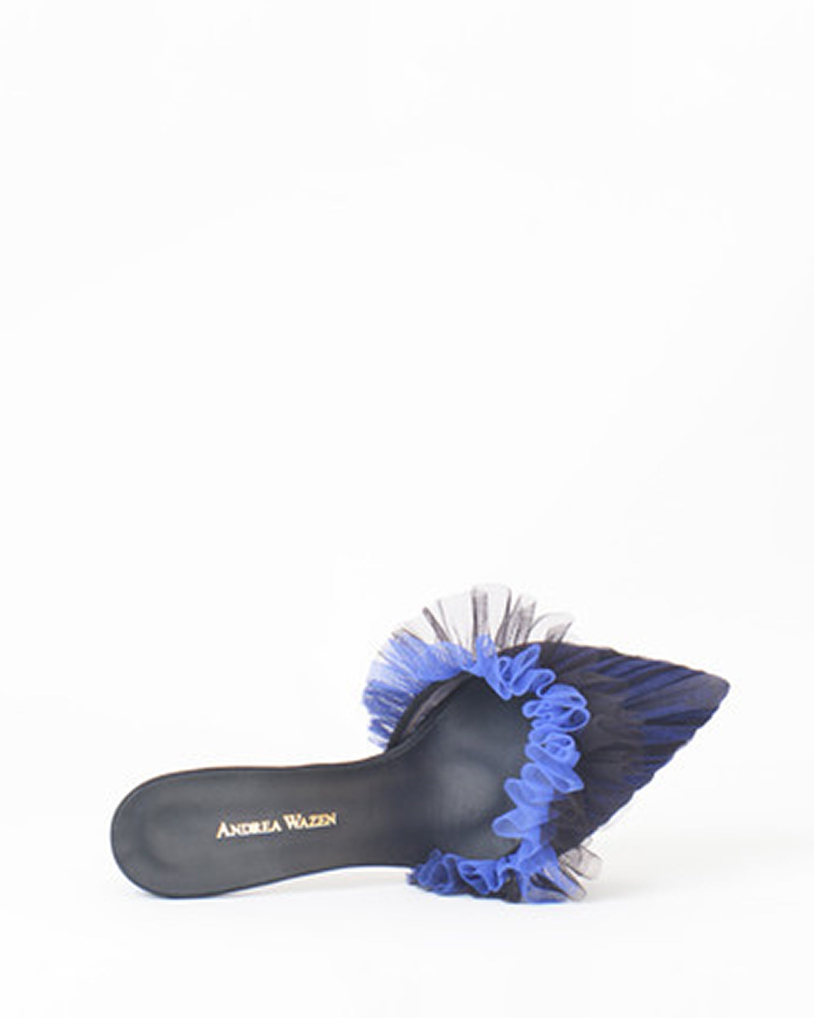 KARLIE, the mule version of Andrea Wazen's signature Franca Style, is designed with a mix of Royal Blue and Night Black Tulle. Shimmering Swarovski Crystals are graciously embedded on the silky mesh of the pump, making it a statement piece for a special event.