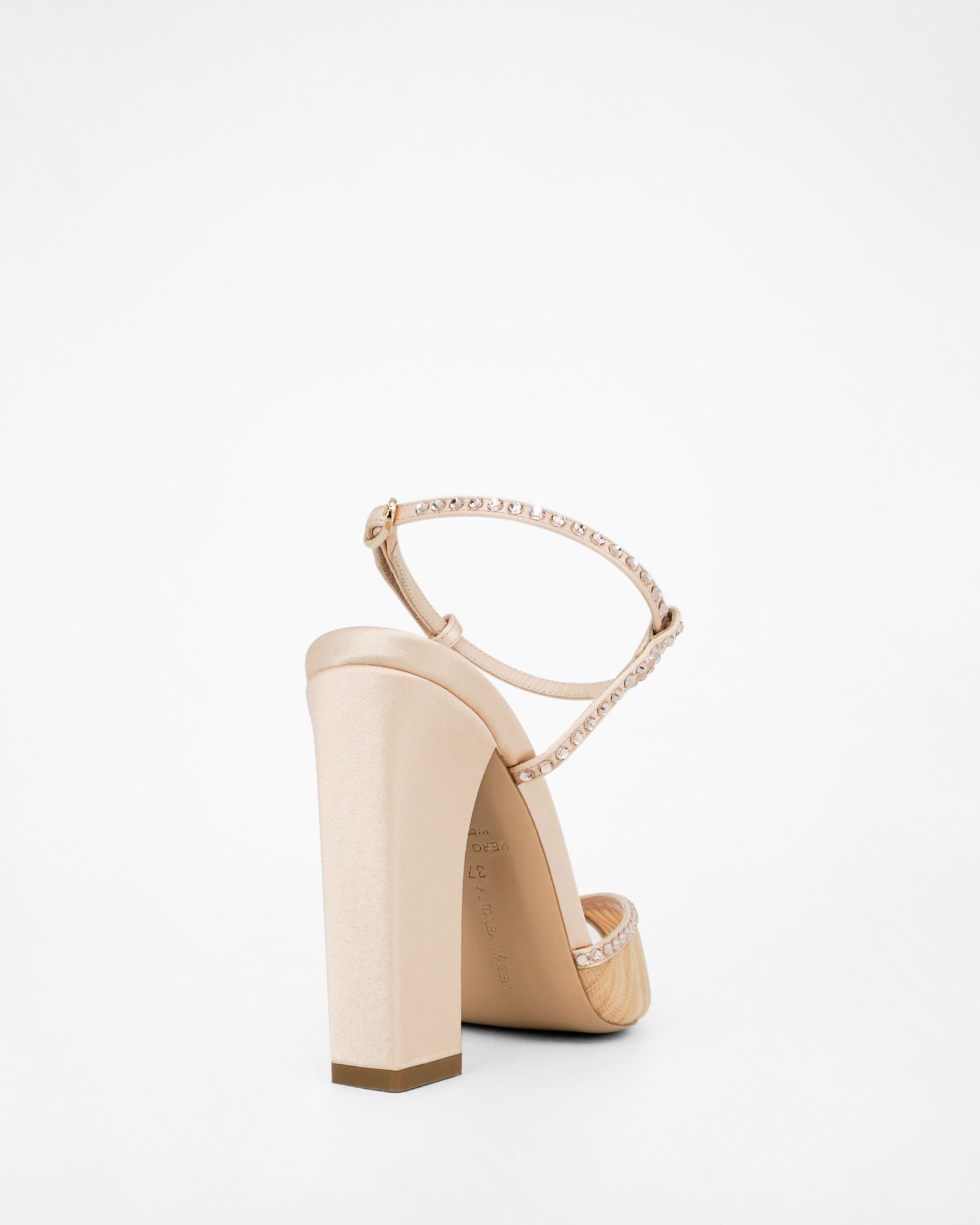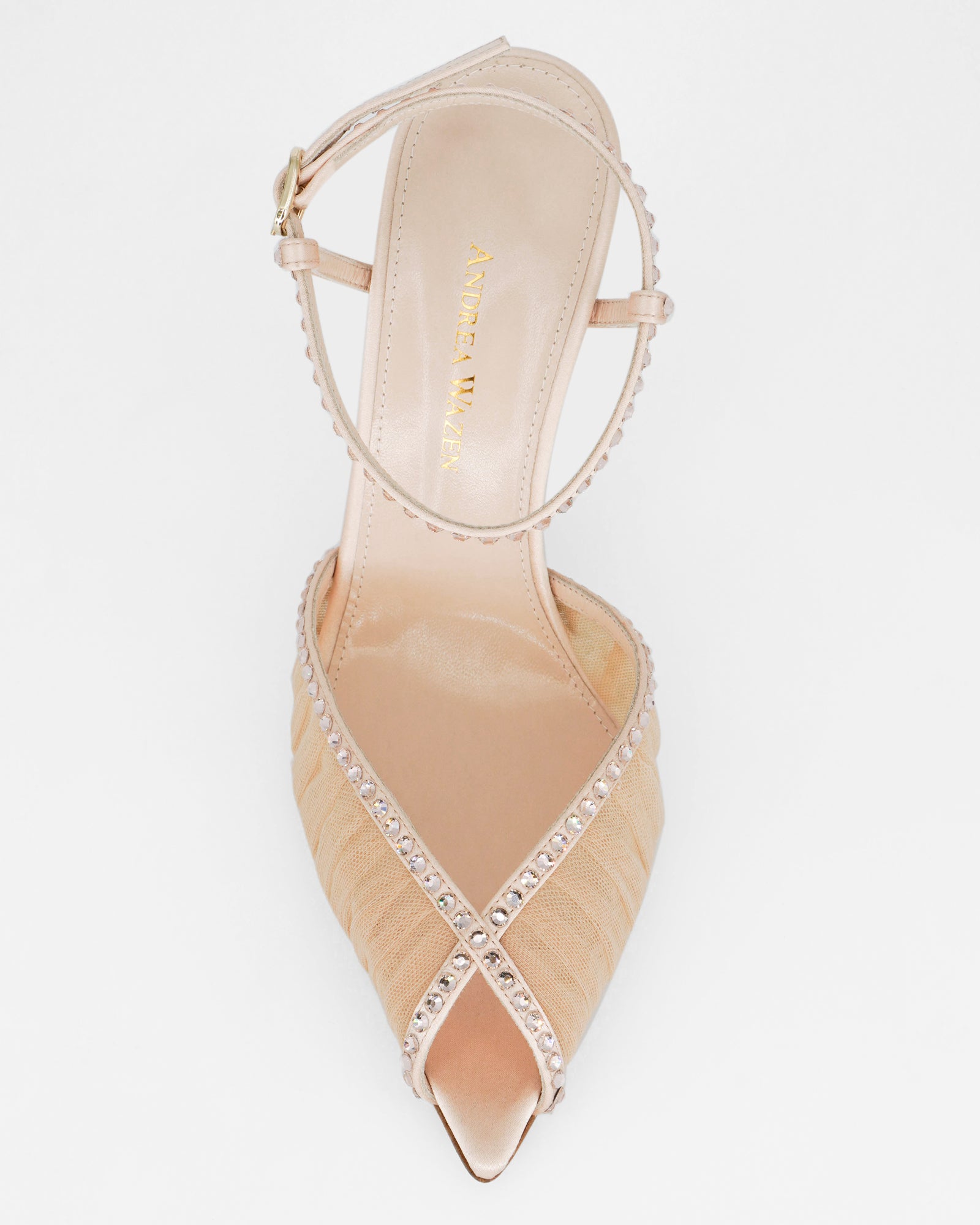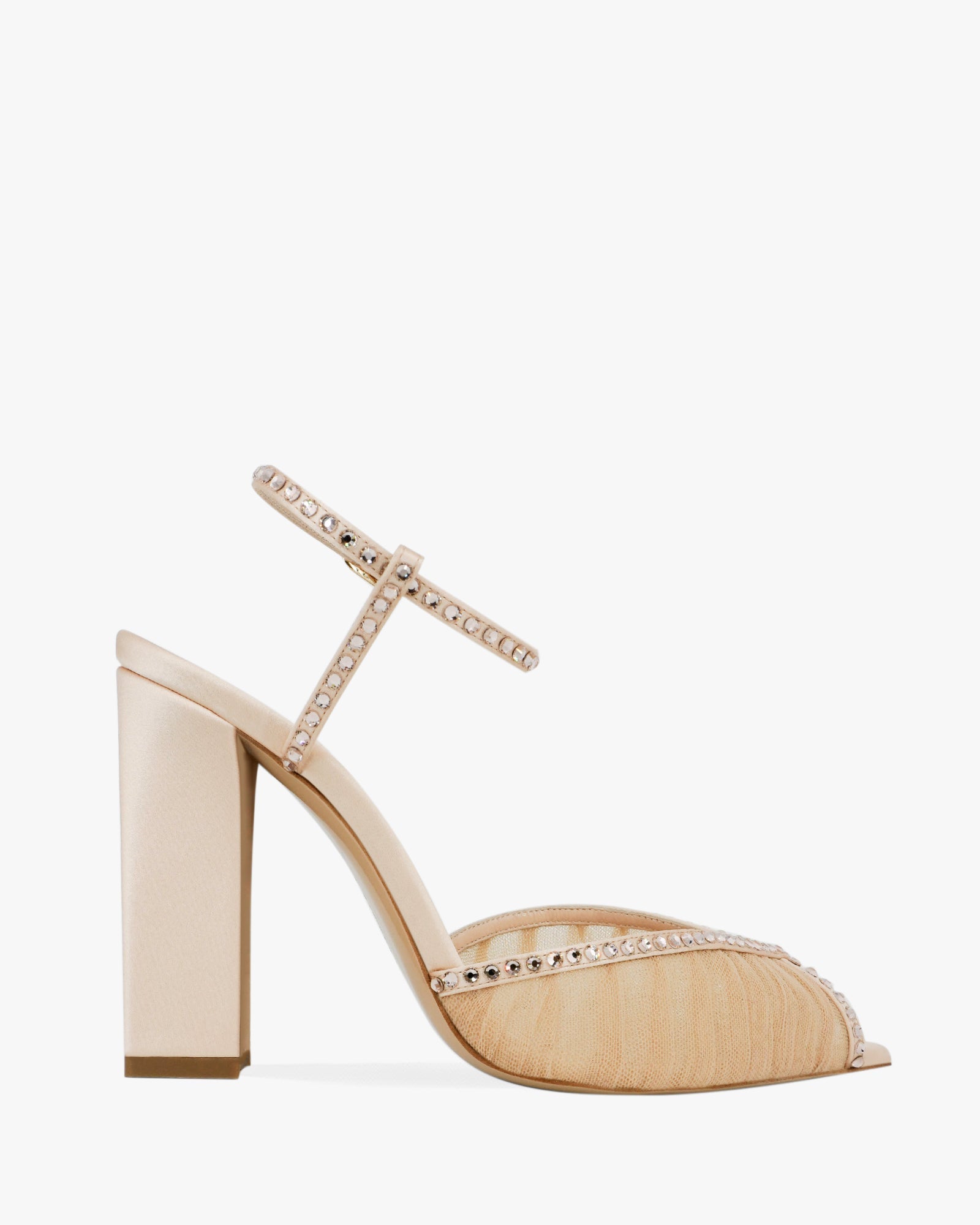The Andrea Wazen KATY BLOCK is a timeless pump that effortlessly combines sophistication and modernity. With an ankle strap, satin tulle, and crystal embellishments, this signature style stands out. Boasting a 105mm thic heel, an open and pointy toe, it strikes the perfect balance between elegance and contemporary design, making it a perfect choice from the designer's collection.