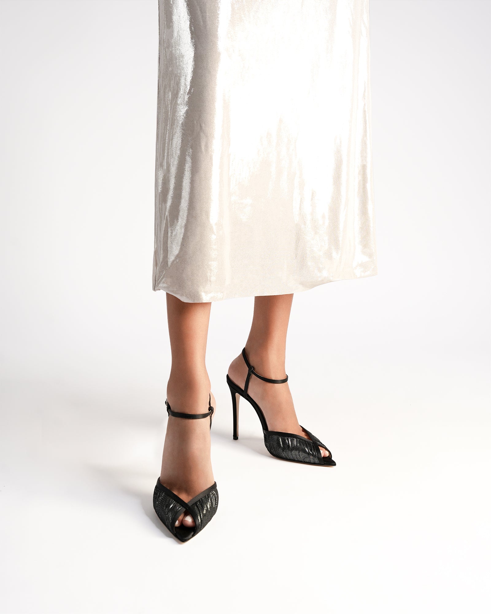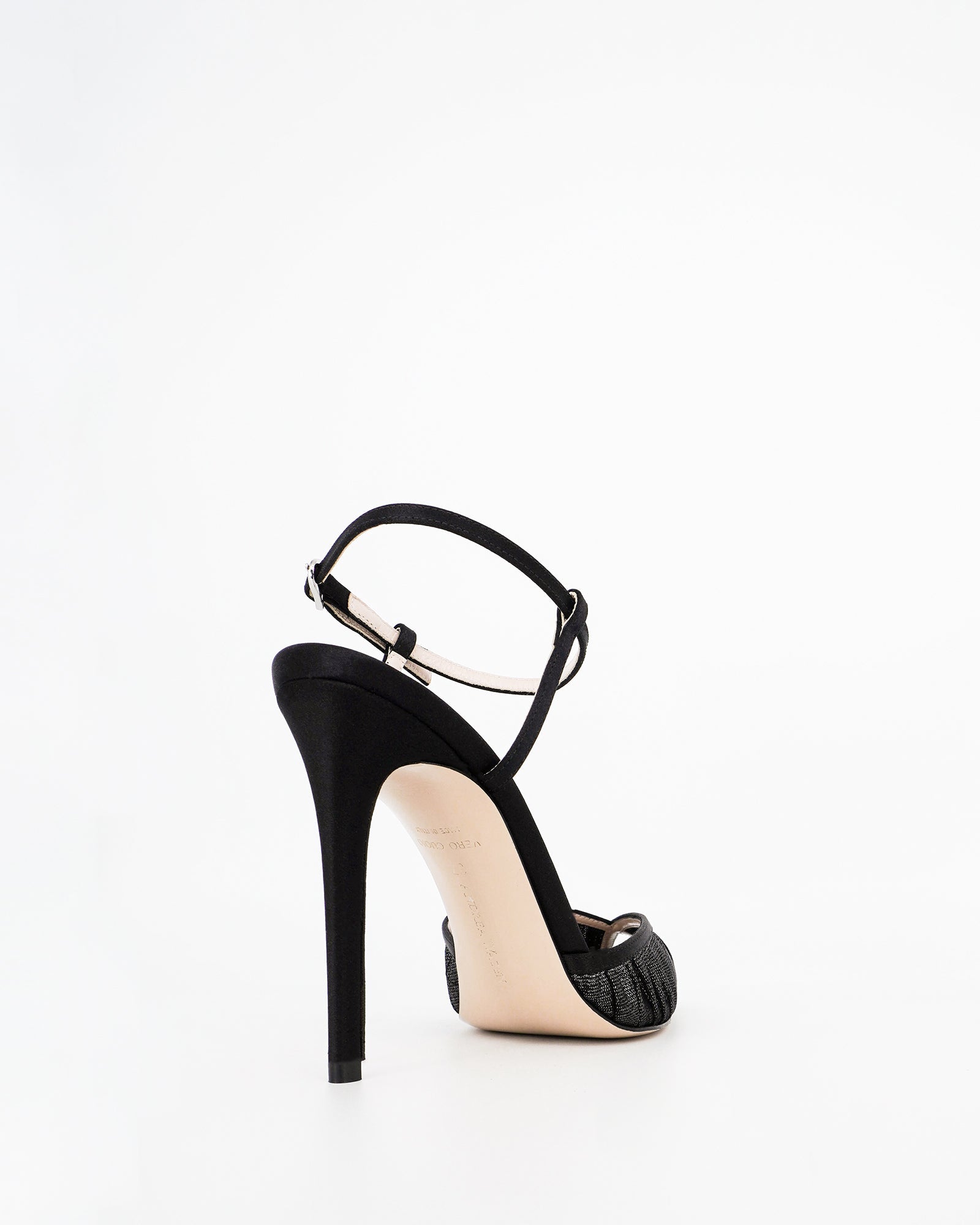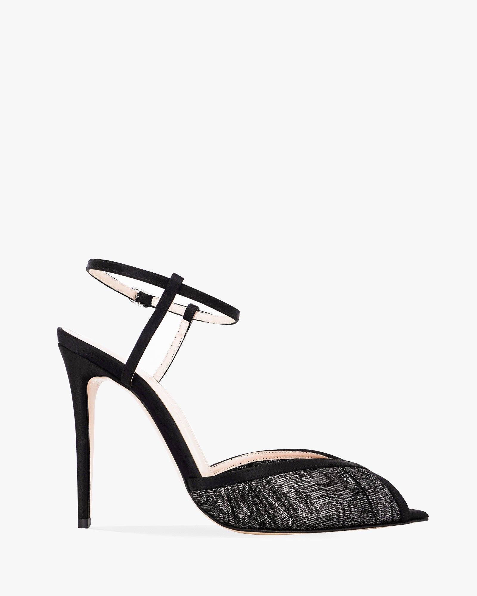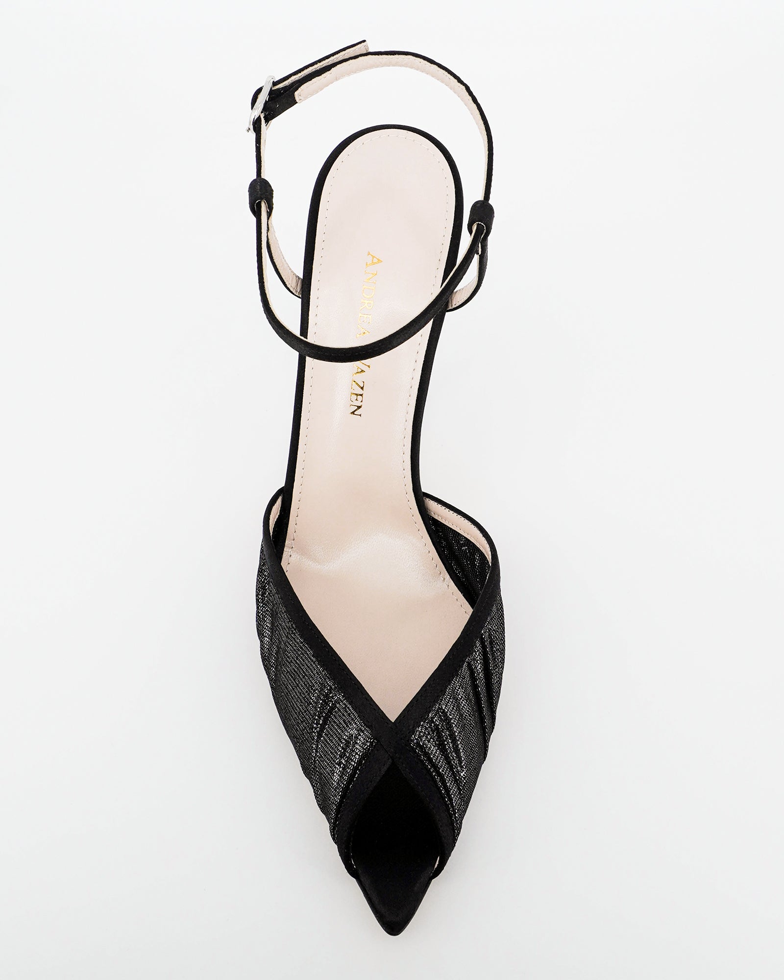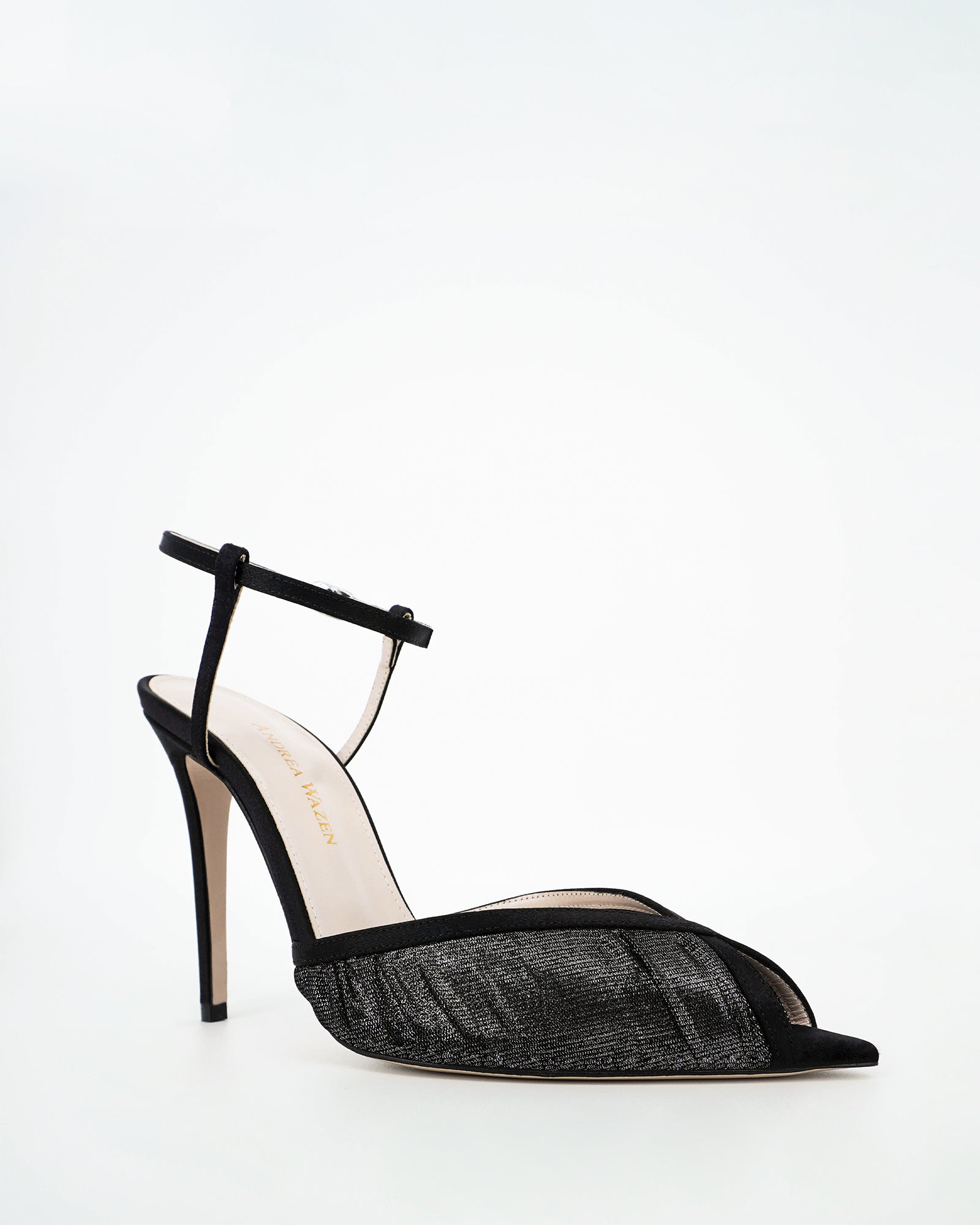 The Katy Laminato pump by Andrea Wazen combines satin and laminated tulle for a chic look. It features a delicate ankle strap and an open pointy toe. With a stiletto heel standing at 105 mm, these pumps are perfect for adding a touch of glamour to any outfit.