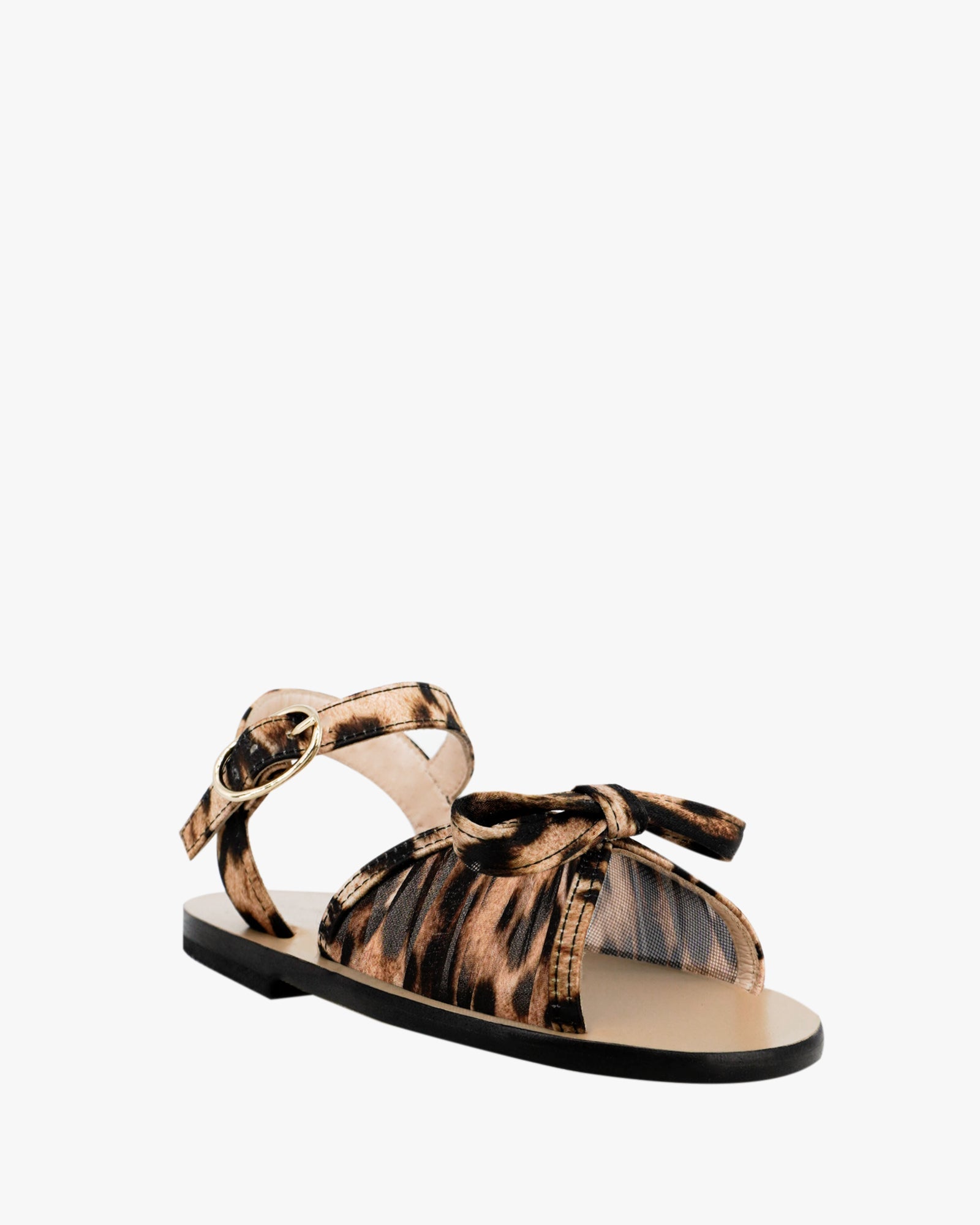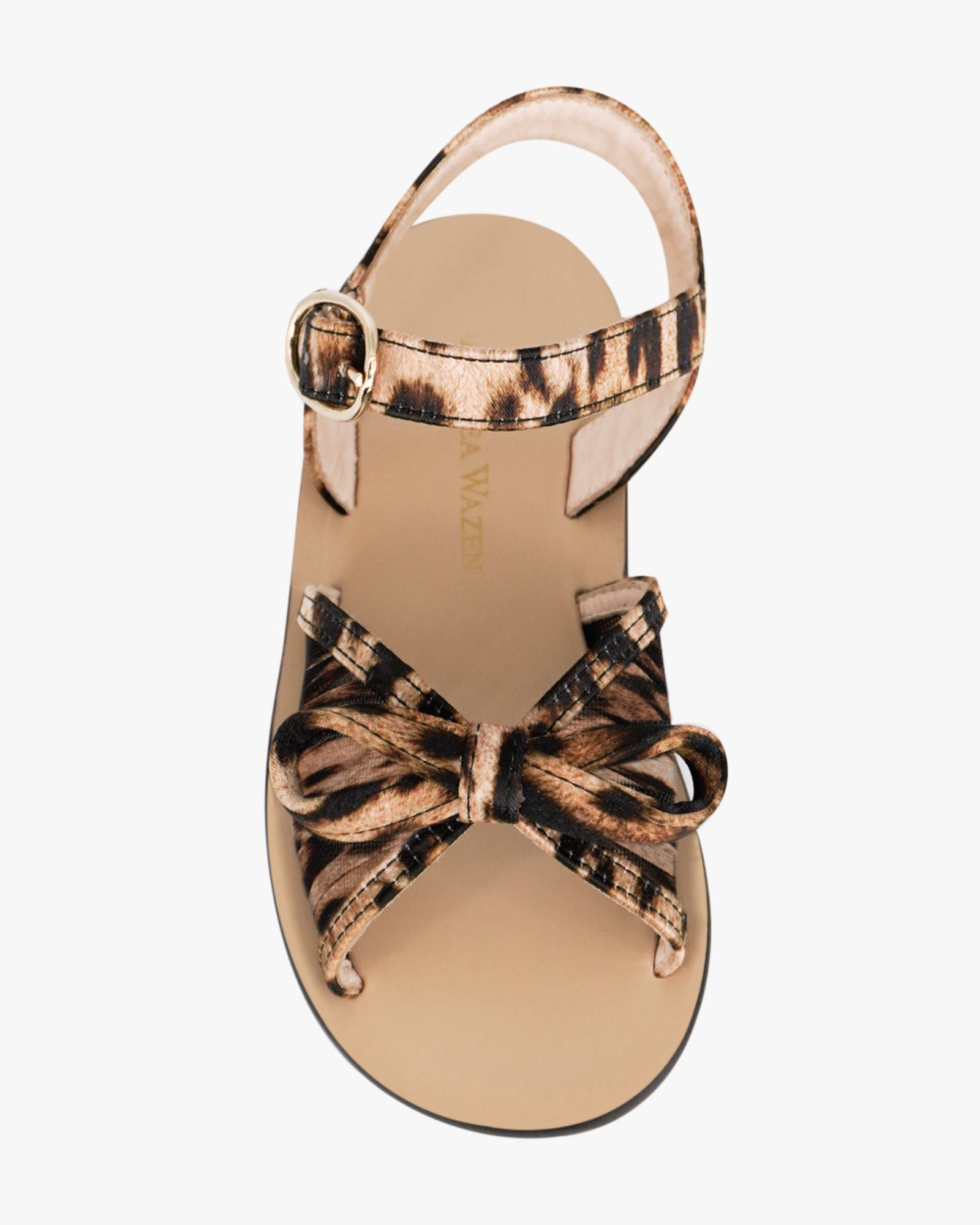 The Andrea Wazen KATY MINI LEOPARD Sandals for kids are crafted from luxurious leopard-print satin, combining playful style with sophisticated design. Featuring the brand’s signature bow, these charming sandals add a bold and fashionable touch to any special occasion.