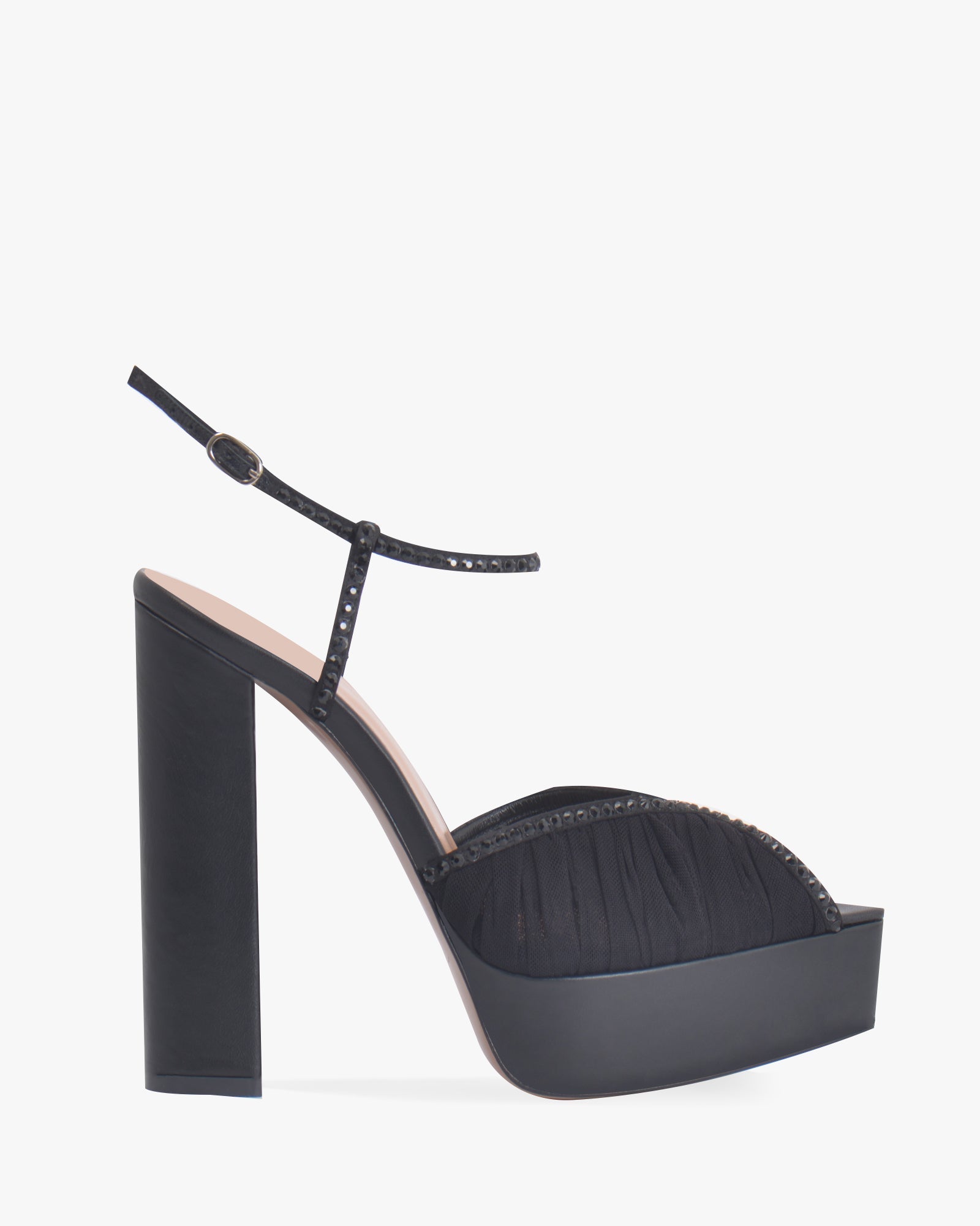 The Katy Platform stands tall at 150 mm, crafted from satin, tulle, and crystals. Designed to make a statement