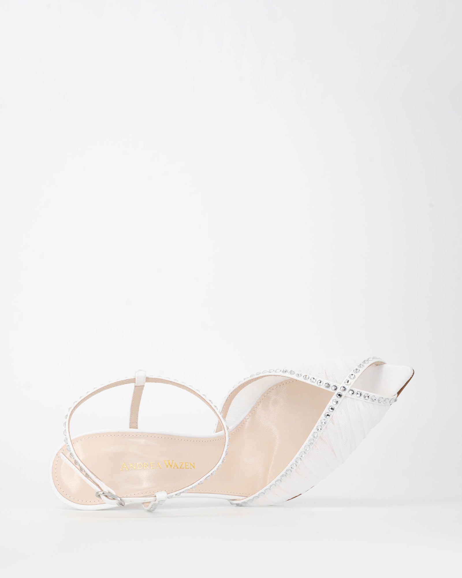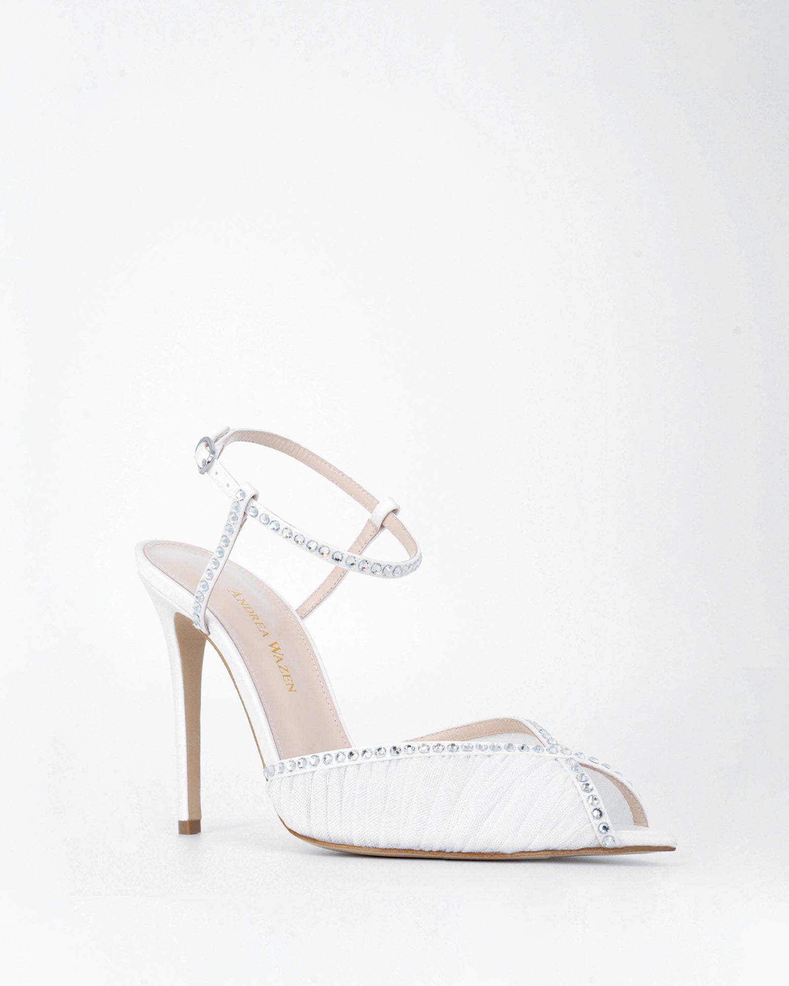 The Andrea Wazen KATY is a timeless pump that effortlessly combines sophistication and modernity. With an ankle strap, satin tulle, and crystal embellishments, this signature style stands out. Boasting a 105mm heel, an open and pointy toe, it strikes the perfect balance between elegance and contemporary design, making it a perfect choice from the designer's collection.