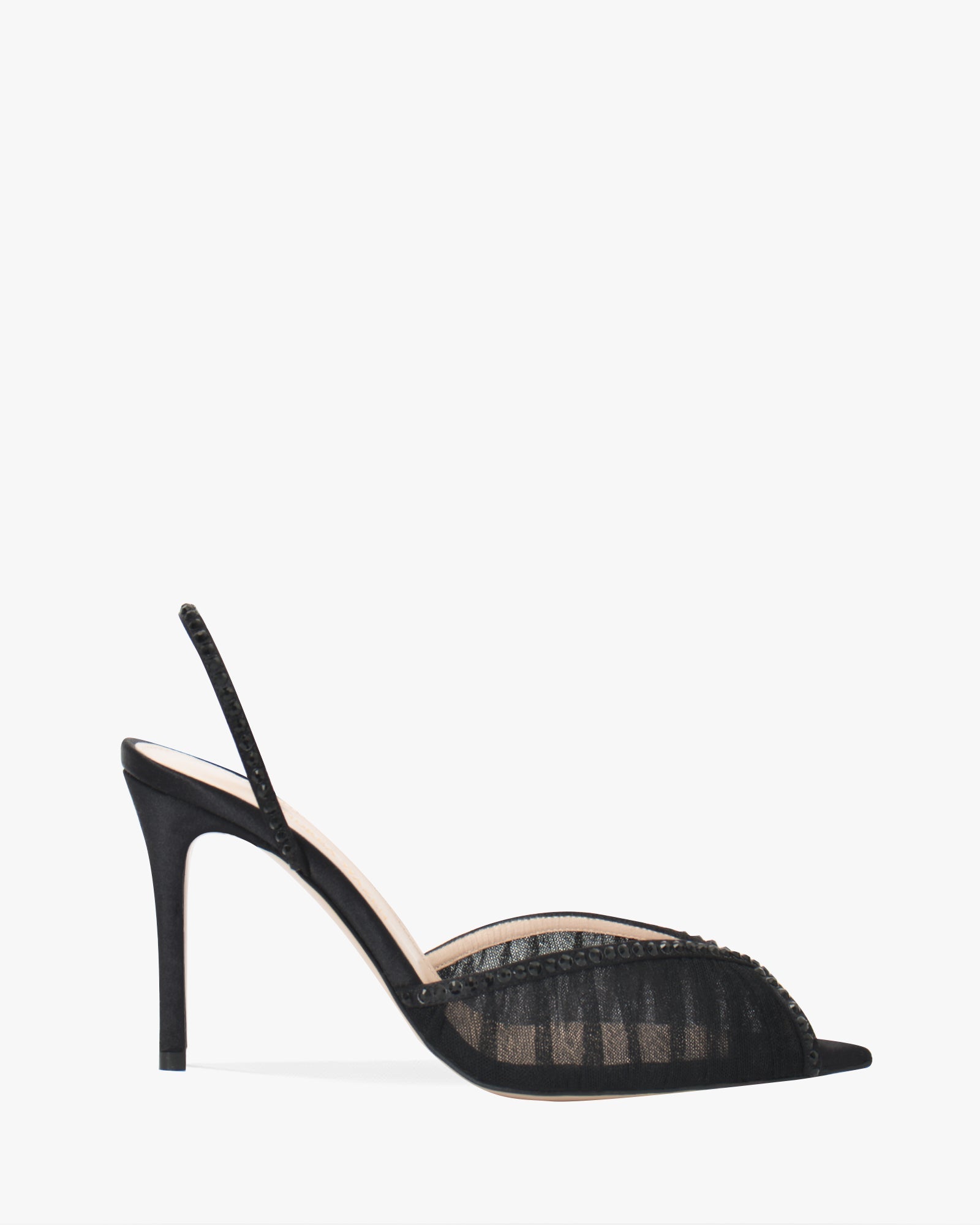 The Andrea Wazen KATY SLING is a modern marvel of elegance. This pump boasts a unique backward sling, crafted from luxurious satin tulle and adorned with crystals. With a 85mm heel, open toe, and pointed toe design, it effortlessly combines glamour with comfort. A signature style from Andrea Wazen, this style is a chic blend of contemporary fashion and timeless sophistication.