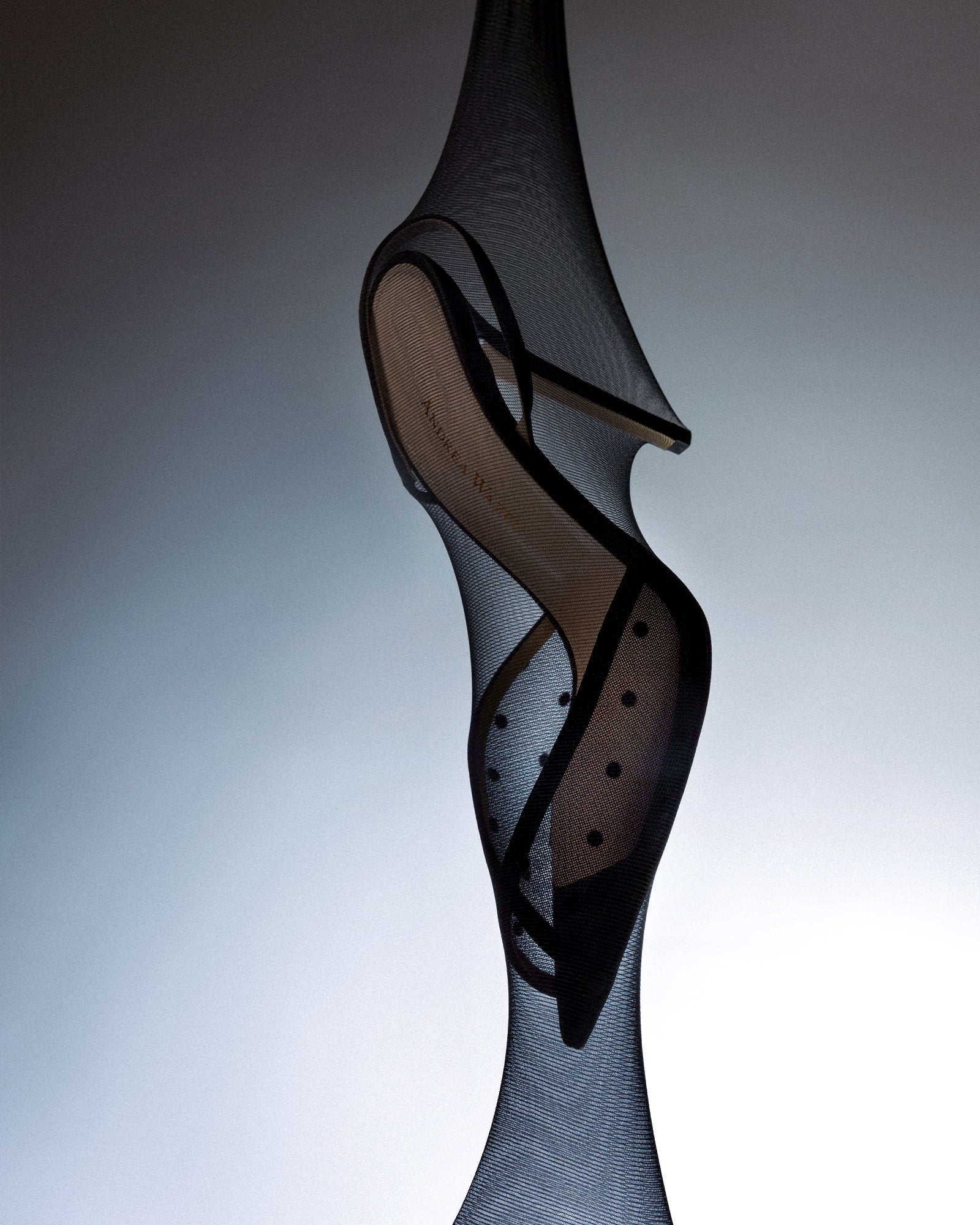 The KATY SLING BONBON combines satin and bonbon mesh for a playful look. It features a satin sling back strap and an open pointy toe. With a stiletto heel standing at 105 mm.