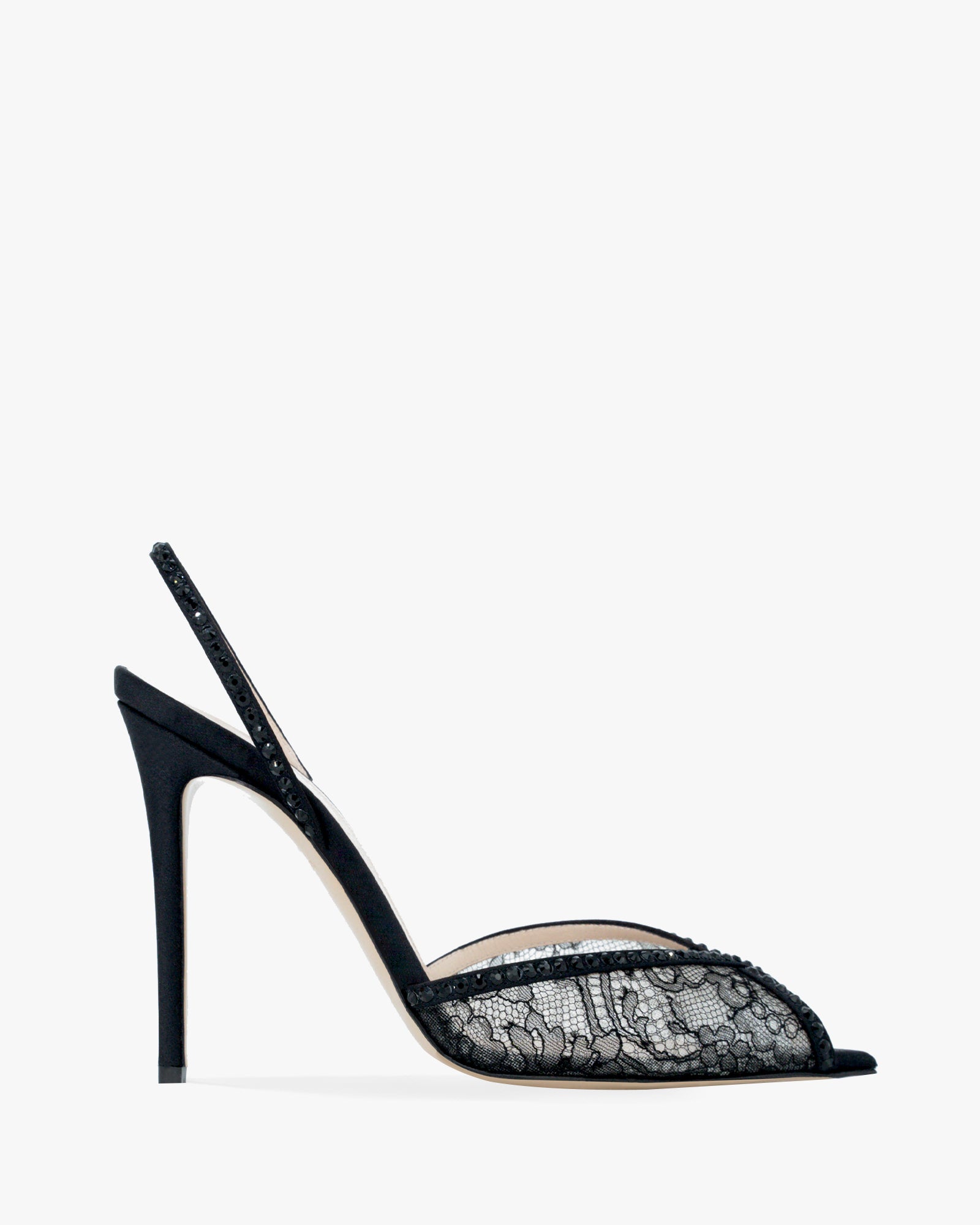 The KATY SLING LACE style epitomizes elegance. Featuring an open toe and meticulously crafted with pleated hand-cut lace, a silky mesh surface, and shimmering crystals, this shoe adds a touch of sophistication to your ensemble.