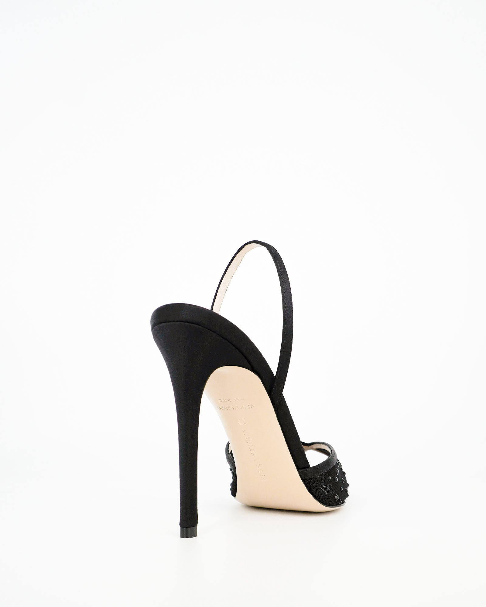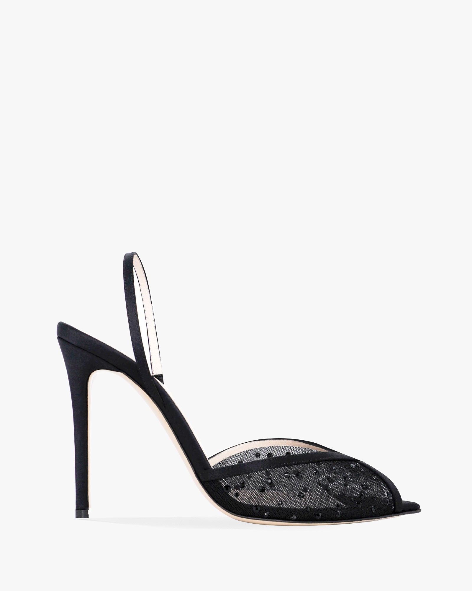 The iconic Andrea Wazen Katy Sling Mesh Glitz is reimagined in satin mesh and crystals, featuring a 105 mm heel, open pointy toe, and timeless elegance, perfect for evening occasions and bridal moments.