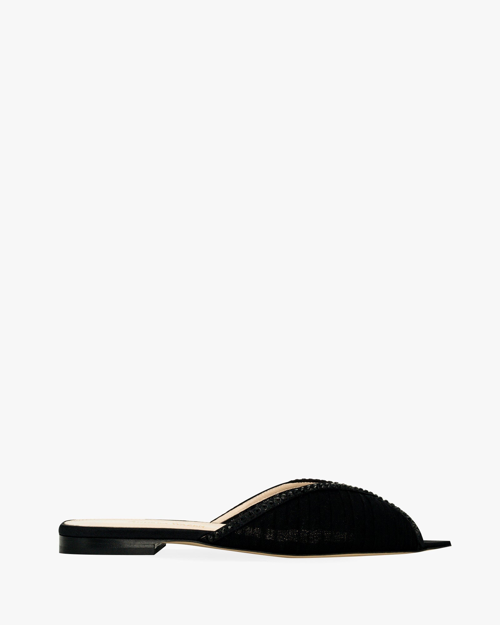 Step into style and comfort with the Andrea Wazen KATY FLAT. This chic flat version of the Katy pump maintains its elegance with satin tulle and crystal details. With a low 20mm heel, open and pointy toe, it's a stylish and easy-to-wear option for any occasion. Effortlessly blending luxury with comfort, this style is a must-have in Andrea Wazen's collection.