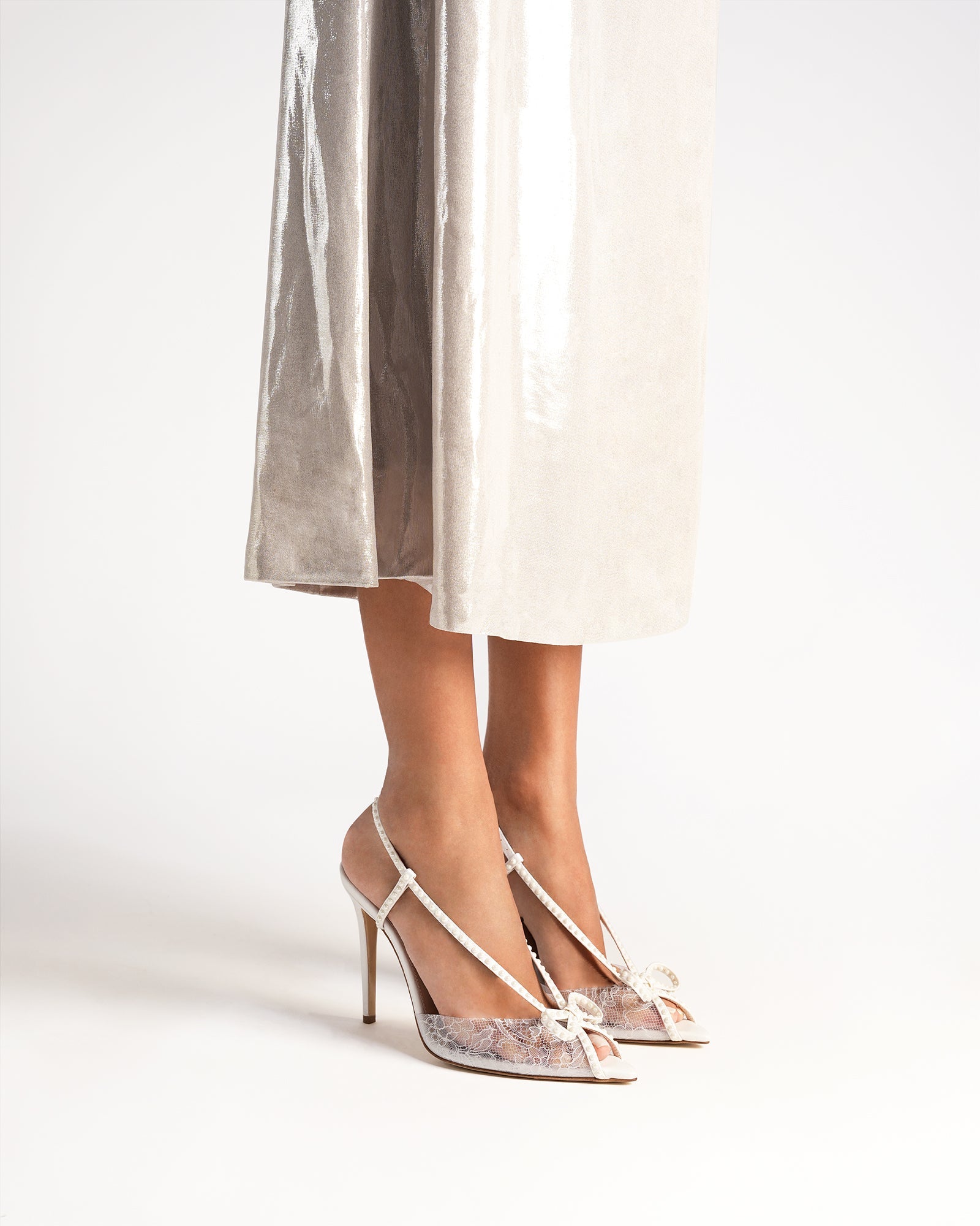 Inspired by the sandy beaches of Capri, this season's rendition of the KAY LACE style is a true testament to coastal allure. Uniquely crafted with a bow knot, this pointy toe and stiletto heel add a touch of sophistication. The infusion of lace under the PVC layers and addition to Pearl cabochon beads give the shoe a sophisticated seaside charm.