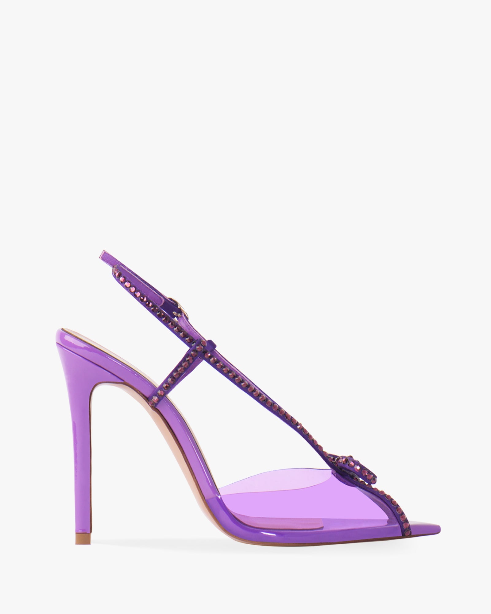 It is designed with patent leather, a pointy toe and mounted on a stiletto heel.