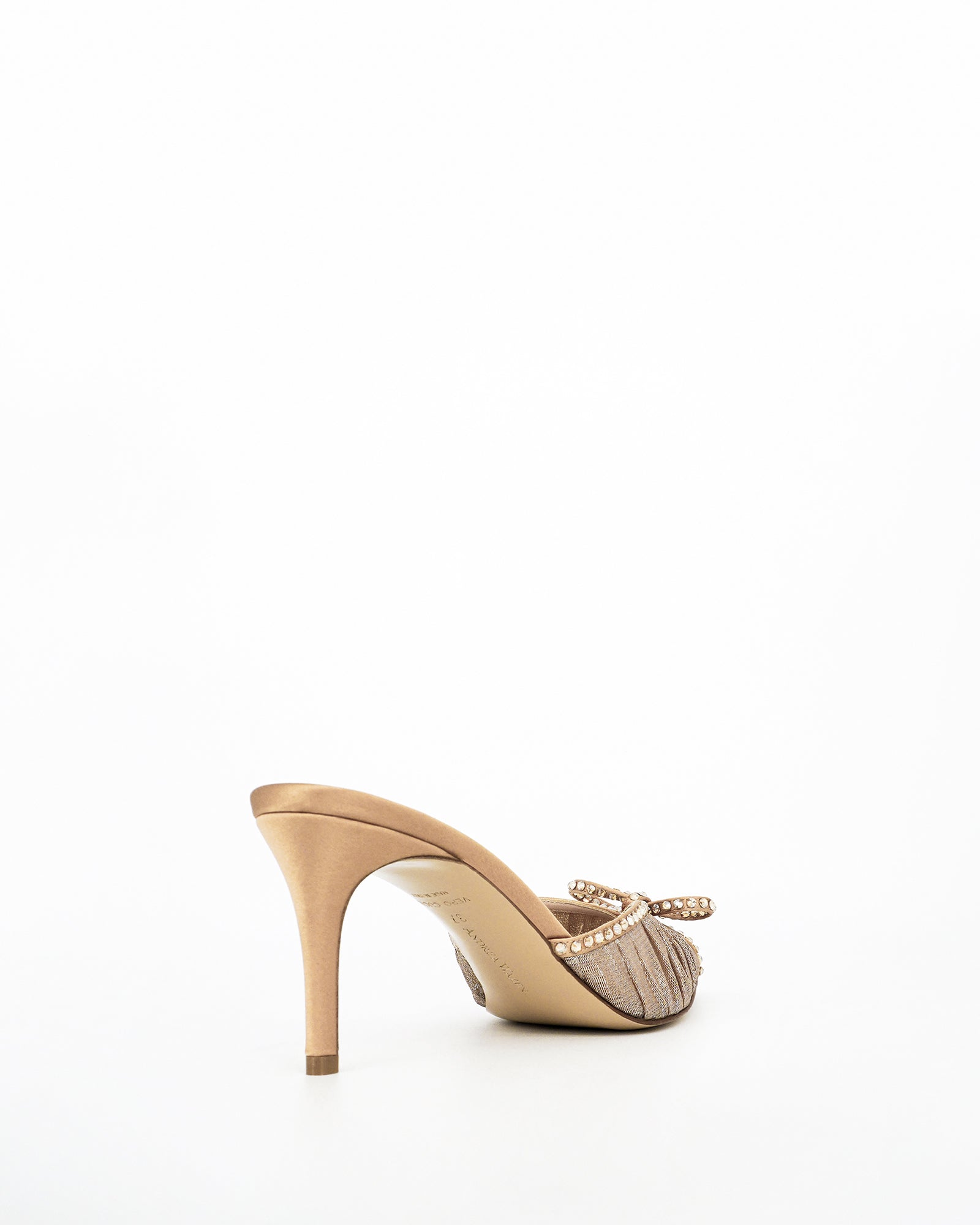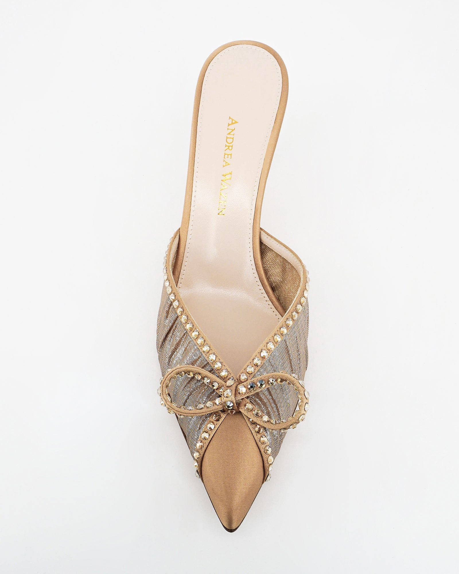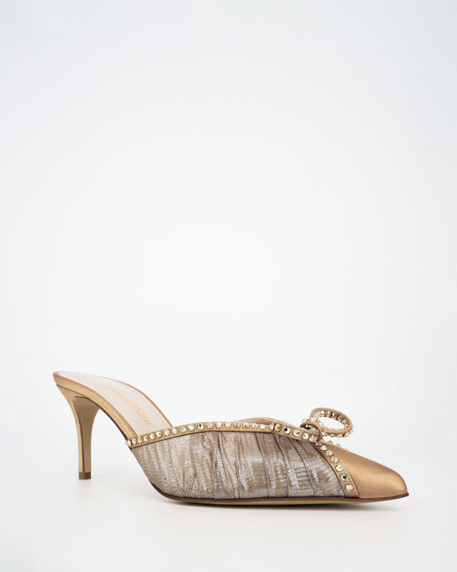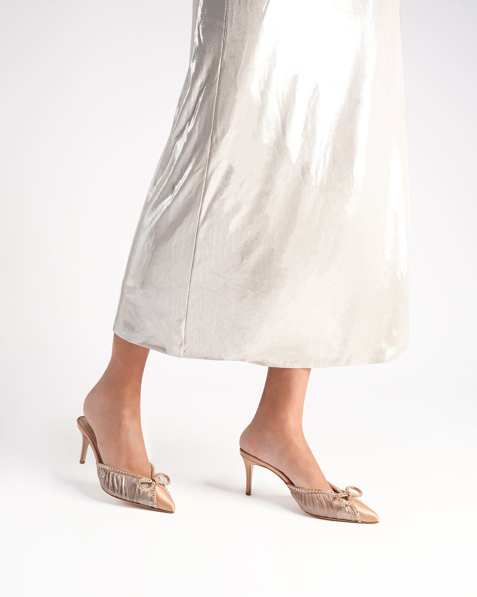 The KRIS MULE LAMINATO is a laminated version of the kris mule. This exquisite mule style stands tall on a 75mm heel, made from luxurious satin and shimmery laminated tulle with crystals on the upper, elevating the allure of the shoe to new heights. The mule is adorned with a lavish satin bow on the upper, adding a touch of romantic charm and whimsy.