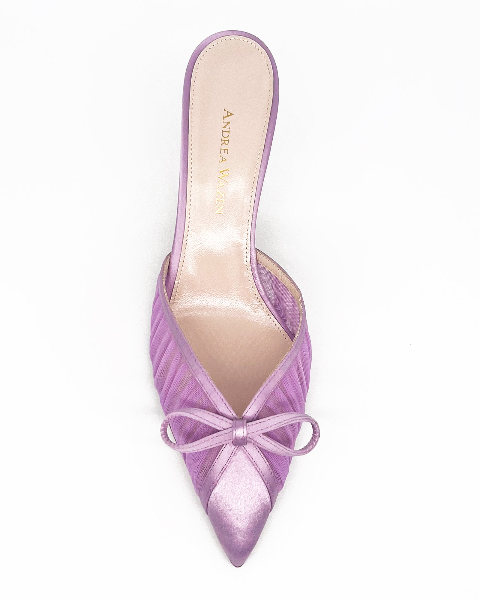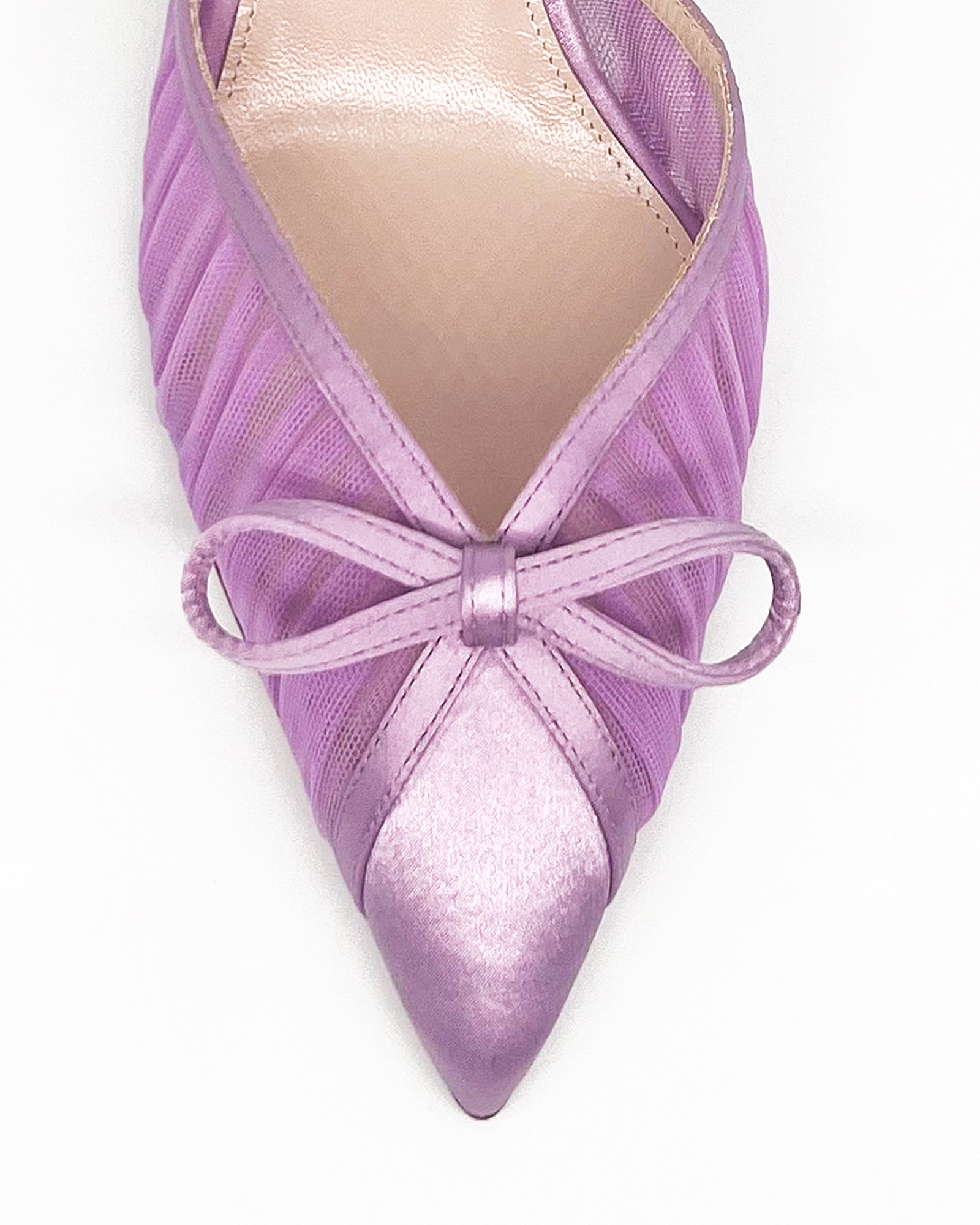 The KRIS MULE is a testament to refined femininity and modern elegance. This exquisite mule style stands tall on a 75mm heel, made from luxurious satin and delicate tulle elevating the allure of the shoe to new heights. The mule is adorned with a lavish satin bow on the upper, adding a touch of romantic charm and whimsy.