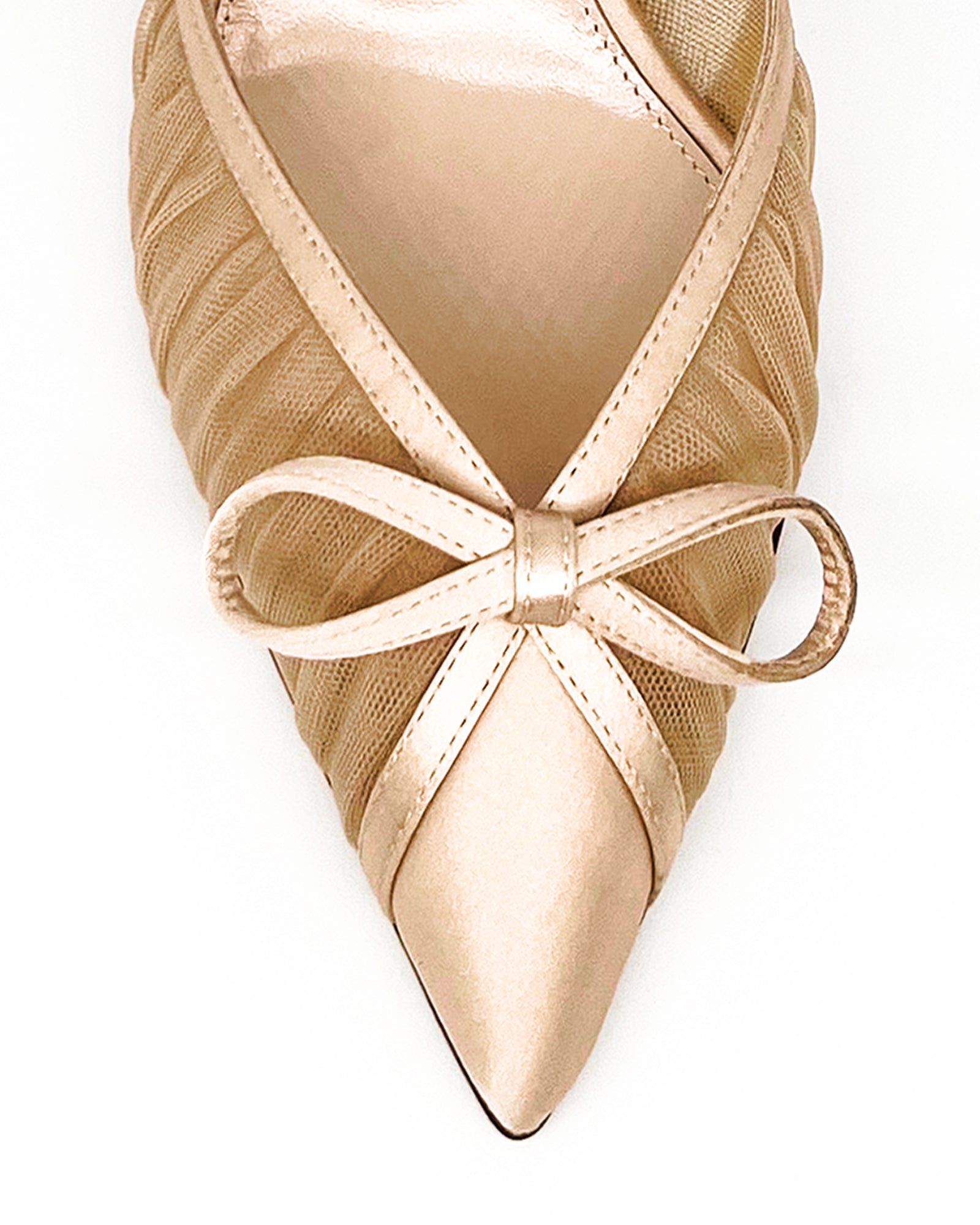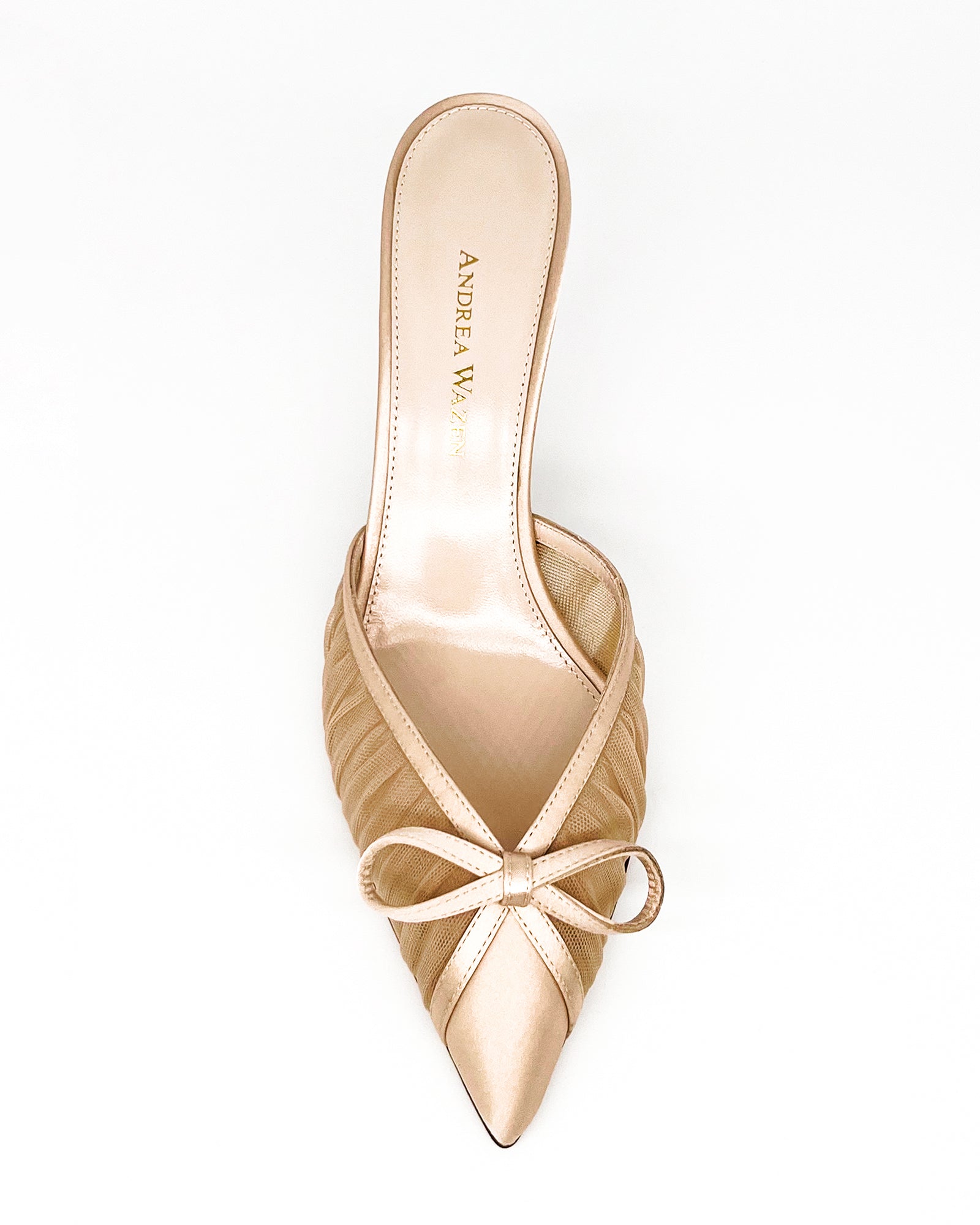 The KRIS MULE is a testament to refined femininity and modern elegance. This exquisite mule style stands tall on a 75mm heel, made from luxurious satin and delicate tulle elevating the allure of the shoe to new heights. The mule is adorned with a lavish satin bow on the upper, adding a touch of romantic charm and whimsy.