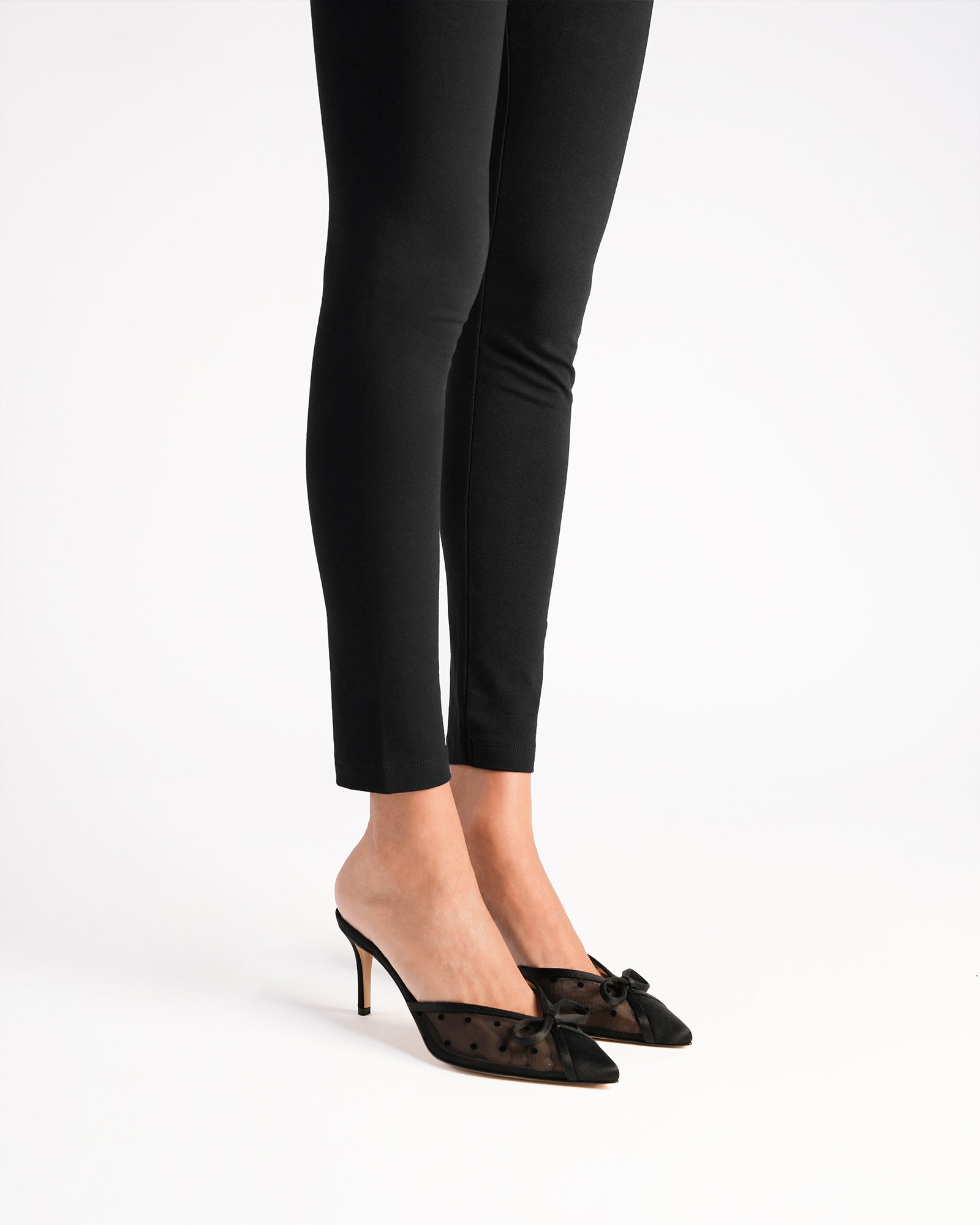 The KRIS MULE BONBON combines satin and bonbon mesh for a playful look. It features a satin bow on the upper and an closed toe. With a kitten heel standing at 75 mm.
