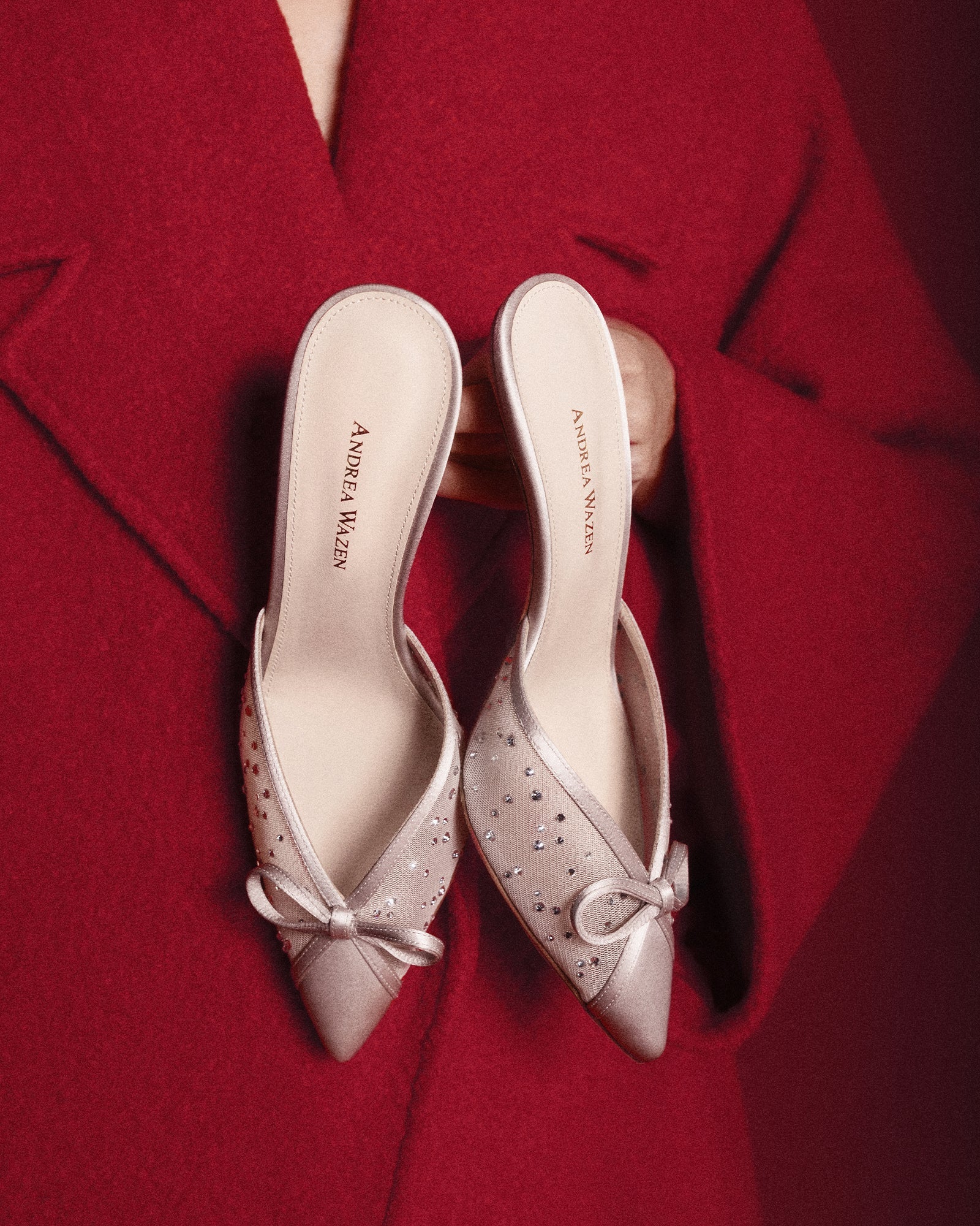The Andrea Wazen Kris Mule Mesh Glitz redefines elegance with its 75 mm heel, closed-toe design, and satin with mesh adorned with crystals. The signature bow on the upper adds a touch of timeless charm.