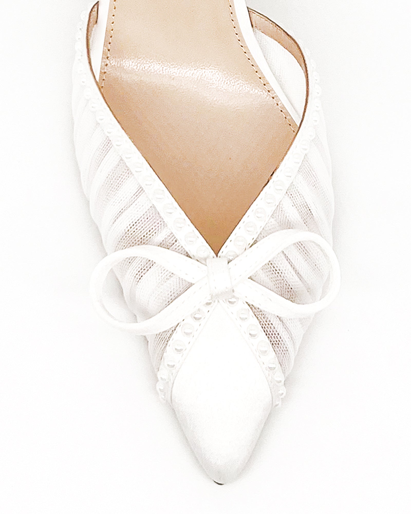 The Andrea Wazen KRIS PEARL MULE is a stunning combination of satin, tulle, and pearls, standing tall on a 105mm heel. With a closed toe and a satin bow detail, it exudes elegance and charm. Perfect for those who seek sophistication with a touch of glamour.