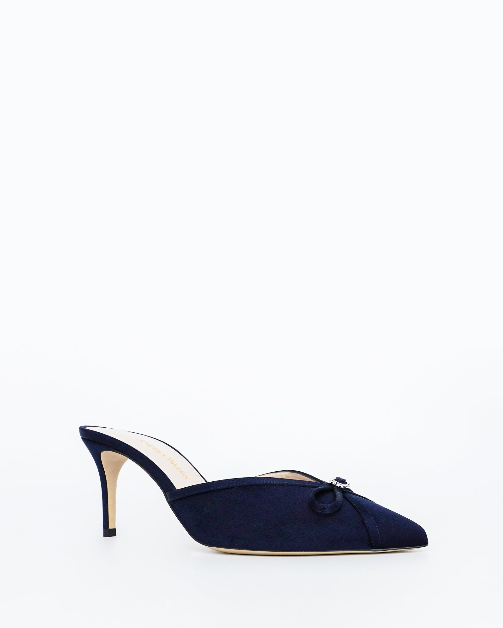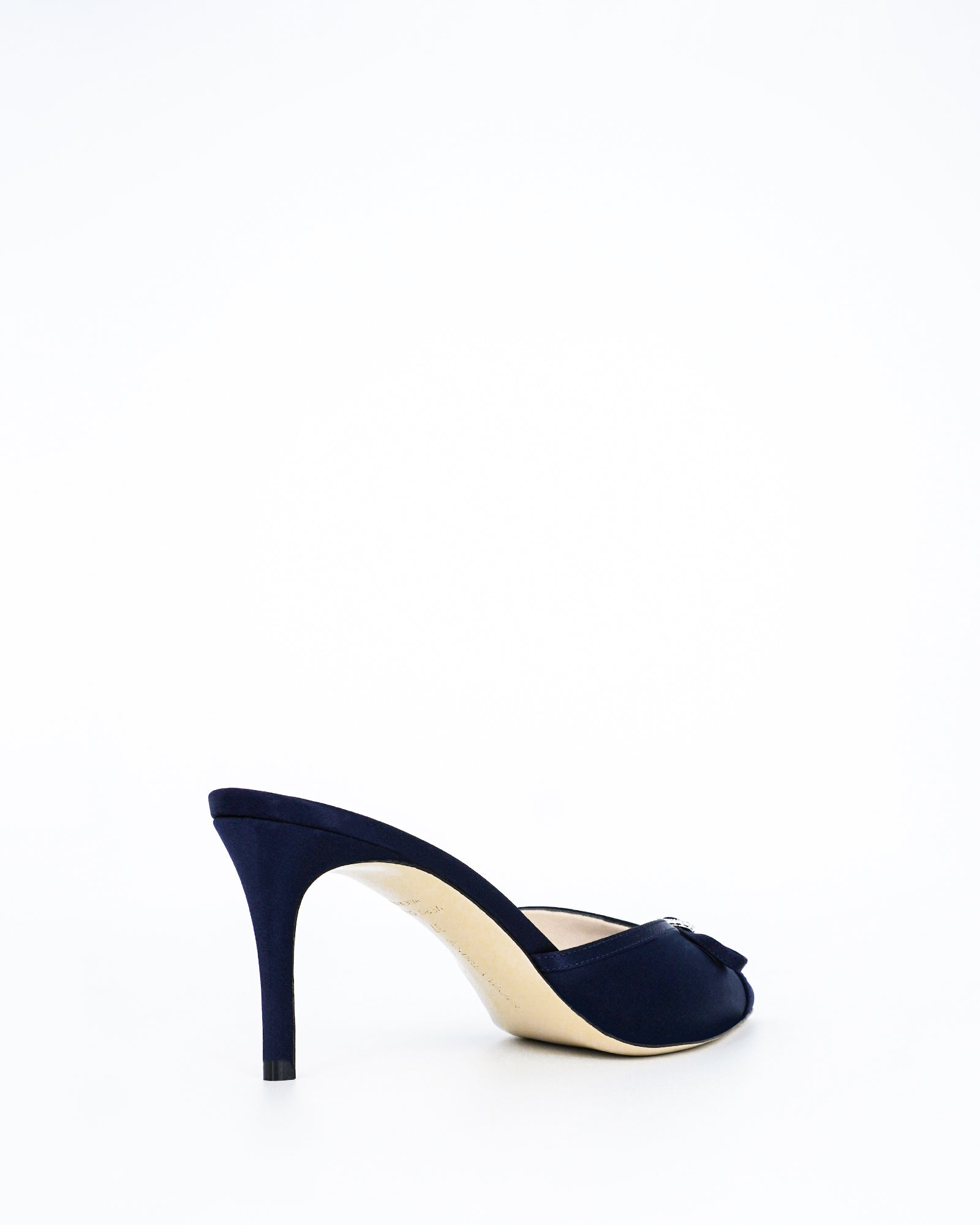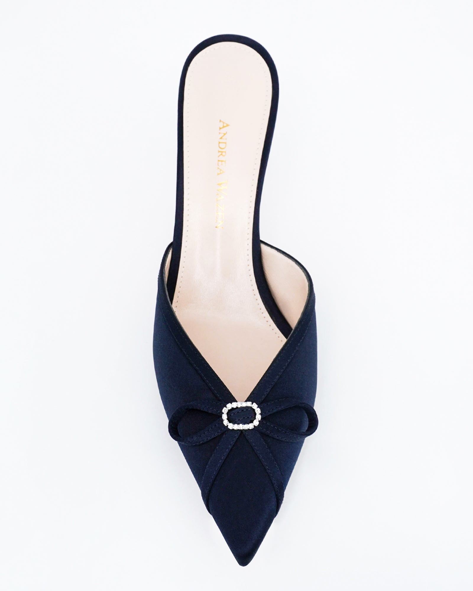 The LANA MULE by Andrea Wazen exudes elegance, combining luxurious materials and timeless design. Crafted from luxurious satin these mules feature a bow and a crystal buckle on the front, adding a touch of feminine glamour. The 75 mm heel provides a comfortable lift, while the closed-toe design ensures a sleek and polished look, making the Lana a perfect choice for both special occasions and stylish everyday wear.