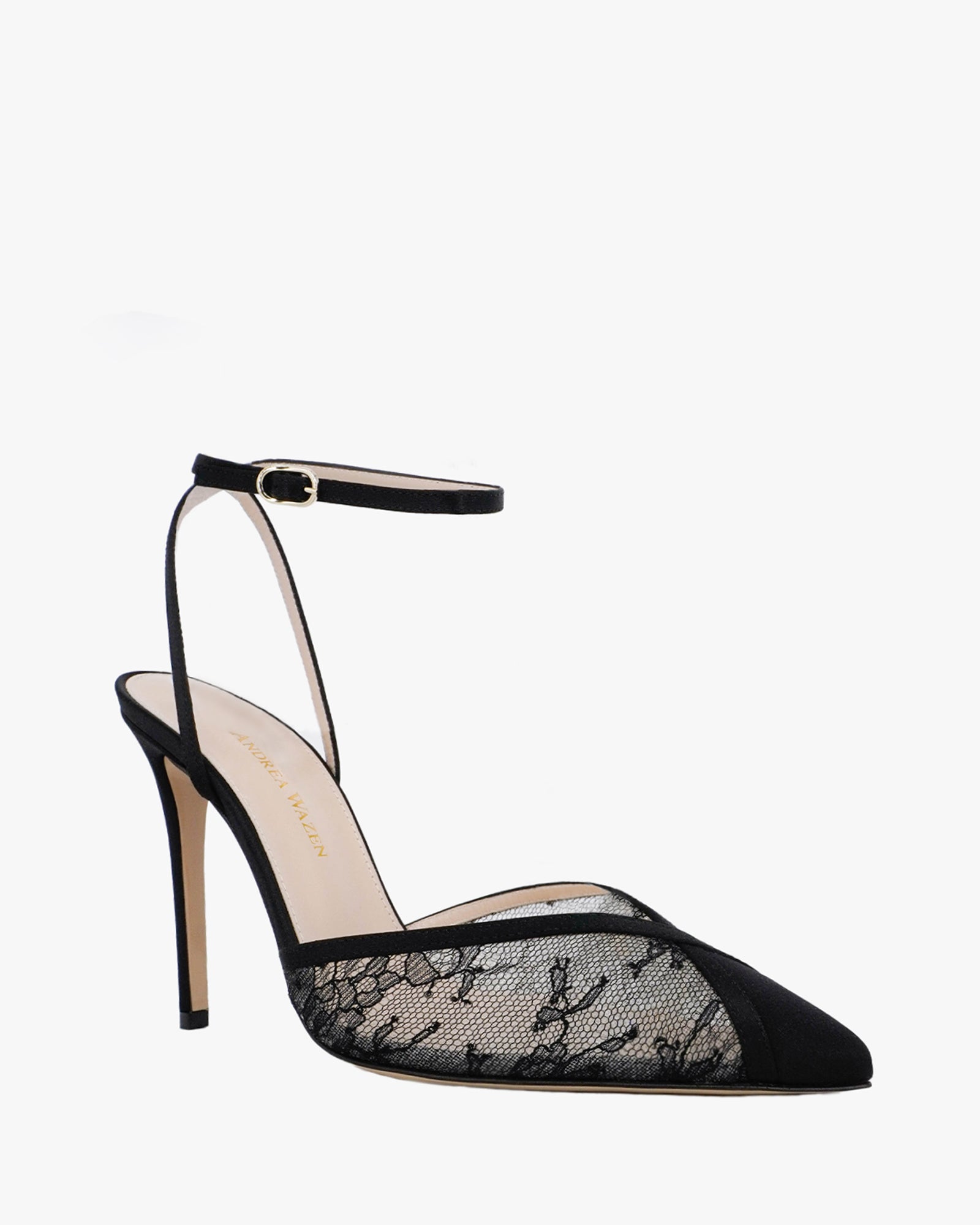 The Lenny pump by Andrea Wazen features a sleek closed pointy-toe silhouette crafted from satin and lace. The upper is finished with the brand’s signature cross design, adding a refined and feminine touch. Set on a slender 105 mm heel, Lenny offers elegant height and a timeless look, perfect for evening wear and special occasions.
