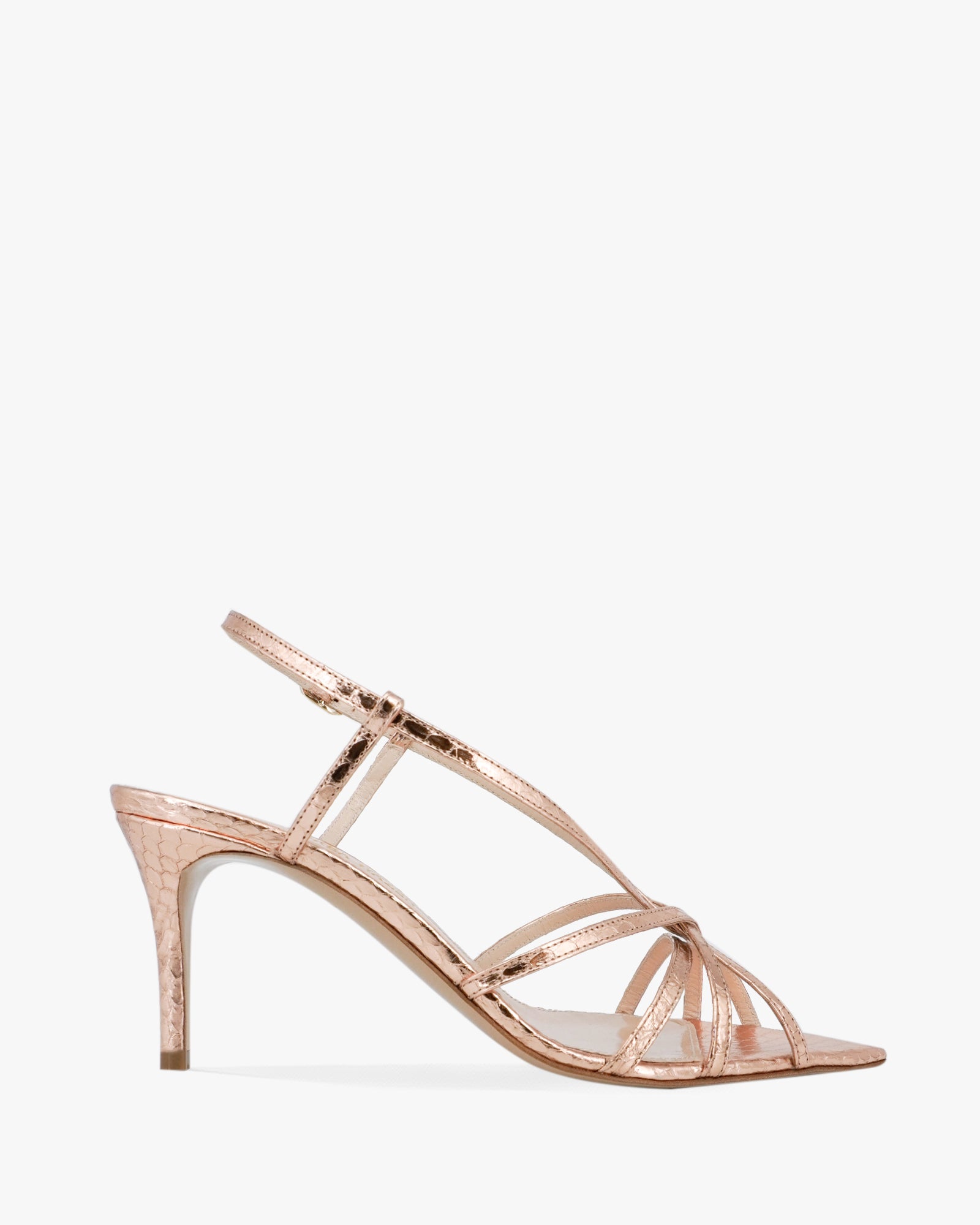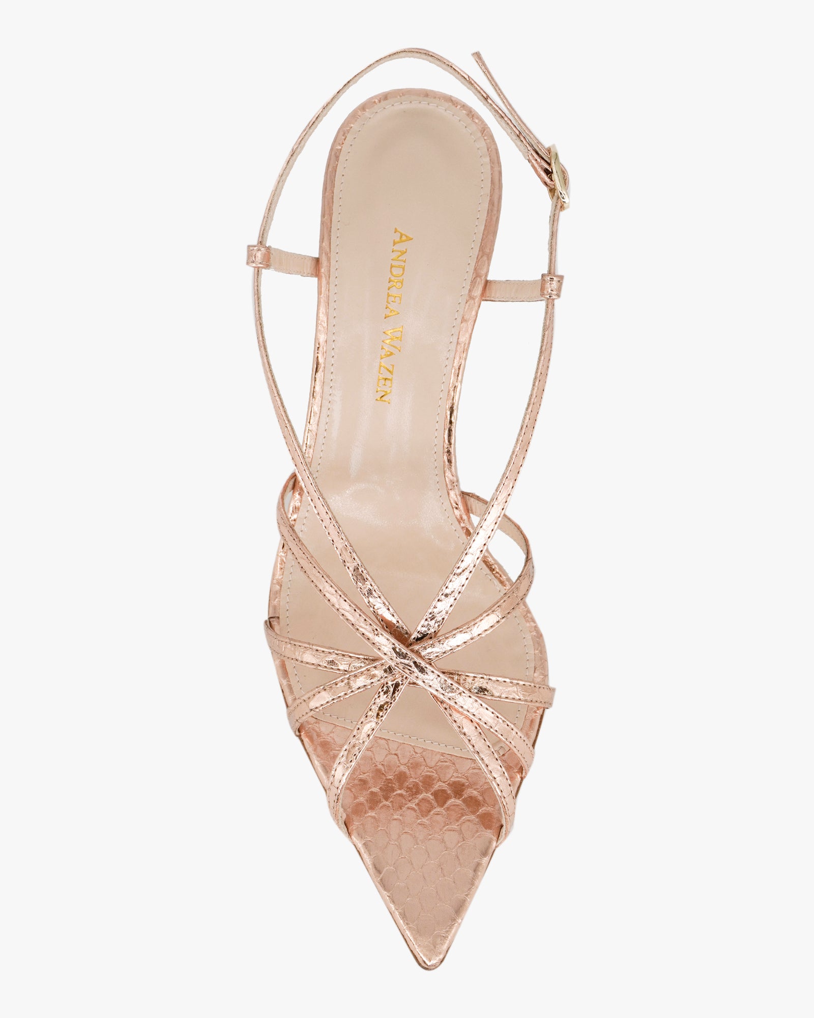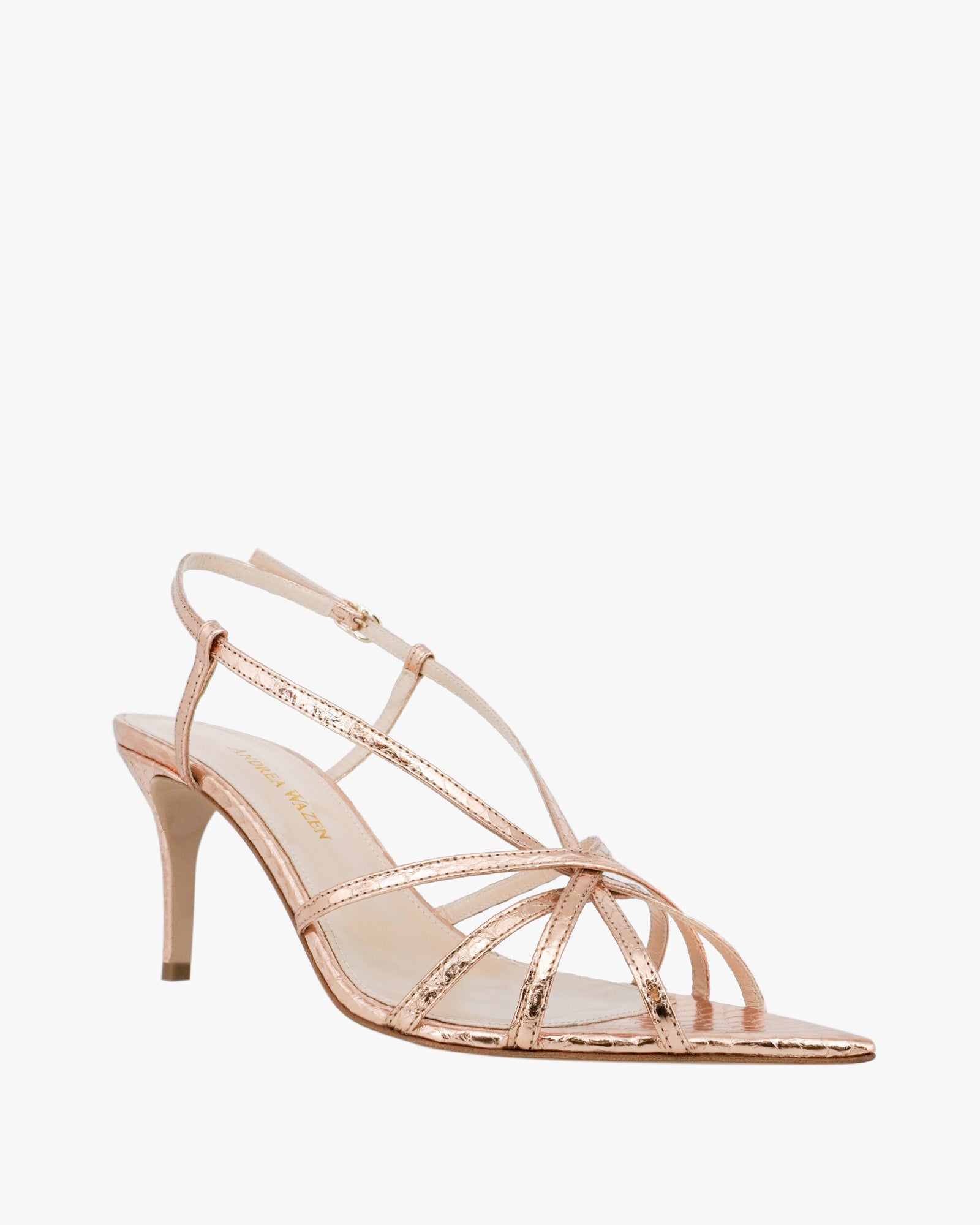 The Marylin sandal by Andrea Wazen is a refined strappy style with a modern edge. Crafted from metallic watersnake-embossed leather, this design features delicate straps that wrap elegantly across the foot. Set on a slim 75 mm heel, Marylin offers comfortable height with a polished finish, making it ideal for both daytime elegance and evening occasions.
