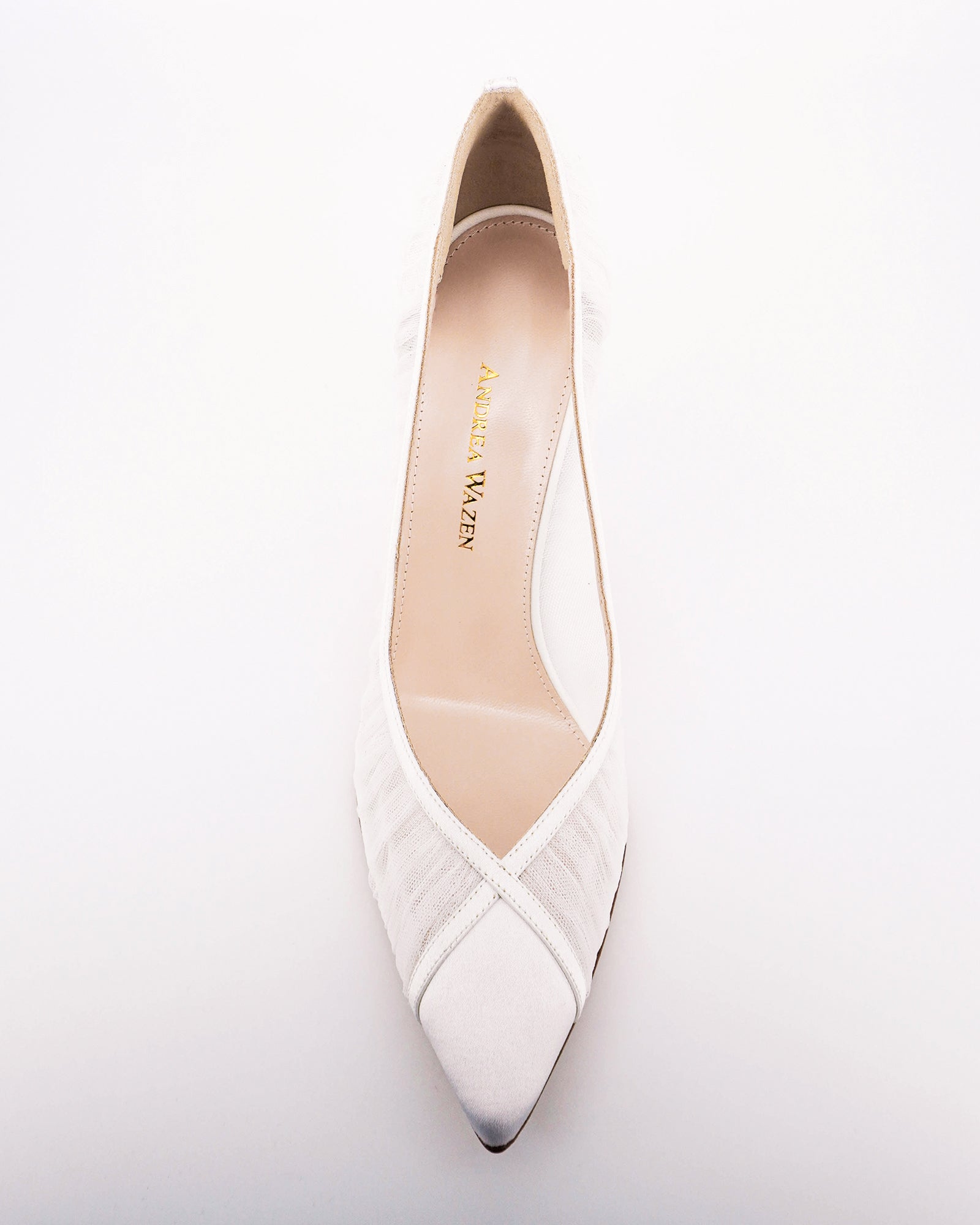 The NORA PUMP by Andrea Wazen is a timeless and elegant shoe. Made of luxurious satin, it features slightly see-through tulle on the sides, adding a touch of delicacy. The closed, pointy toe design enhances its classic appeal, making it a perfect choice for both formal and chic occasions.