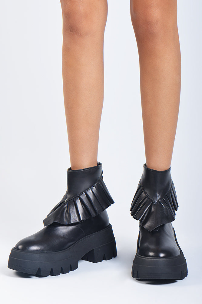 These ankle-height biker boots feature a sturdy 65mm heel that ensures both comfort and a touch of elevation. Crafted from high-quality leather, they exude durability and timeless elegance. The pleated ruffles that adorn the boot's exterior, add a unique and eye-catching twist to the classic biker design. With their thick heel and distinctive detailing, the ROUCHES BIKER boots make a bold fashion statement that's perfect for those who want to embrace their edgy side.