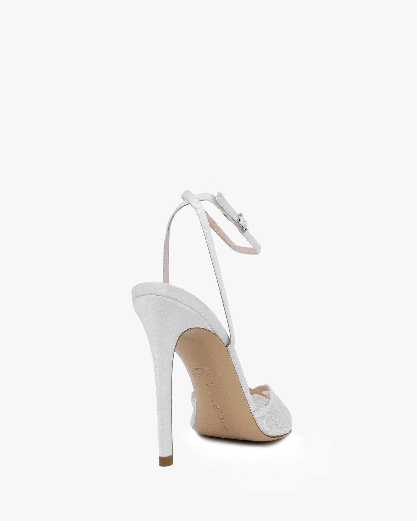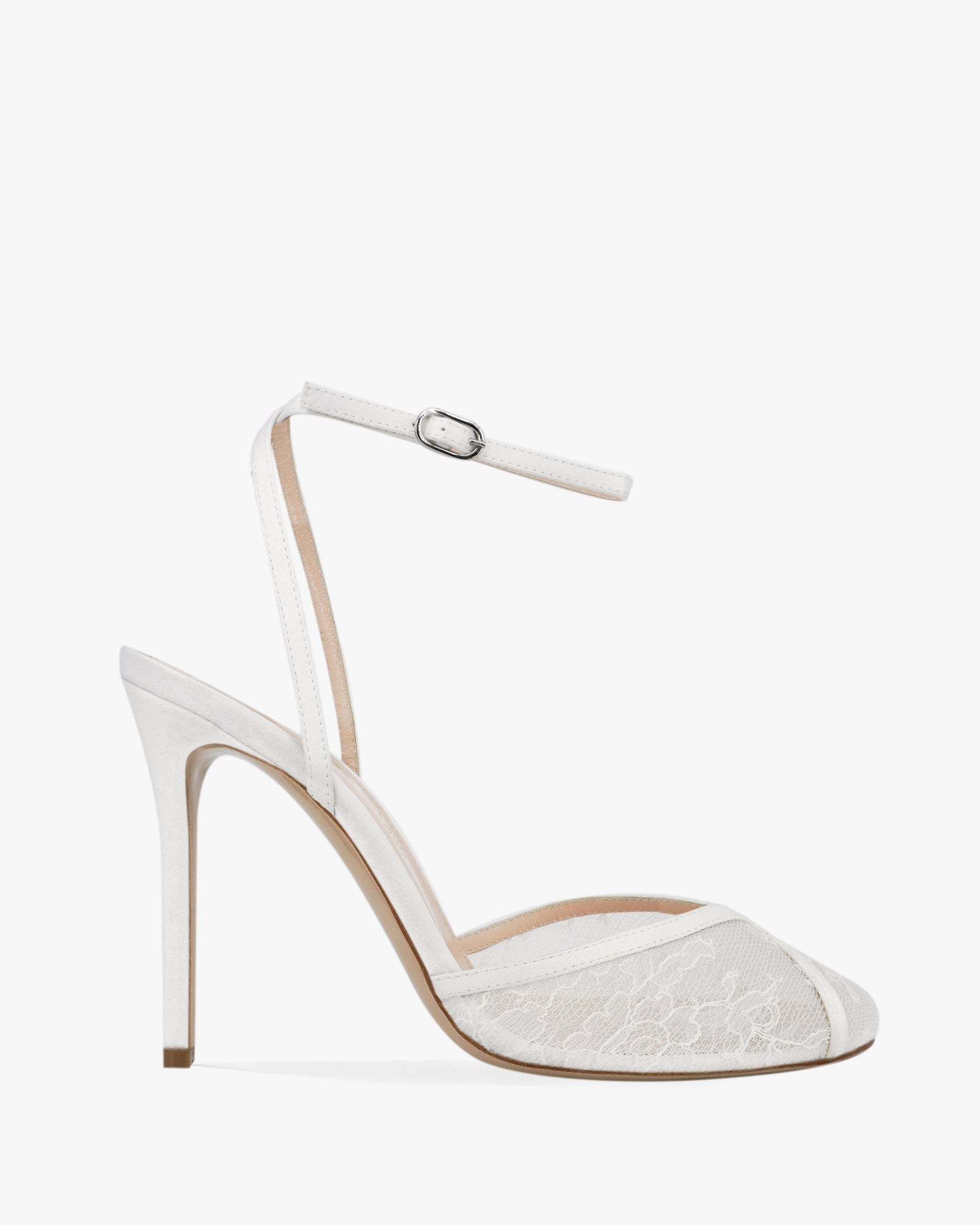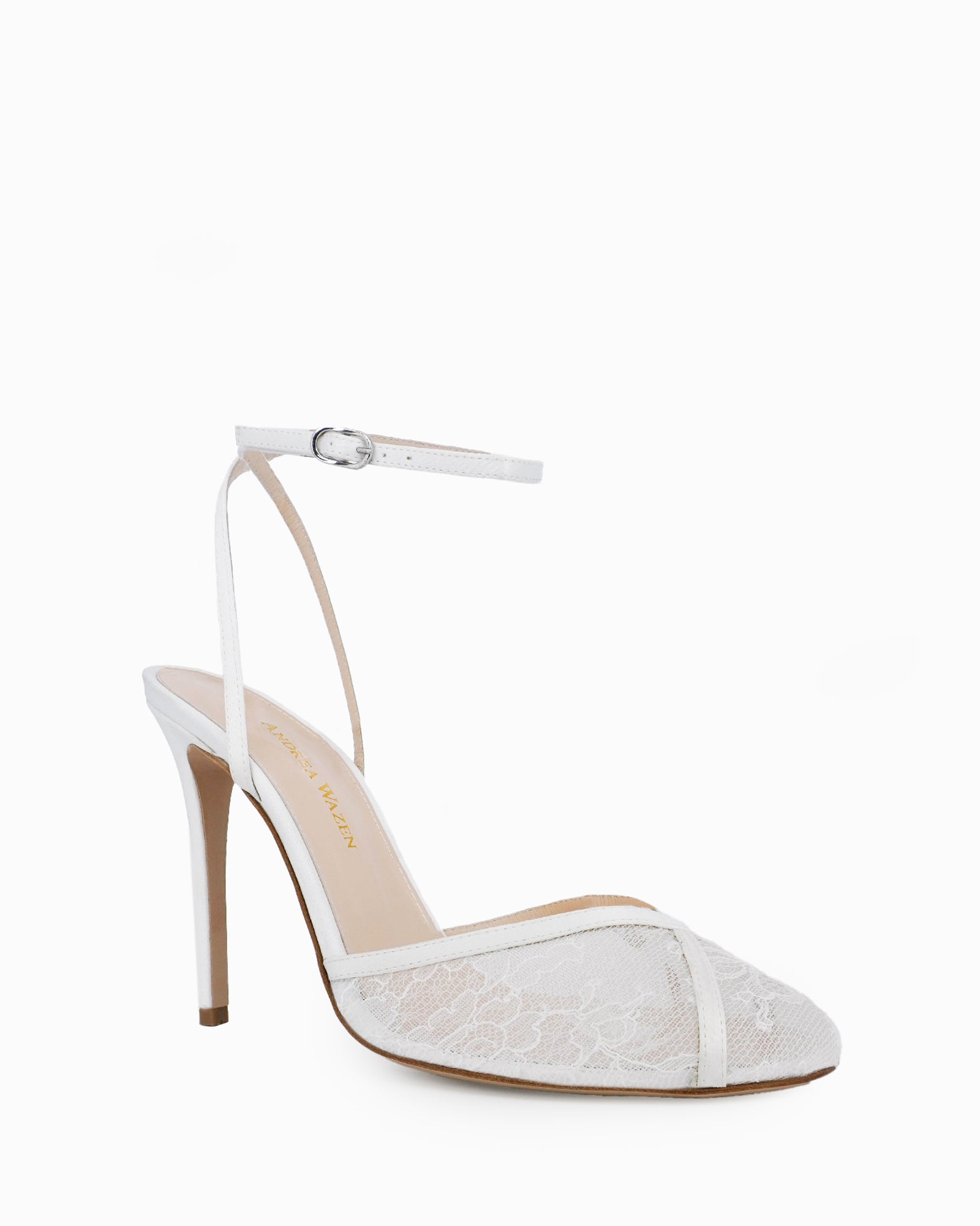 The Sienna pump by Andrea Wazen is a refined expression of timeless femininity. Designed with a sleek closed-toe silhouette, this white version is crafted from delicate lace layered over satin and finished with the brand’s signature cross design across the upper. Set on a slender 85 mm heel and secured with an elegant ankle strap, Sienna offers graceful elevation and a romantic finish, making it an ideal choice for bridal looks, special occasions, or elegant evening wear.