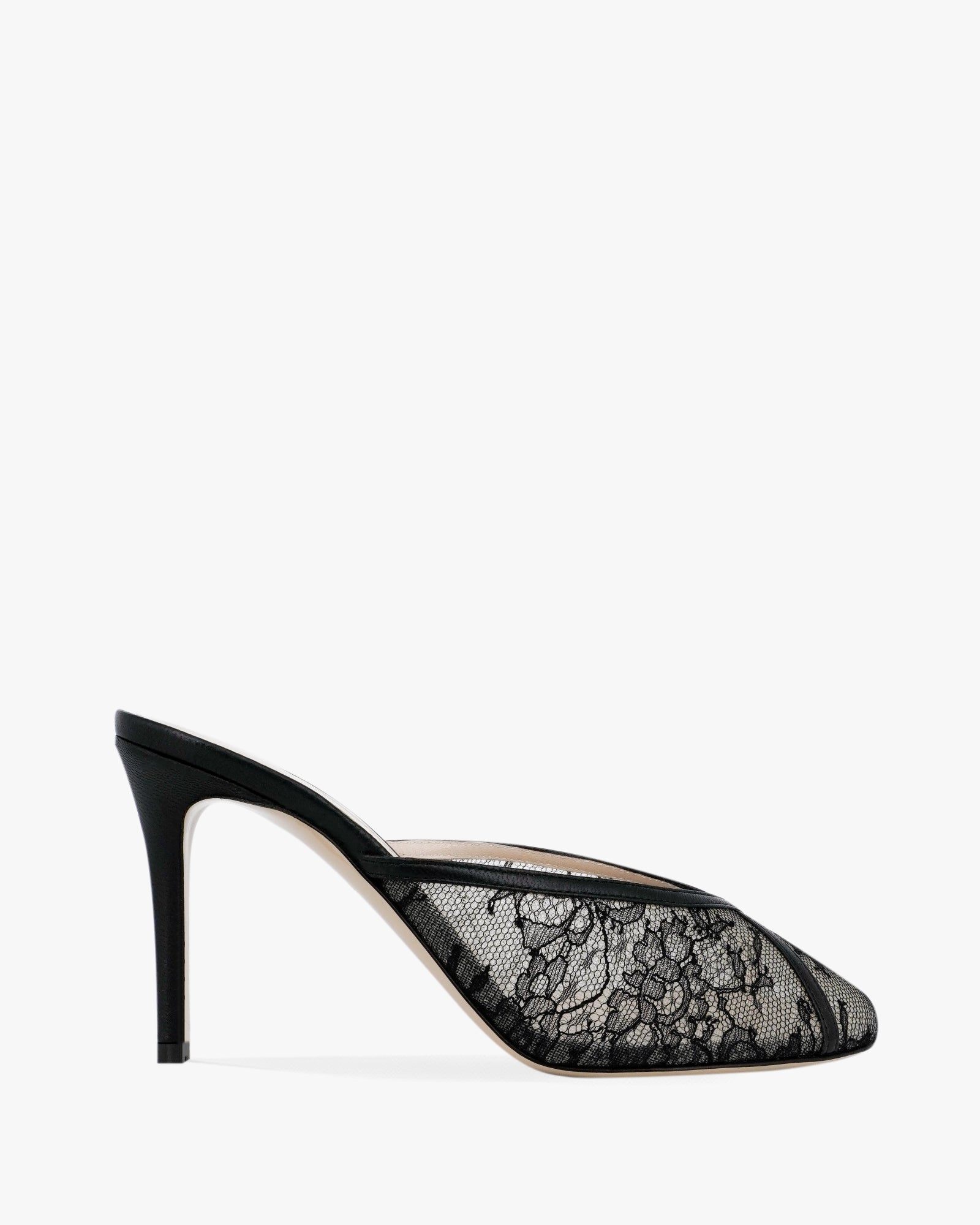 The Sienna mule by Andrea Wazen is a sophisticated blend of elegance and sensuality. Designed with a sleek, closed-toe silhouette, this style is crafted from delicate lace layered over satin and finished with the brand’s signature cross design across the upper, creating a refined play of transparency and structure. Set on a slender 85 mm heel, Sienna offers graceful elevation while remaining effortless to wear, making it a timeless choice for evenings, special occasions, or elevated day-to-night looks.